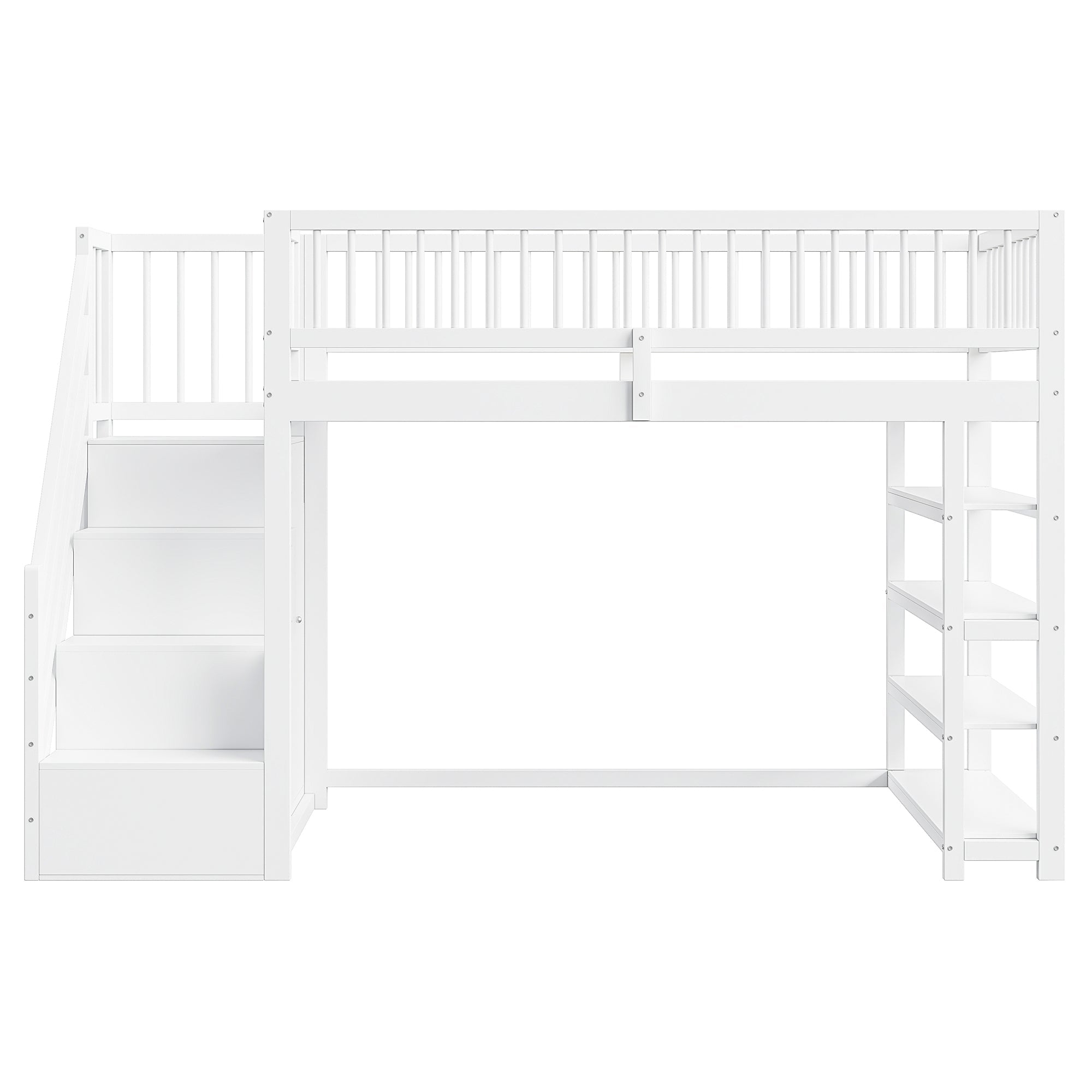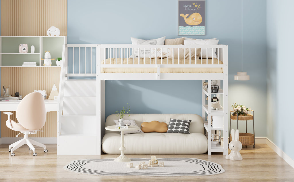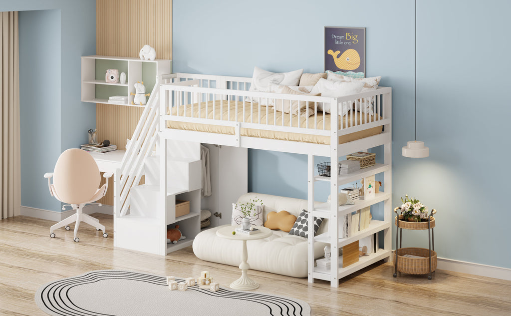 This loft bed is equipped with cabinets, storage units, and shelves that offer plenty of space for clothes, toys, books, snacks, and more, helping to keep your room organized. The safety ladder allows for easy access to the loft bed, while the solid wood construction ensures years of durability and stability. This solid wood bed offers ample space under the bed, which you can customize or use as a play area for your child. This versatile product maximizes storage and play space in the bedroom and is ideal for households seeking practical and space-saving solutions.