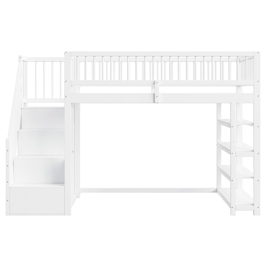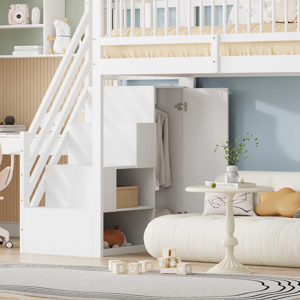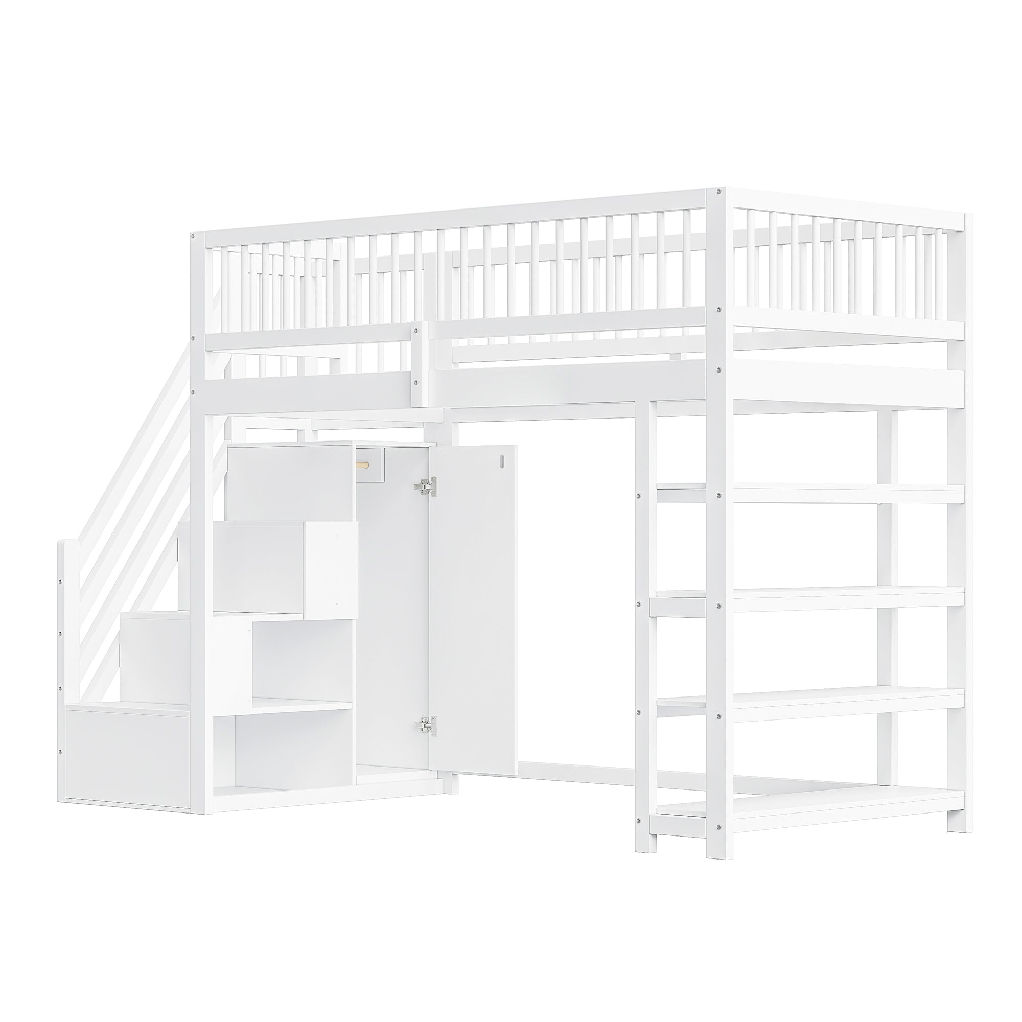 Loft Bed, 90x200 Multifunctional with Wardrobe, Shelves, Ladder, Solid Wood, White