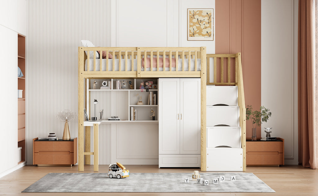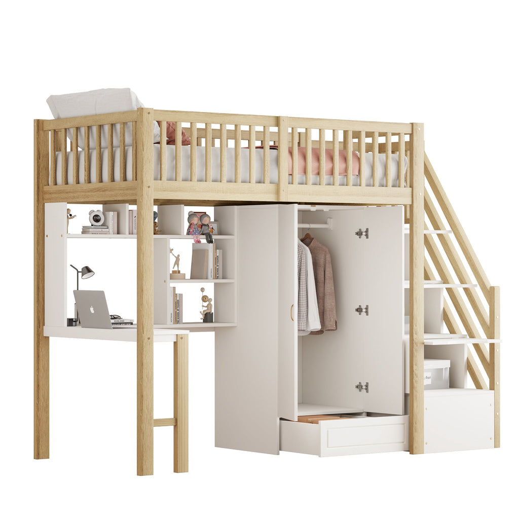 Loft Bed, 90x200 Wardrobe, Shelf, Table, Storage Stairs, Wooden