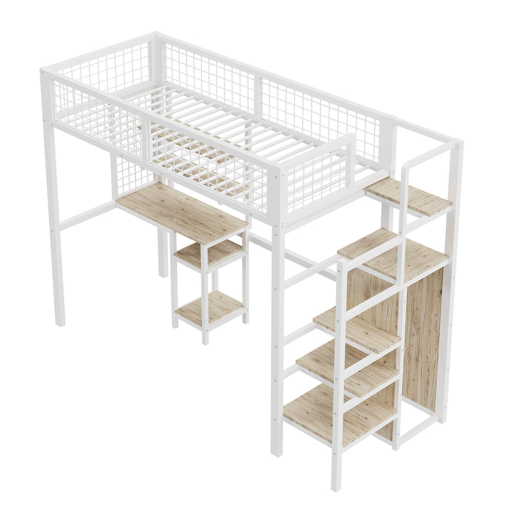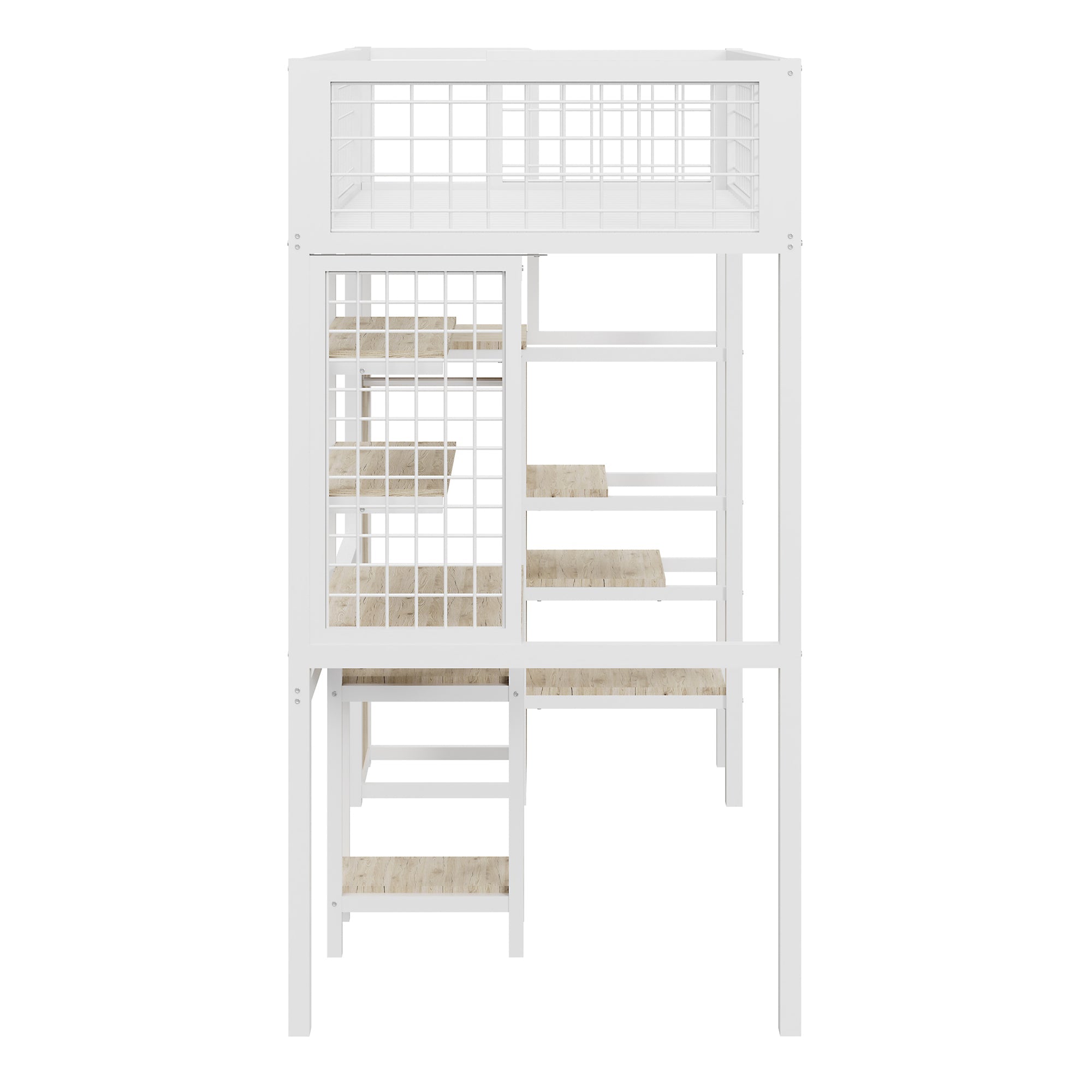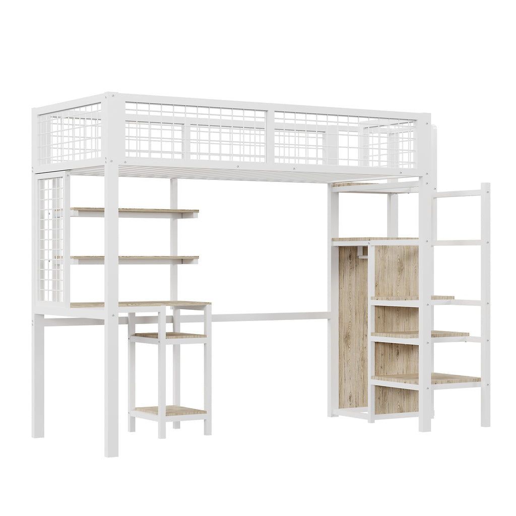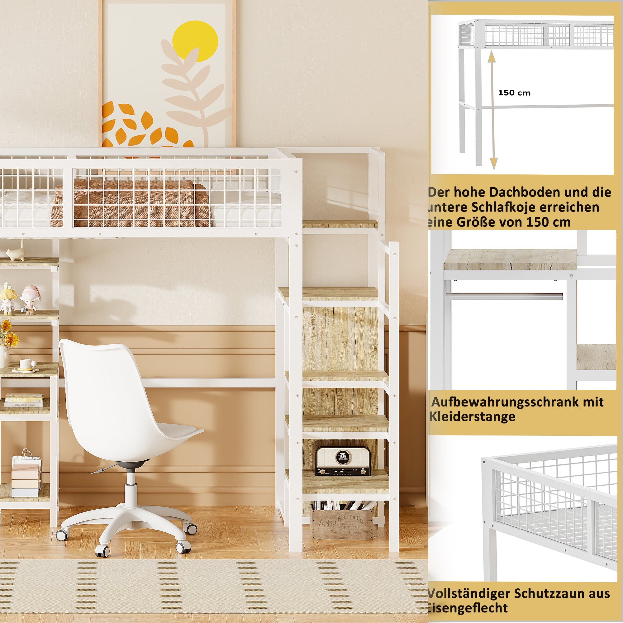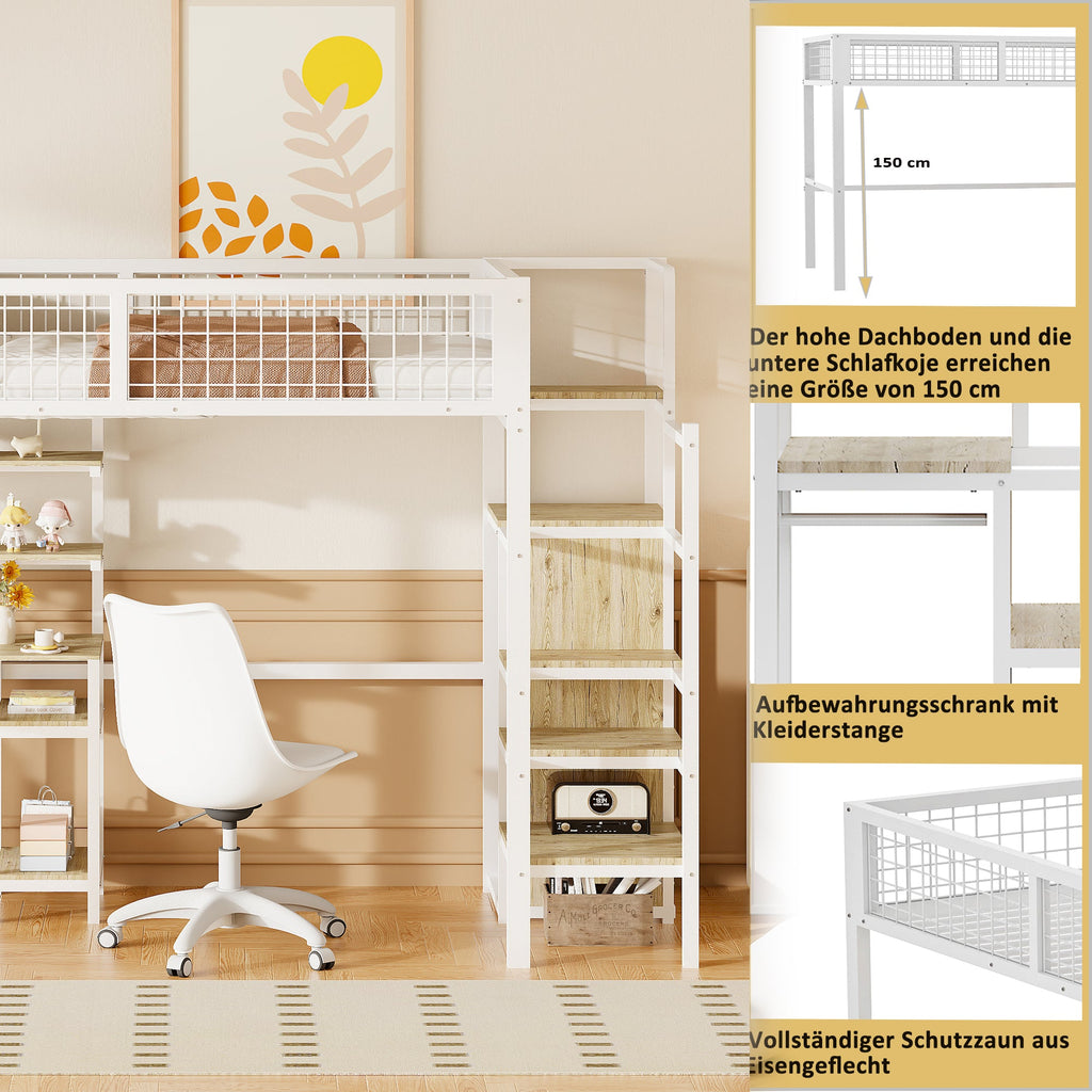 Loft Bed, 90x200 with Safety Ladder, Wardrobe & Computer Table, White