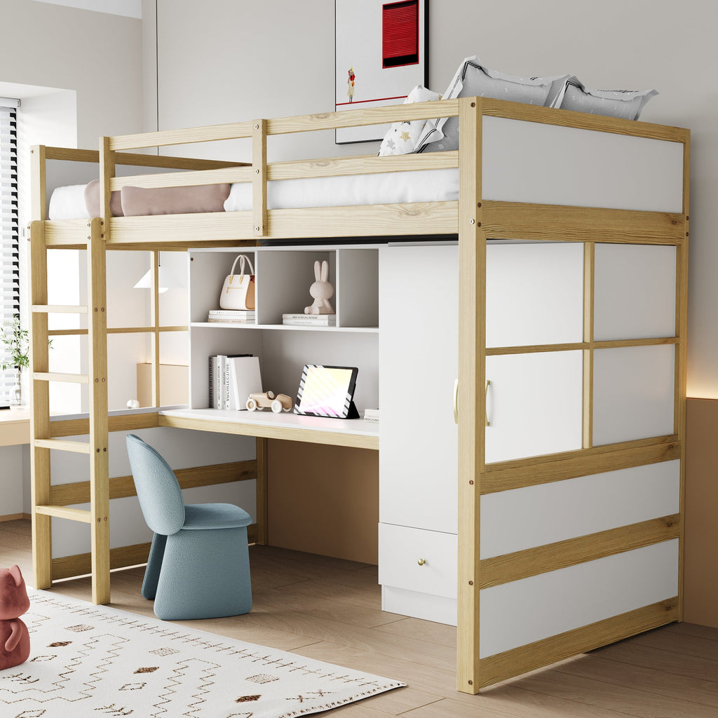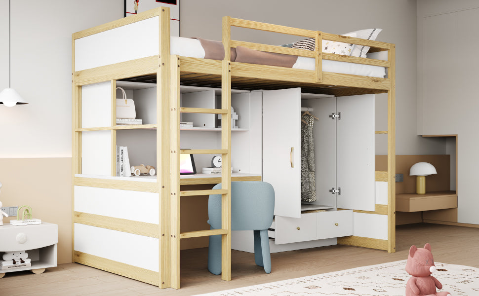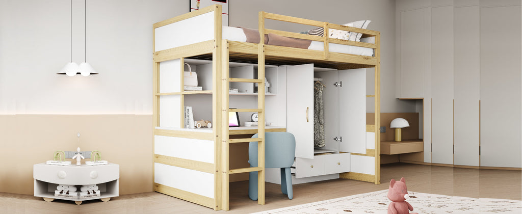 Loft Bed, 90x200cm with Ladder, Desk, Wardrobe & Drawers, Wood Color