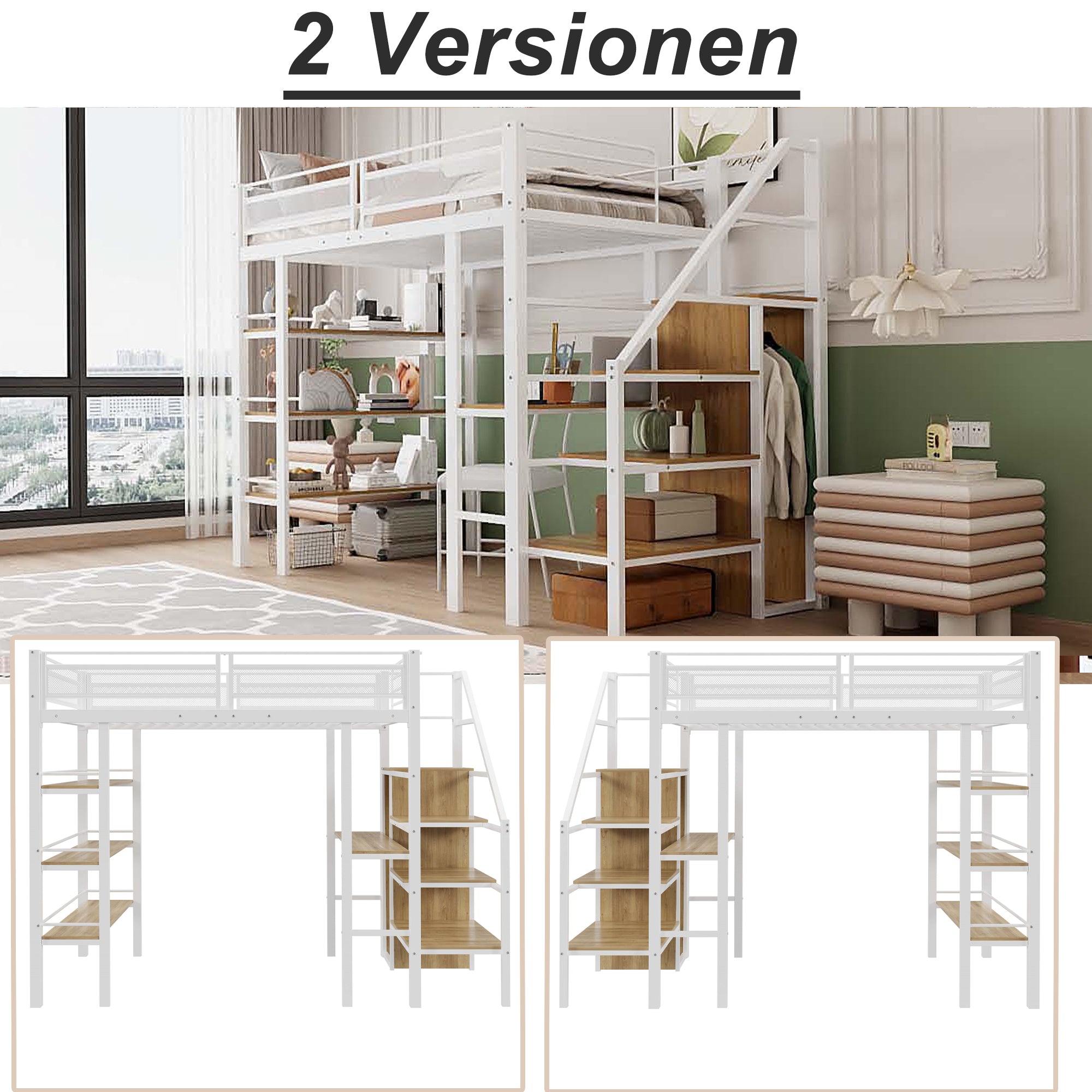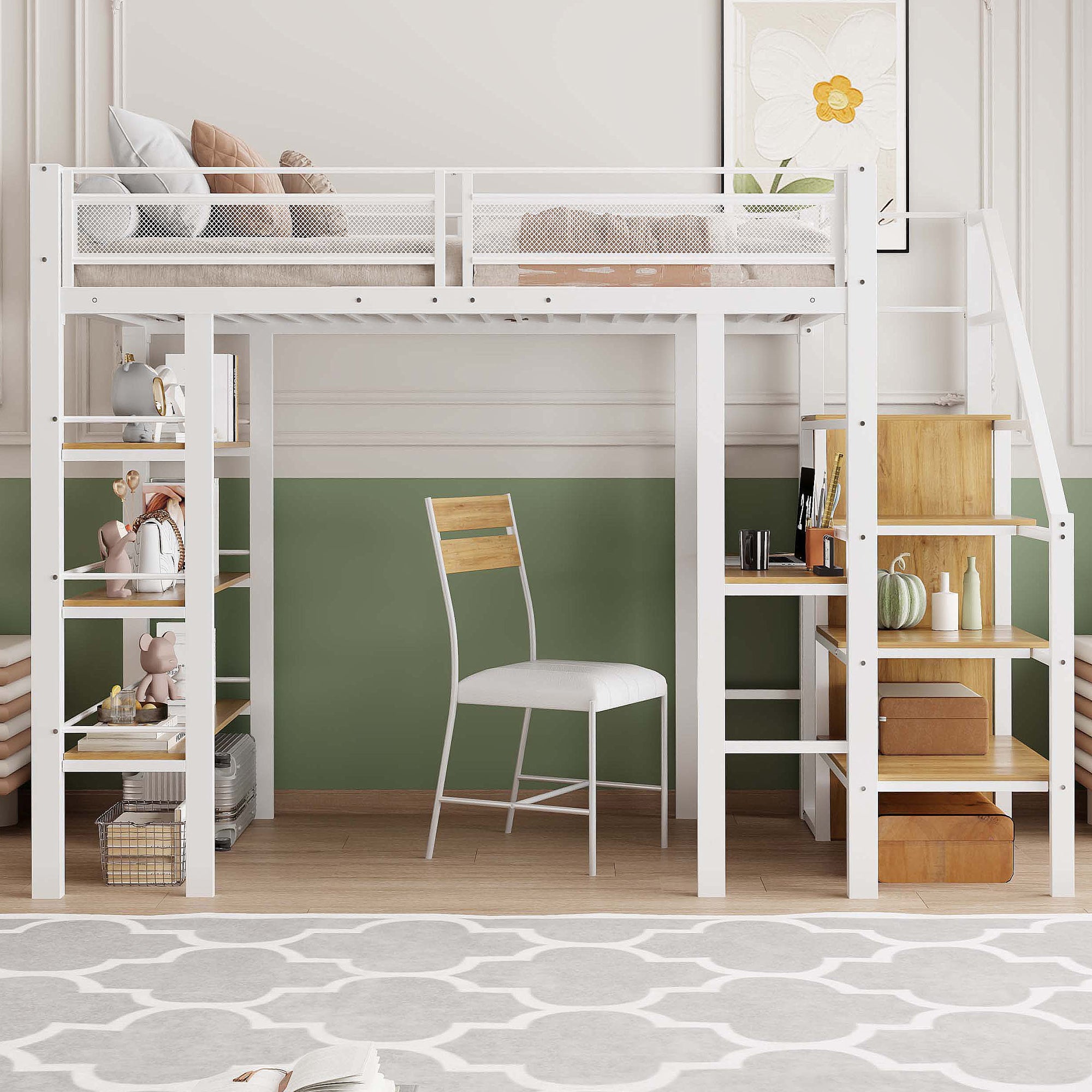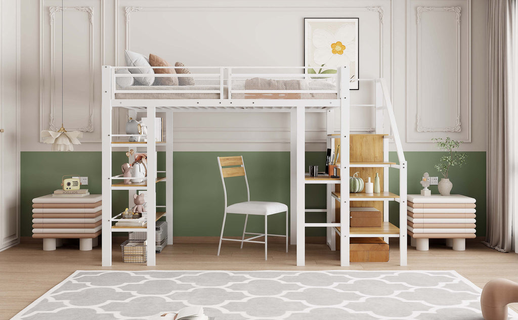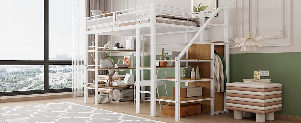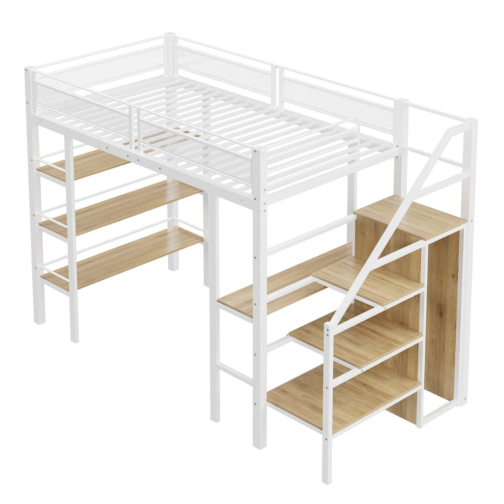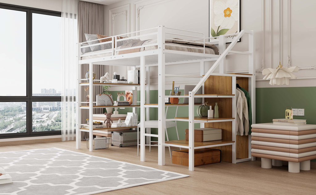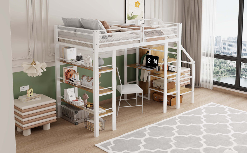Loft Bed, 90x200cm with Storage Shelf, Desk, Wardrobe, Safety Steps, Iron, White