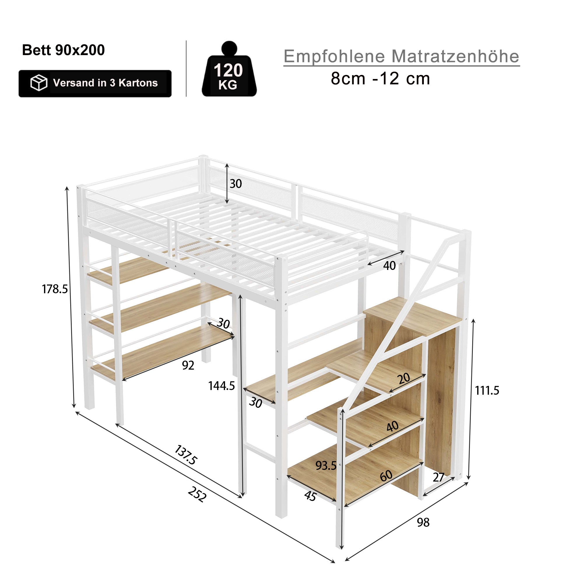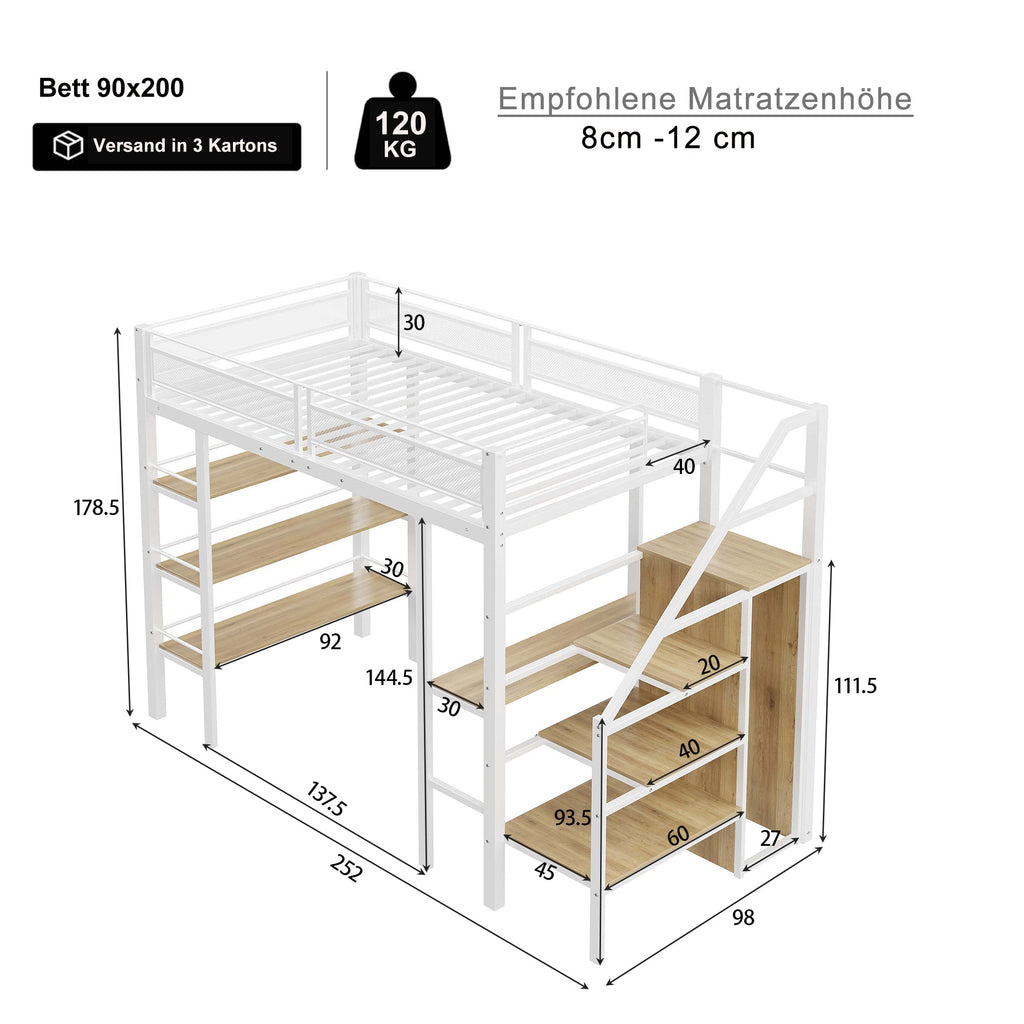 The 90 x 200 cm high bed frame integrates multiple functions, perfectly combining design and utility. Crafted from sturdy iron, this bed frame boasts a stylish and attractive white finish. It features three levels with storage compartments, a desk, and a wardrobe, offering ample storage space, a dedicated work area, and an office area.