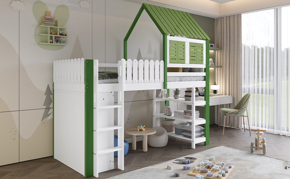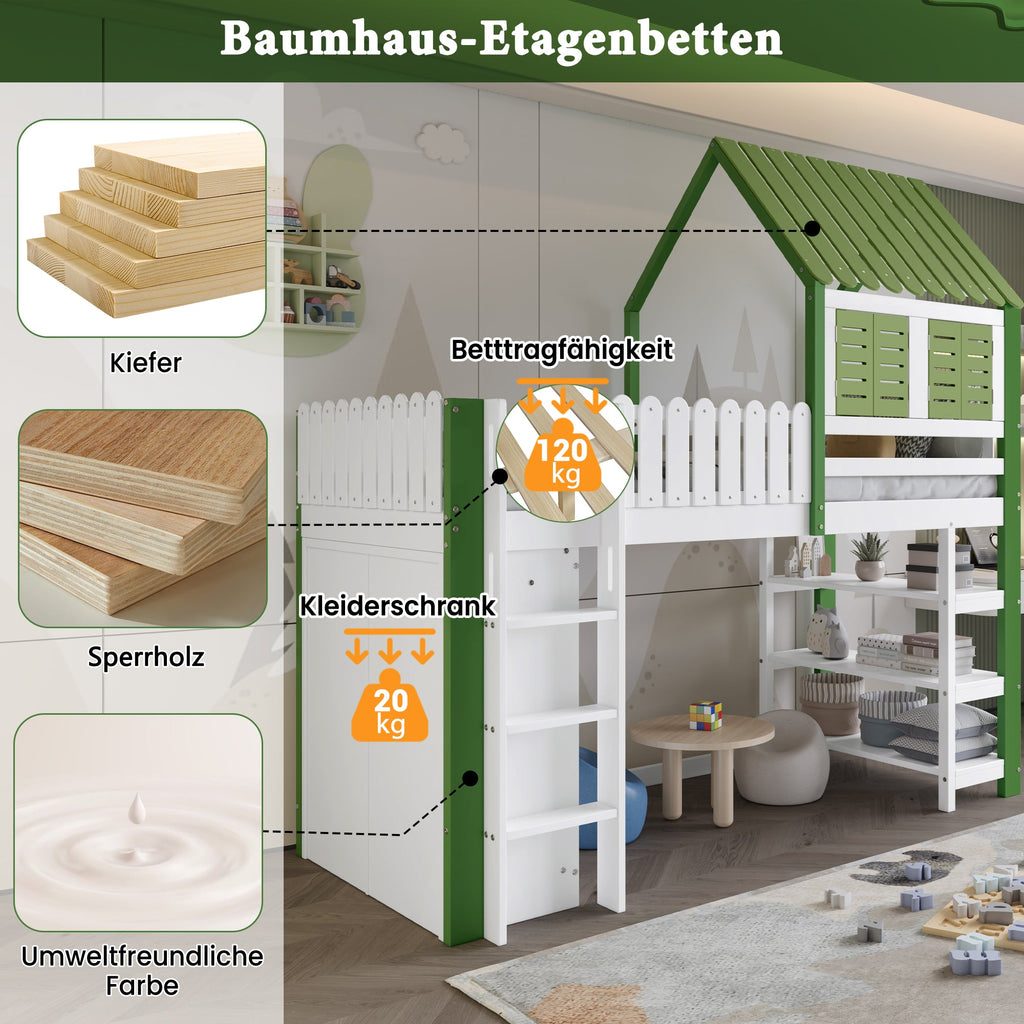 Loft Bed, Children's with Wardrobe & Ladder, Pine+MDF+Plywood, White+Green