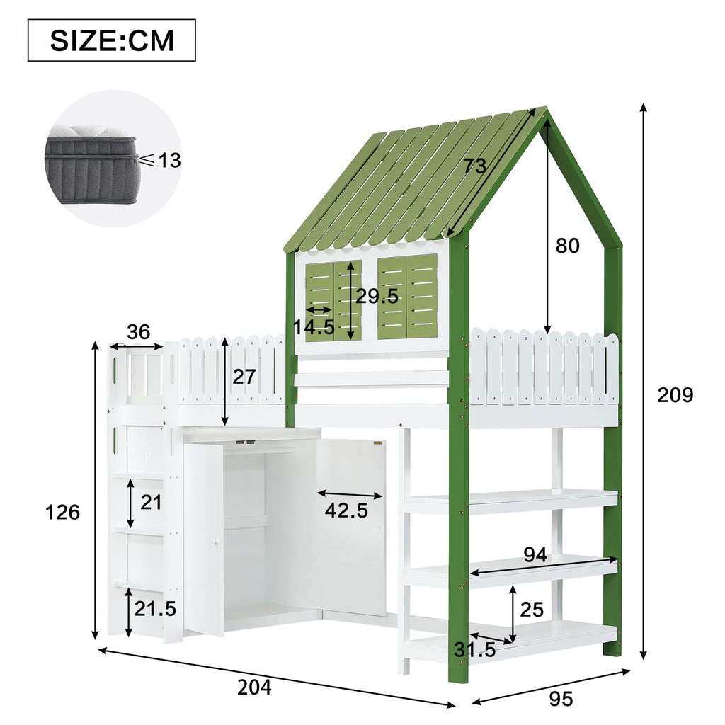 This creative children's loft bed features a roof and two windows, offering your child a dreamy place to sleep, with a sleeping area above and storage and play area below. Wardrobes and open shelves under the loft bed add functionality and provide space for storing clothes, toys, and other everyday items. The recommended mattress size for this loft bed is 90x200 cm, with a recommended mattress thickness of 13 cm.