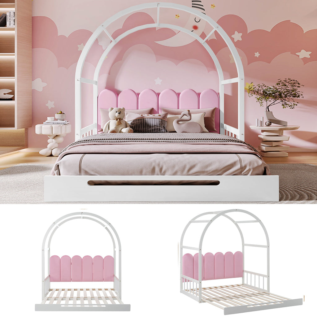 Expandable Vaulted Loft Bed, Sliding Bed, Kids Bed, Daybed, White + Pink, 140x100cm & 140x200cm
