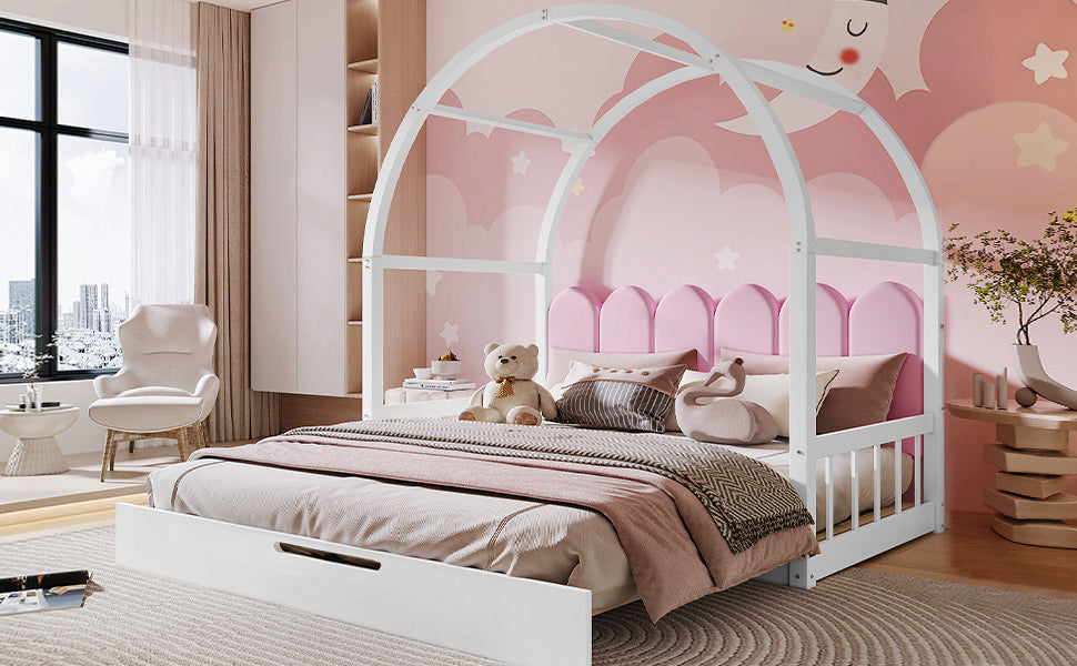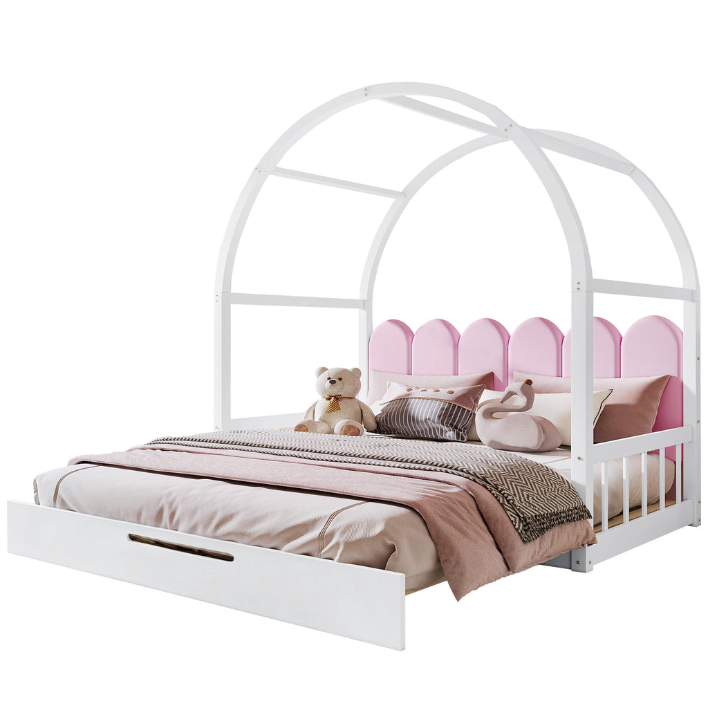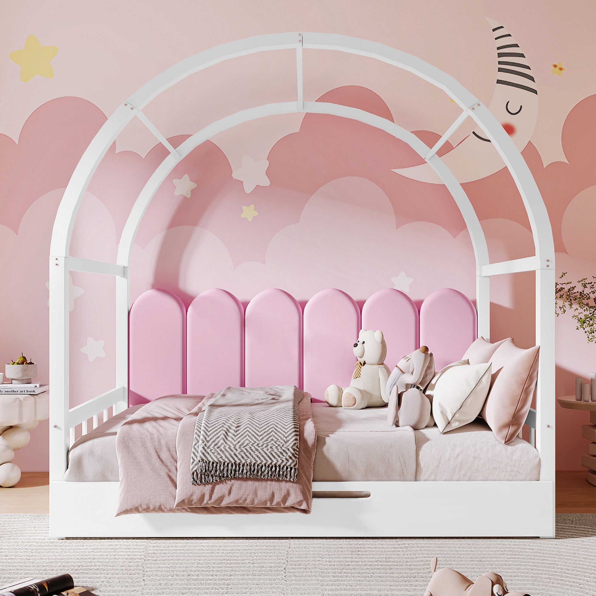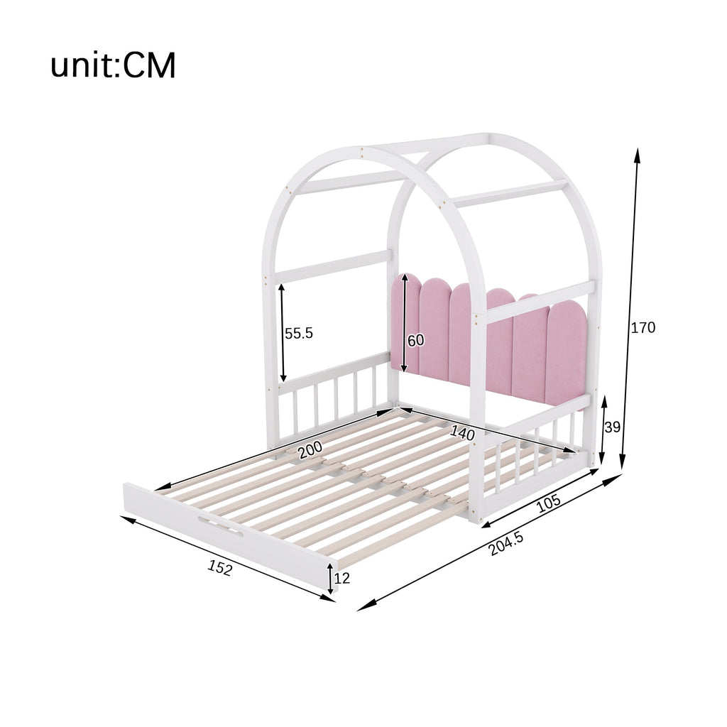Loft Bed, Expandable Vaulted Trundle Daybed with Velvet Cushions, Pinewood Frame, White & Pink