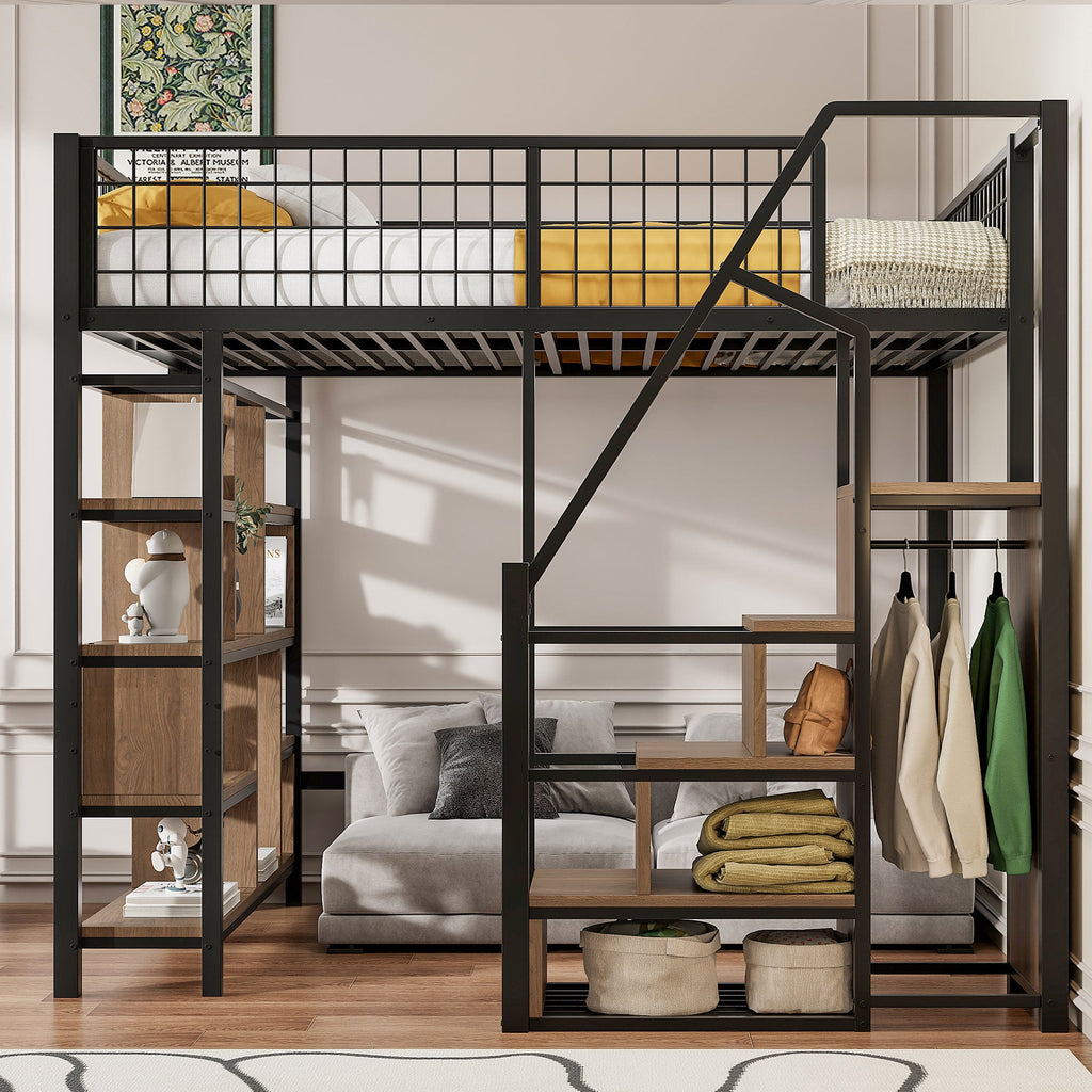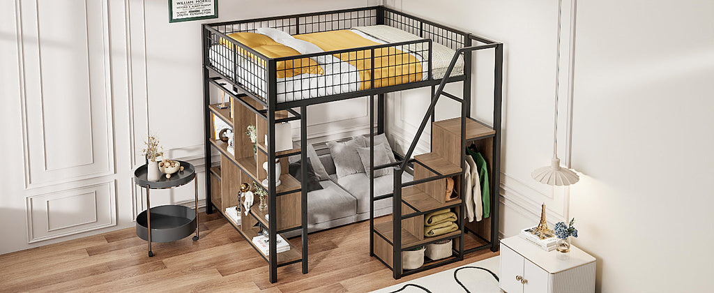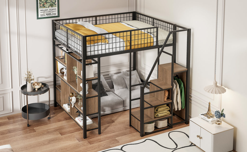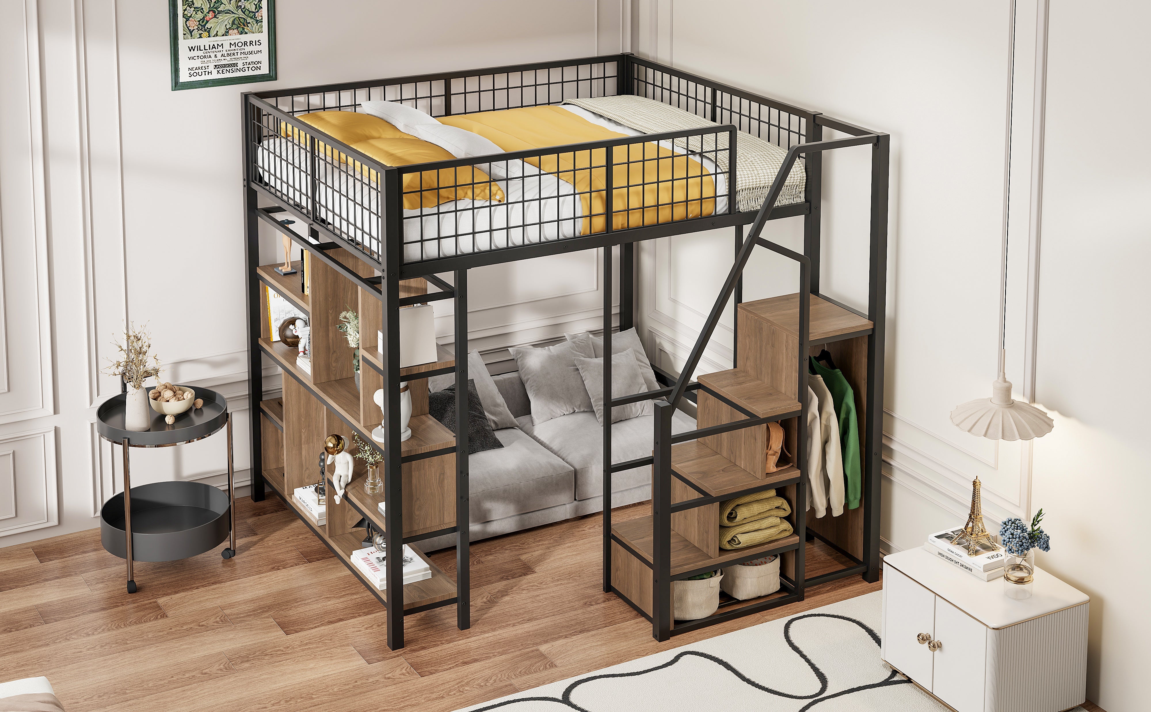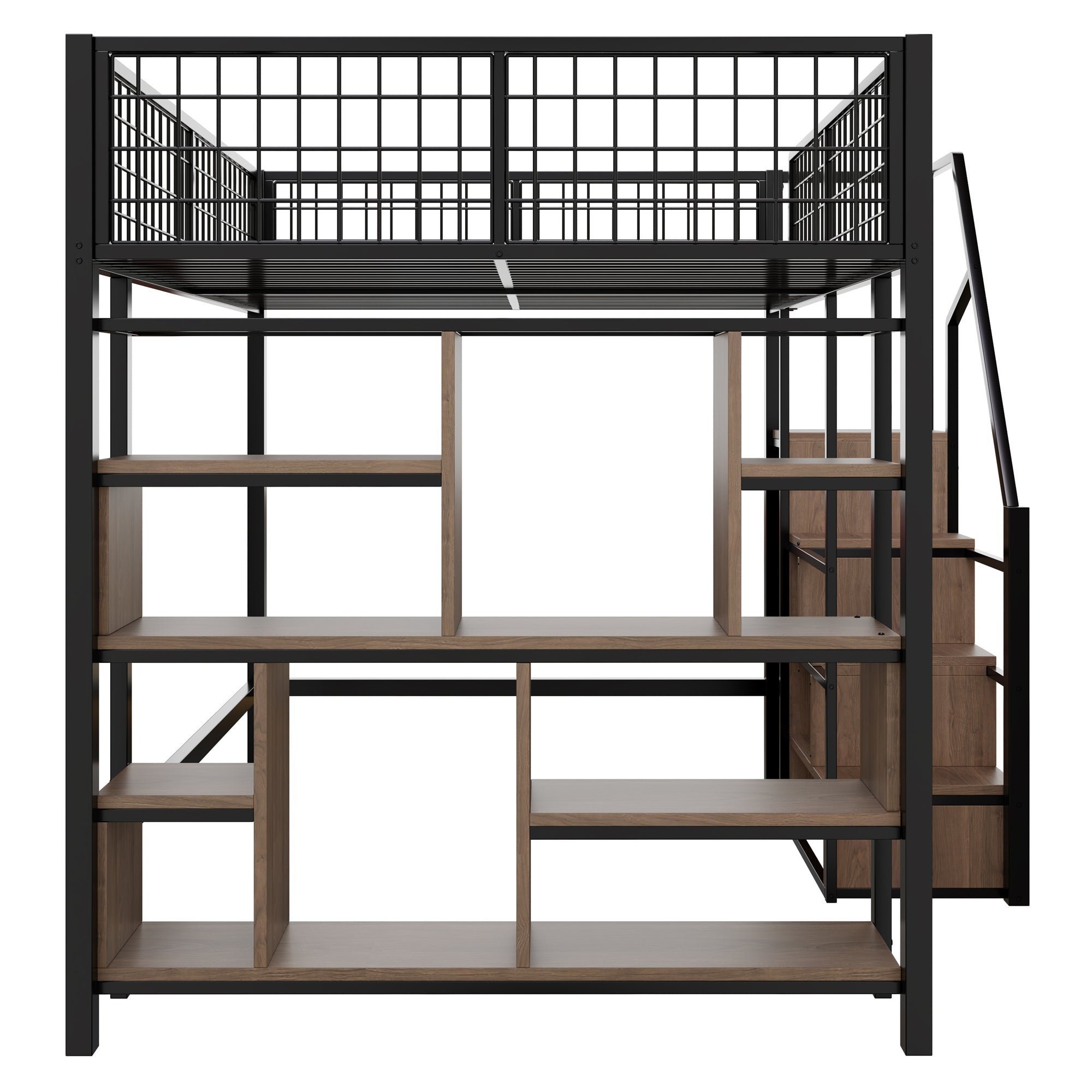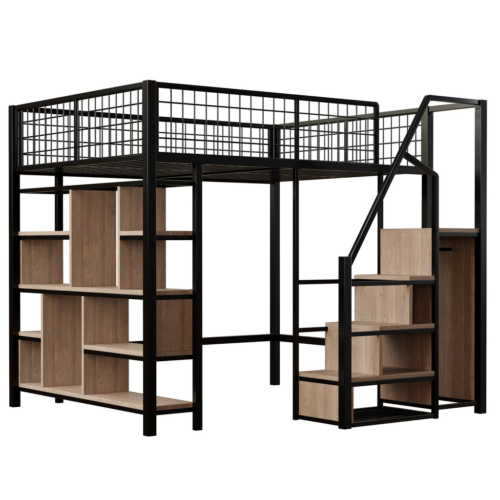 Loft Bed, Multifunctional with Storage & Stairs, 140x200 cm, Metal Black