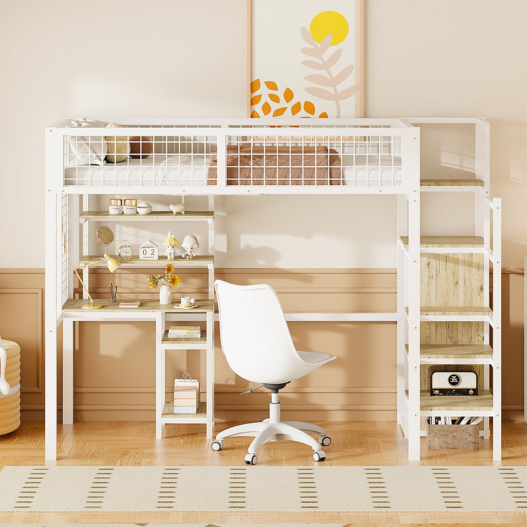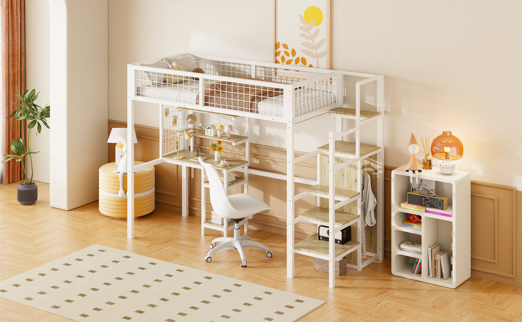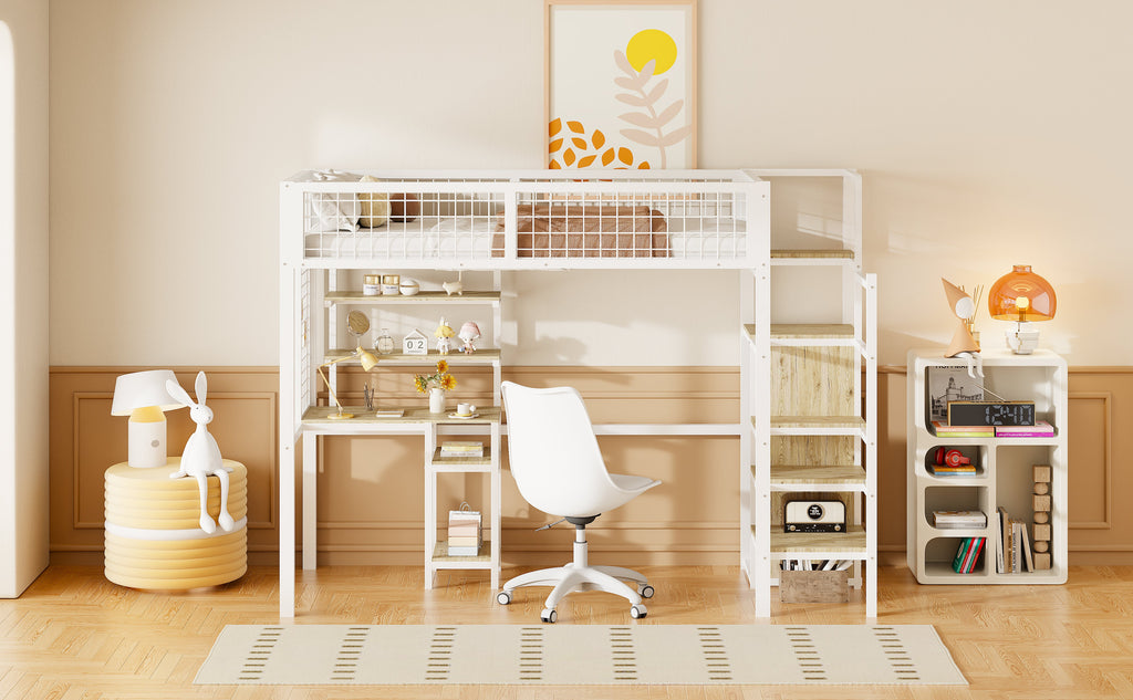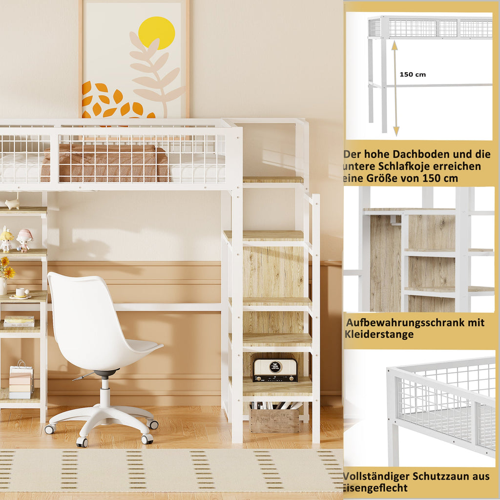 Loft Bed with Safety Ladder, Wardrobe & Computer Table, White
