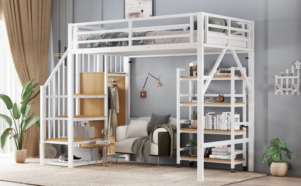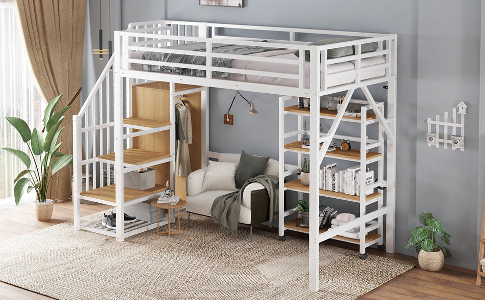 Loft Bed with Shelf, Wardrobe, Safety Railing, Iron + MDF, White/Natural 90x200cm