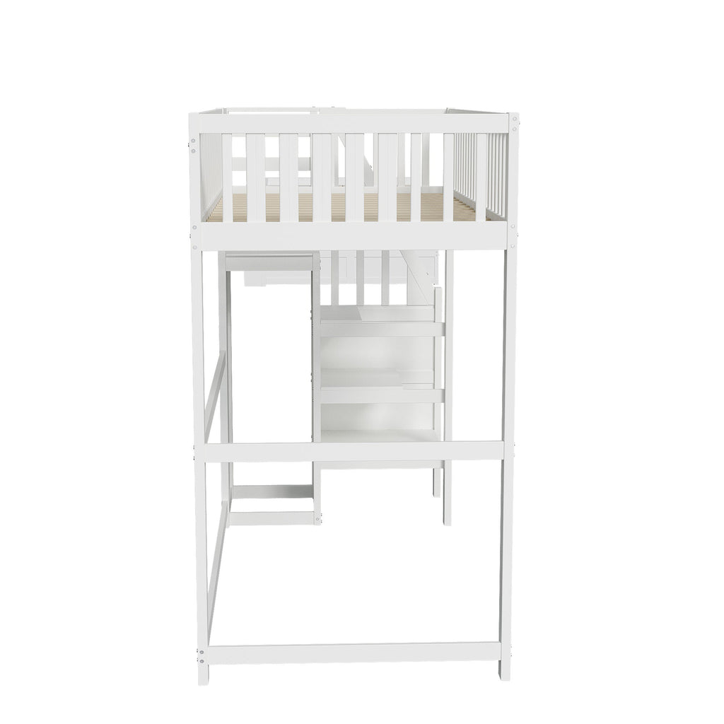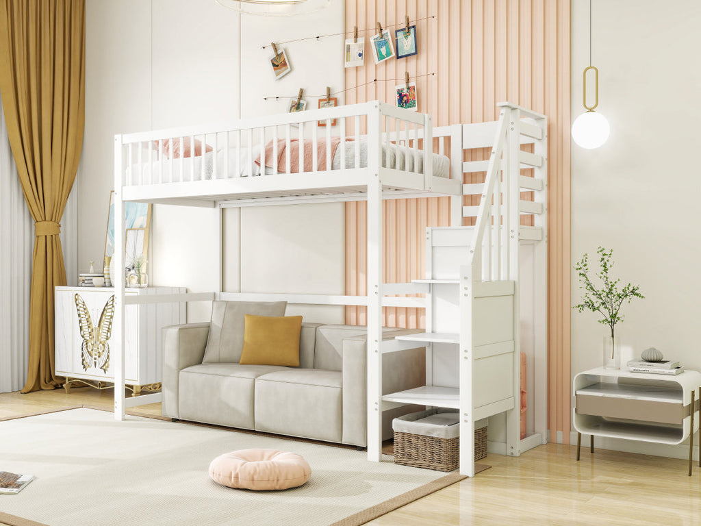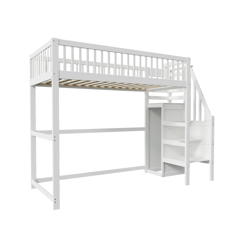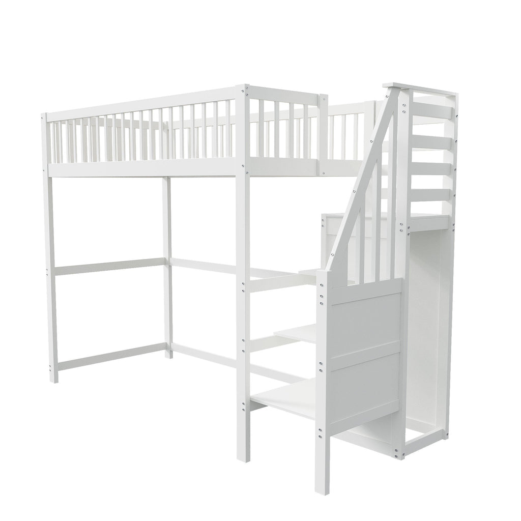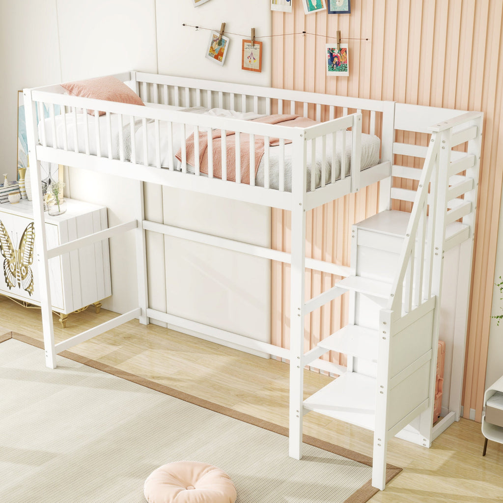 Loft Bed with Stairs & Storage Shelf, Wooden White