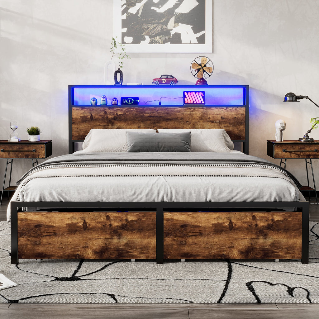 Metal Bed, 4ft6 Double with LED Strip, 2 Drawers & USB Ports, Black+Walnut Wrought Iron
