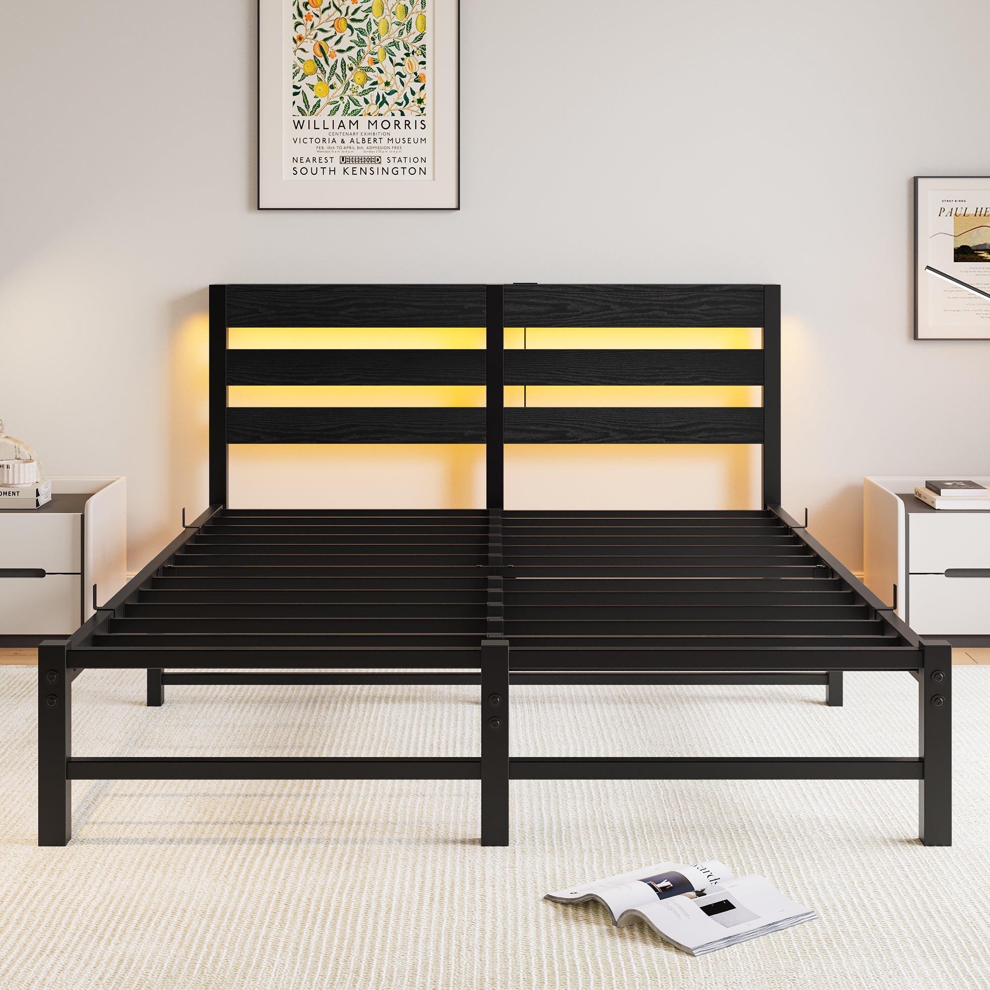Metal Bed Frame 140x200, LED Lights, USB Charging, Storage - Metal