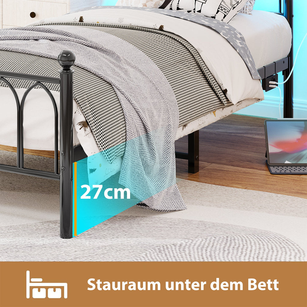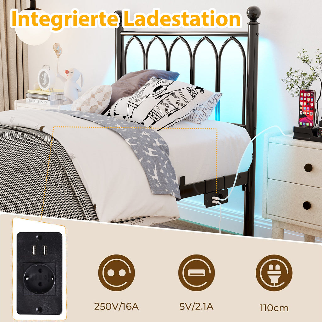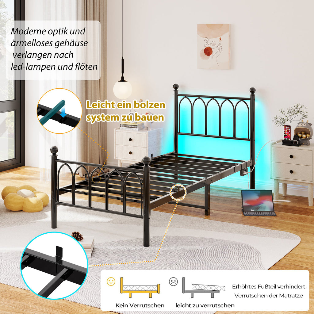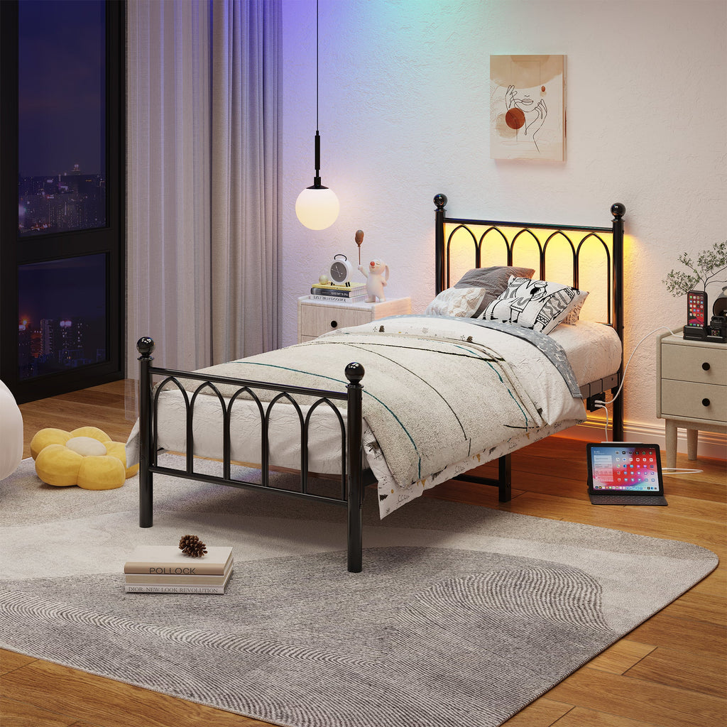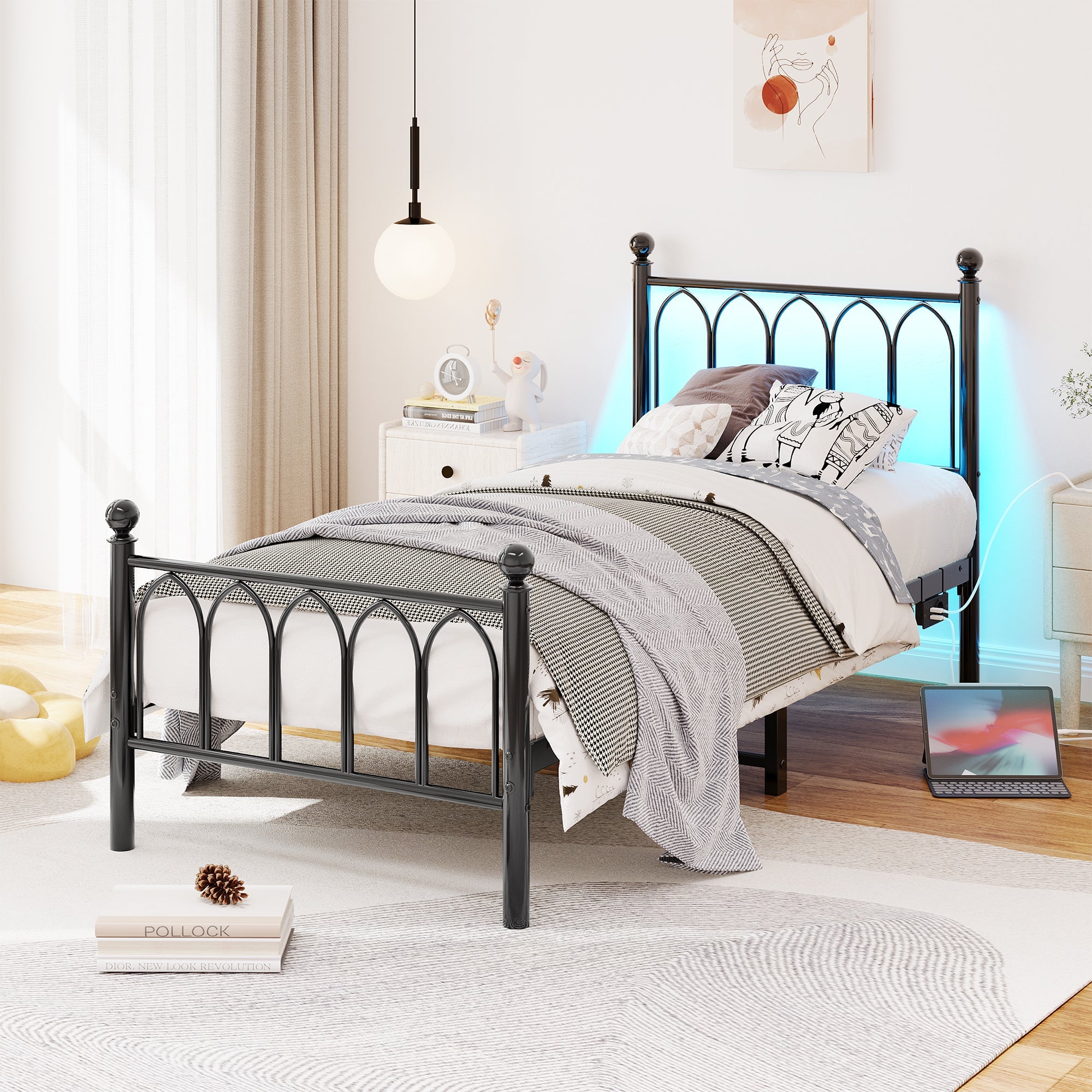 Metal Bed Frame with USB, LED, Vintage Headboard and Footboard, Black
