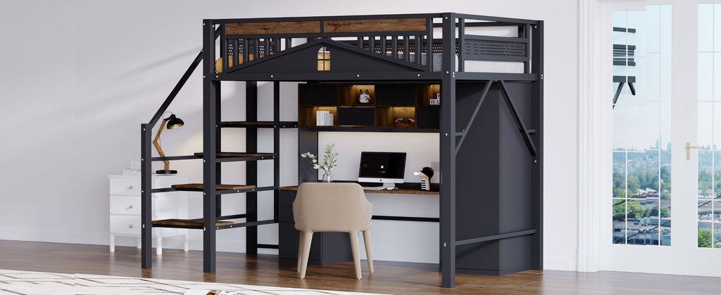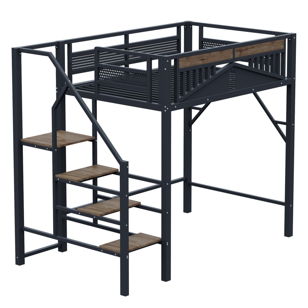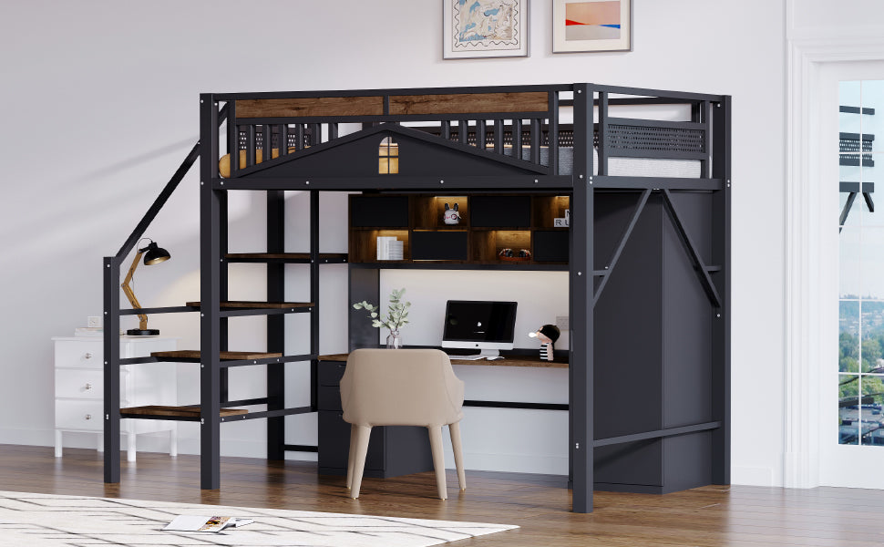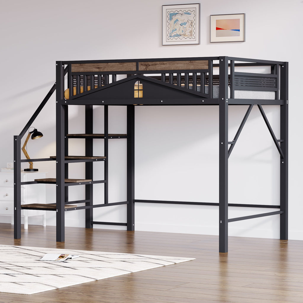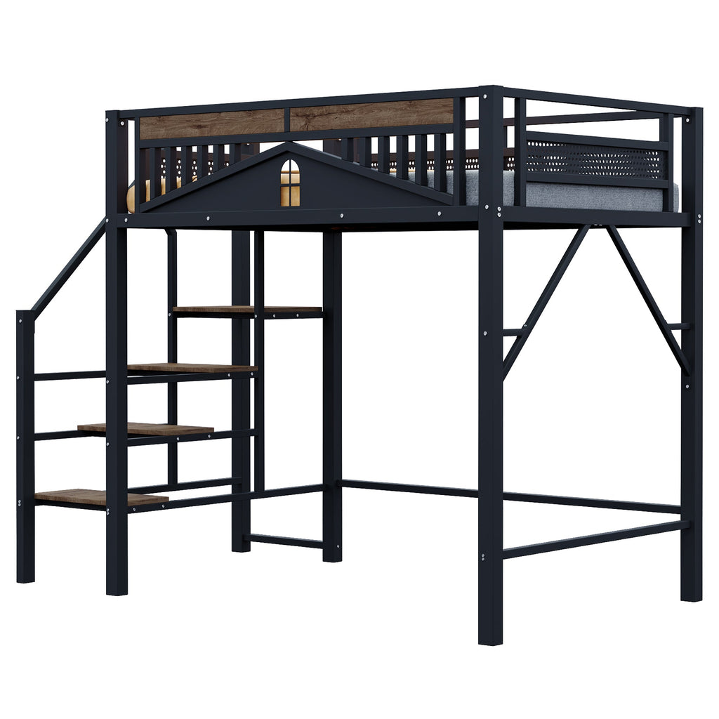 Metal Loft Bed, 140x200cm, Window Design, Safety Ladder, Storage, Black