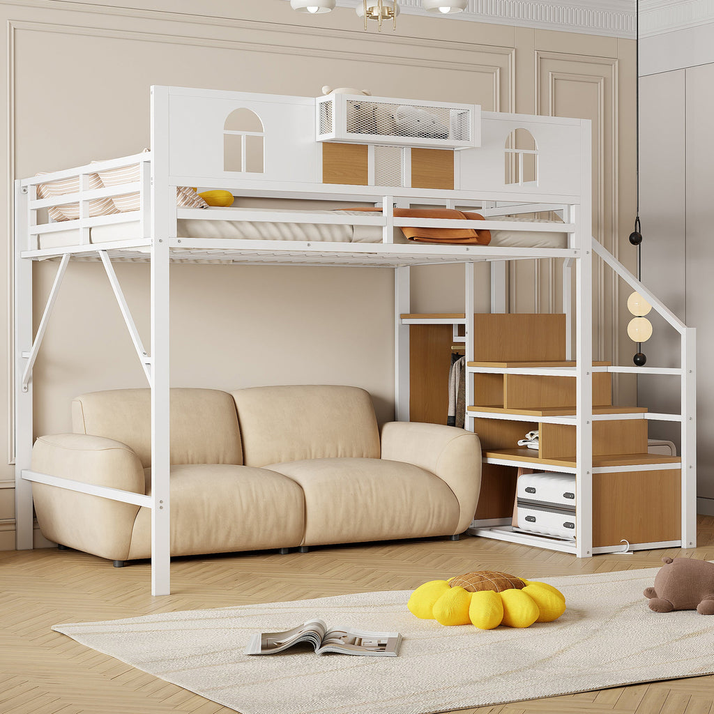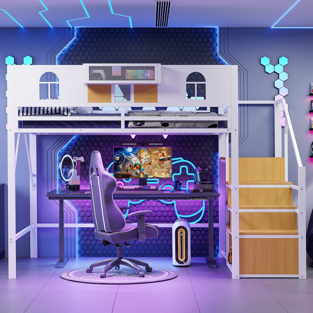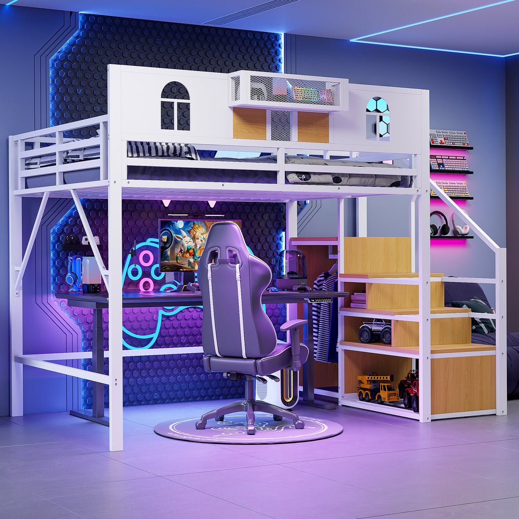 Metal Loft Bed 140x200cm with Storage Ladder & Desk, White Metal Frame