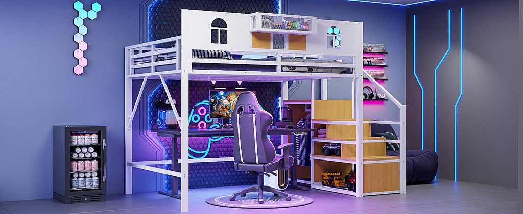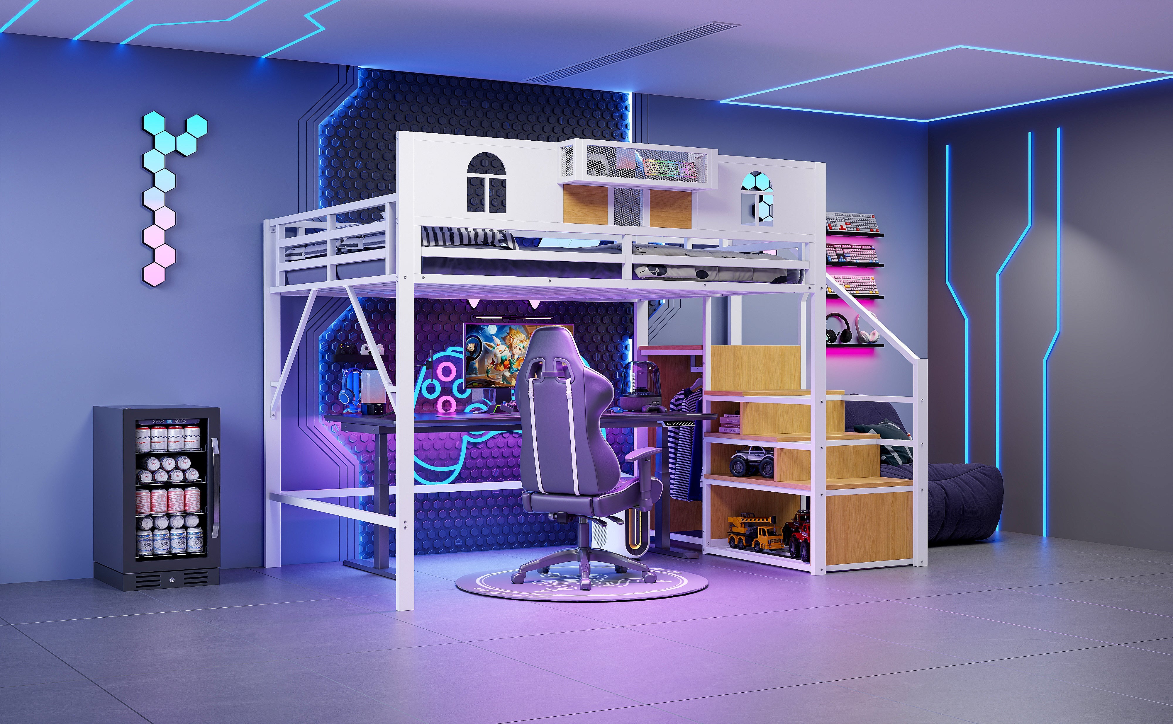 This loft bed features a sturdy metal frame that offers high load-bearing capacity and durability. It is available in white or black, and its stylish, modern design complements a variety of bedroom styles.