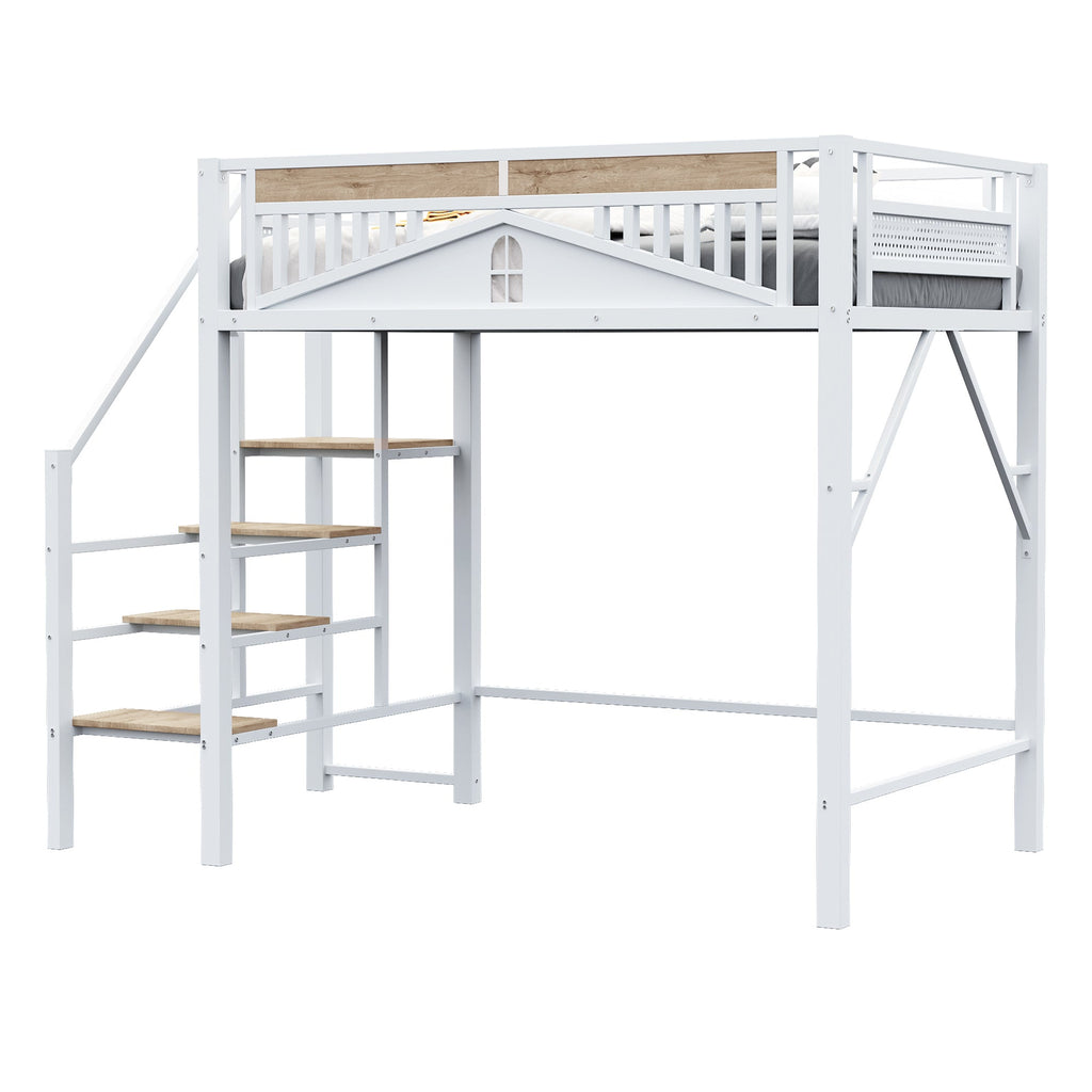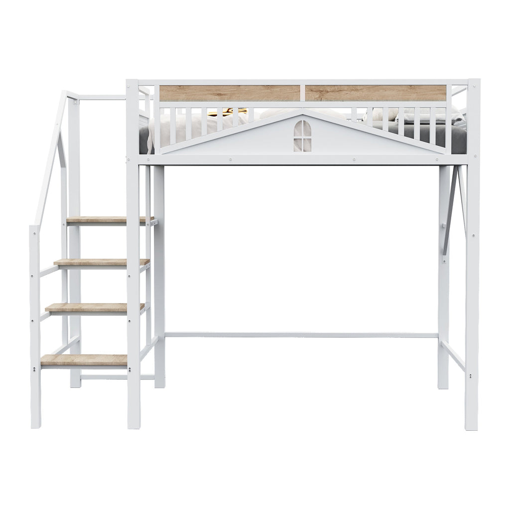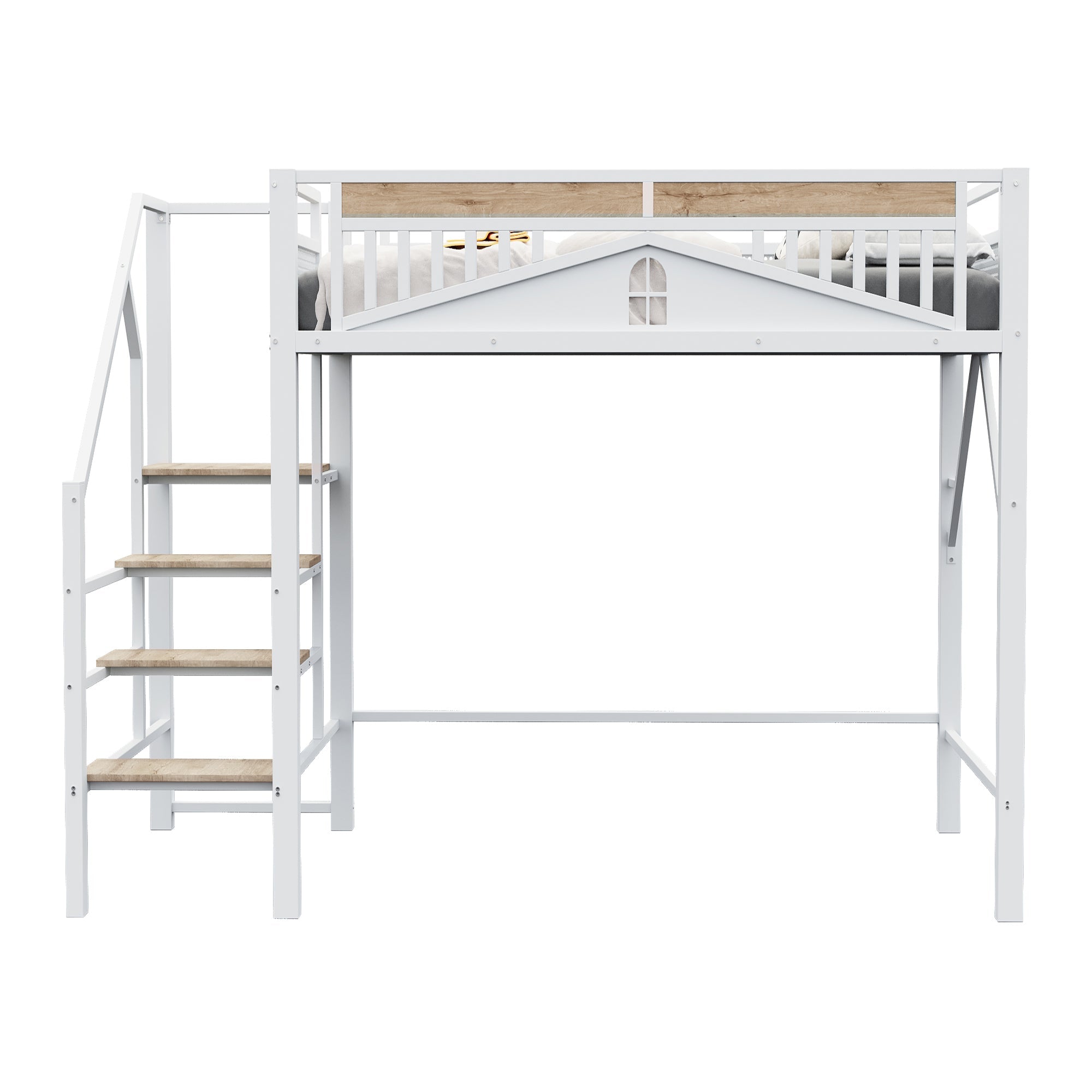 Metal Loft Bed, 140x200cm with Window Design, Safety Ladder, Storage, White