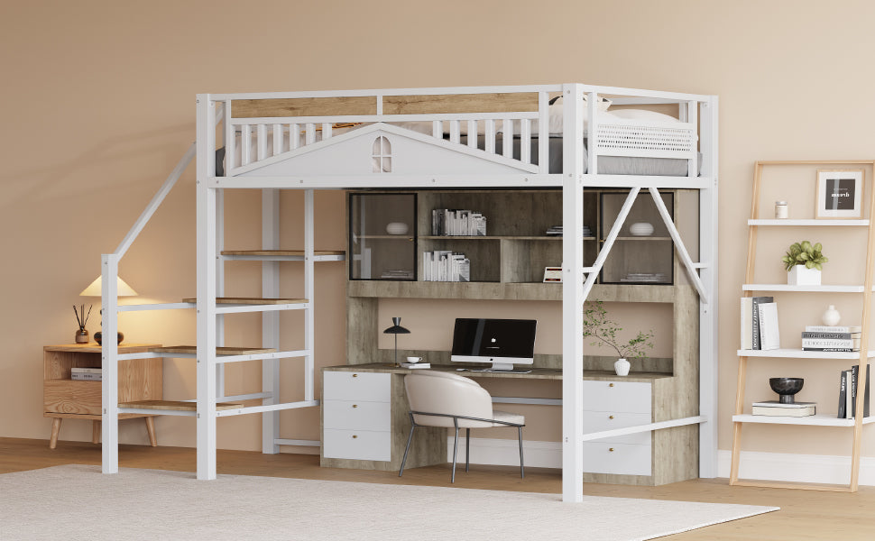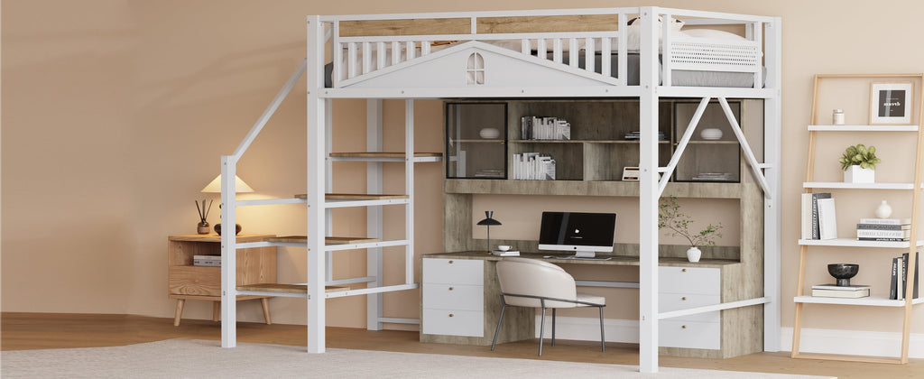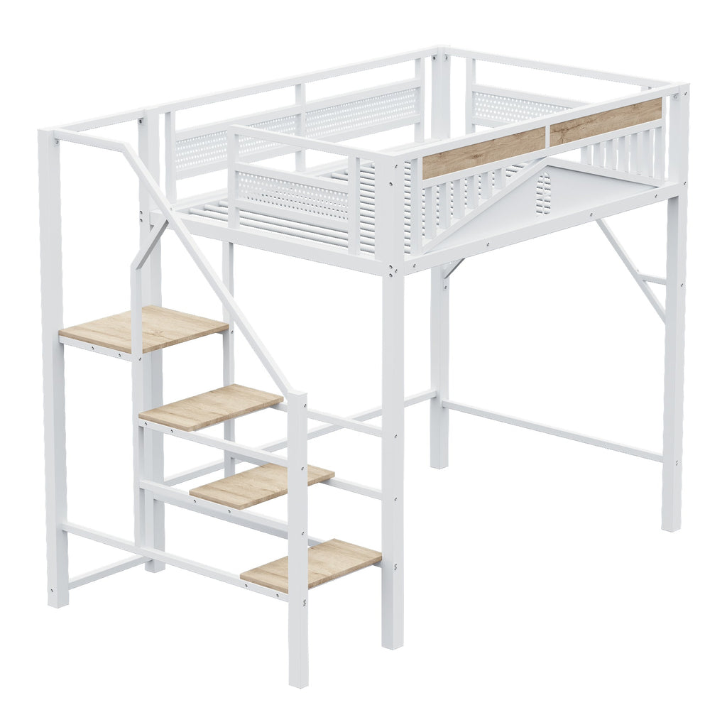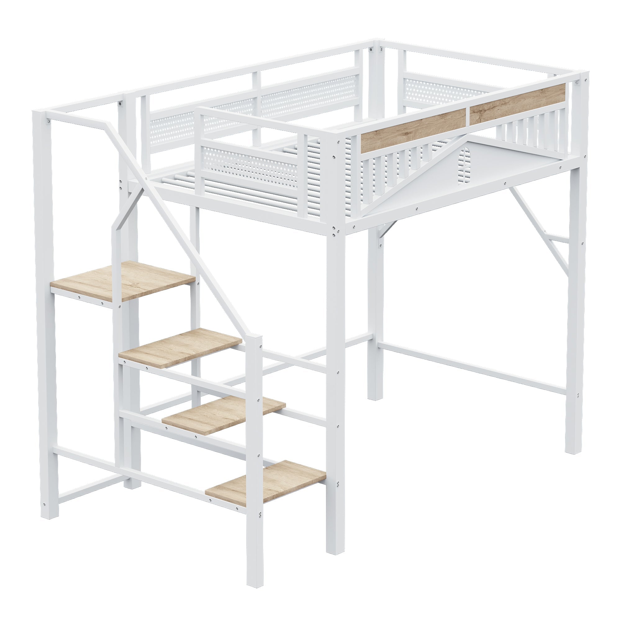 Metal Loft Bed, 140x200cm with Window Design, Safety Ladder, Storage, White