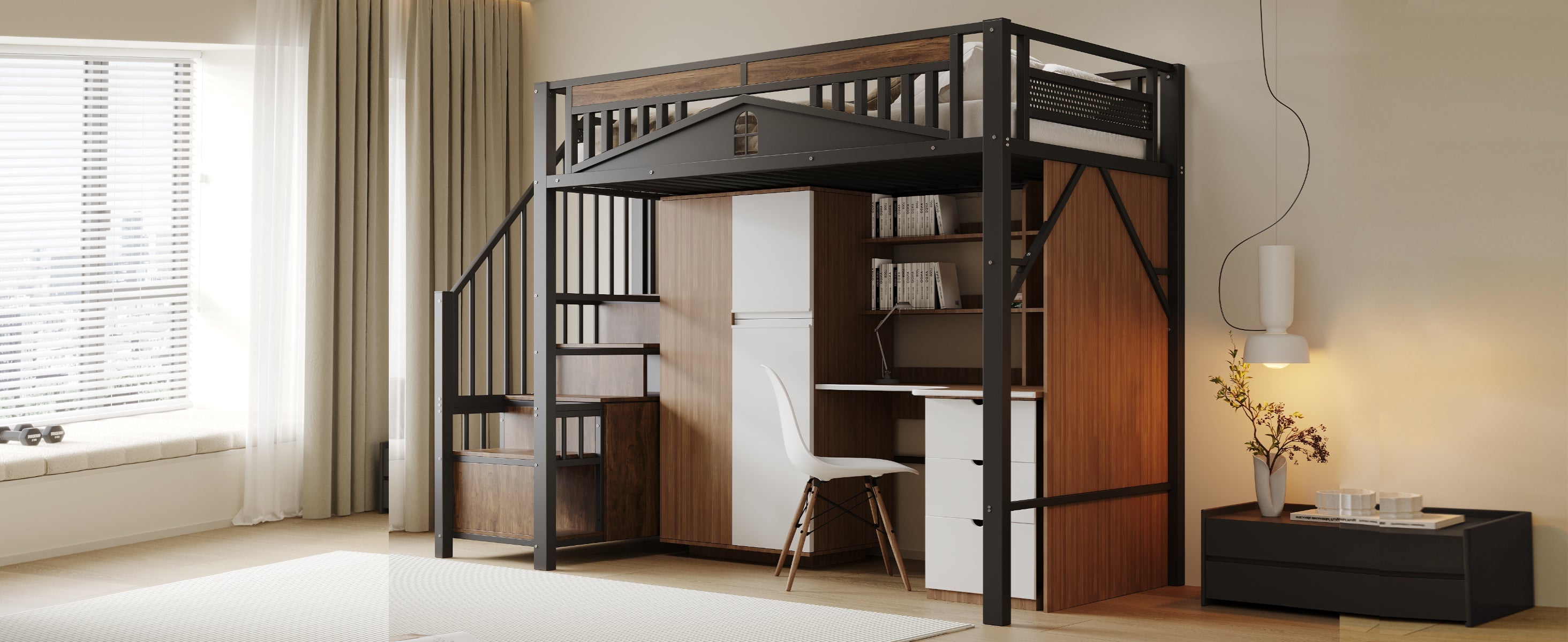 This stylish 90 x 200 cm metal loft bed combines safety, functionality, and aesthetics. The bed features a sturdy metal frame and is available in sleek white or black. Its safety rail, combined with wooden rungs and a unique window design, adds charm and security to your child's sleeping space.
