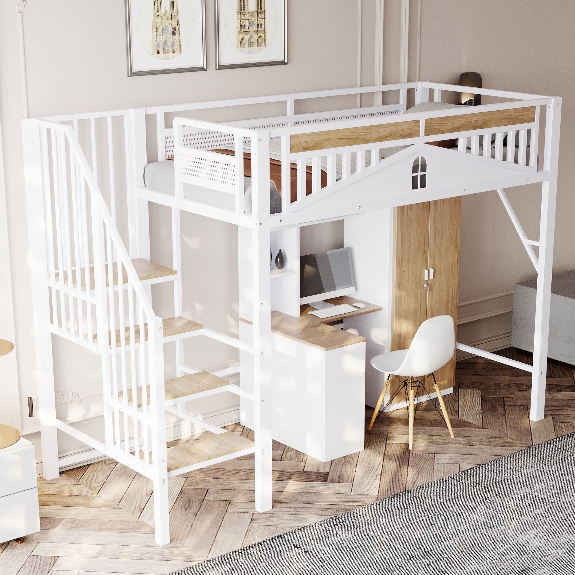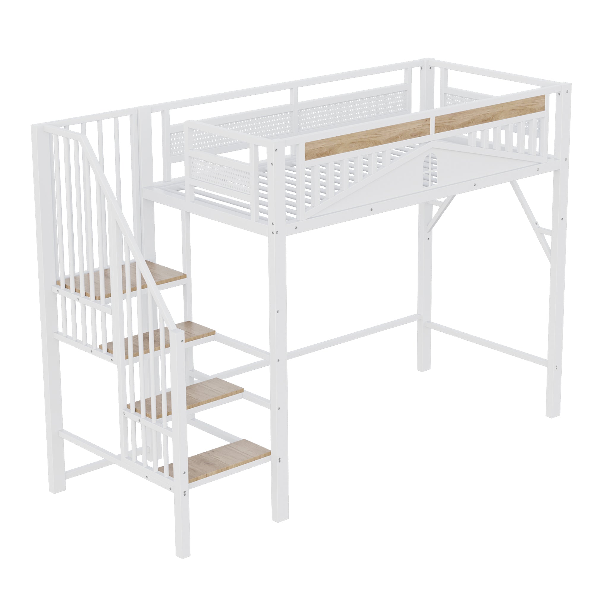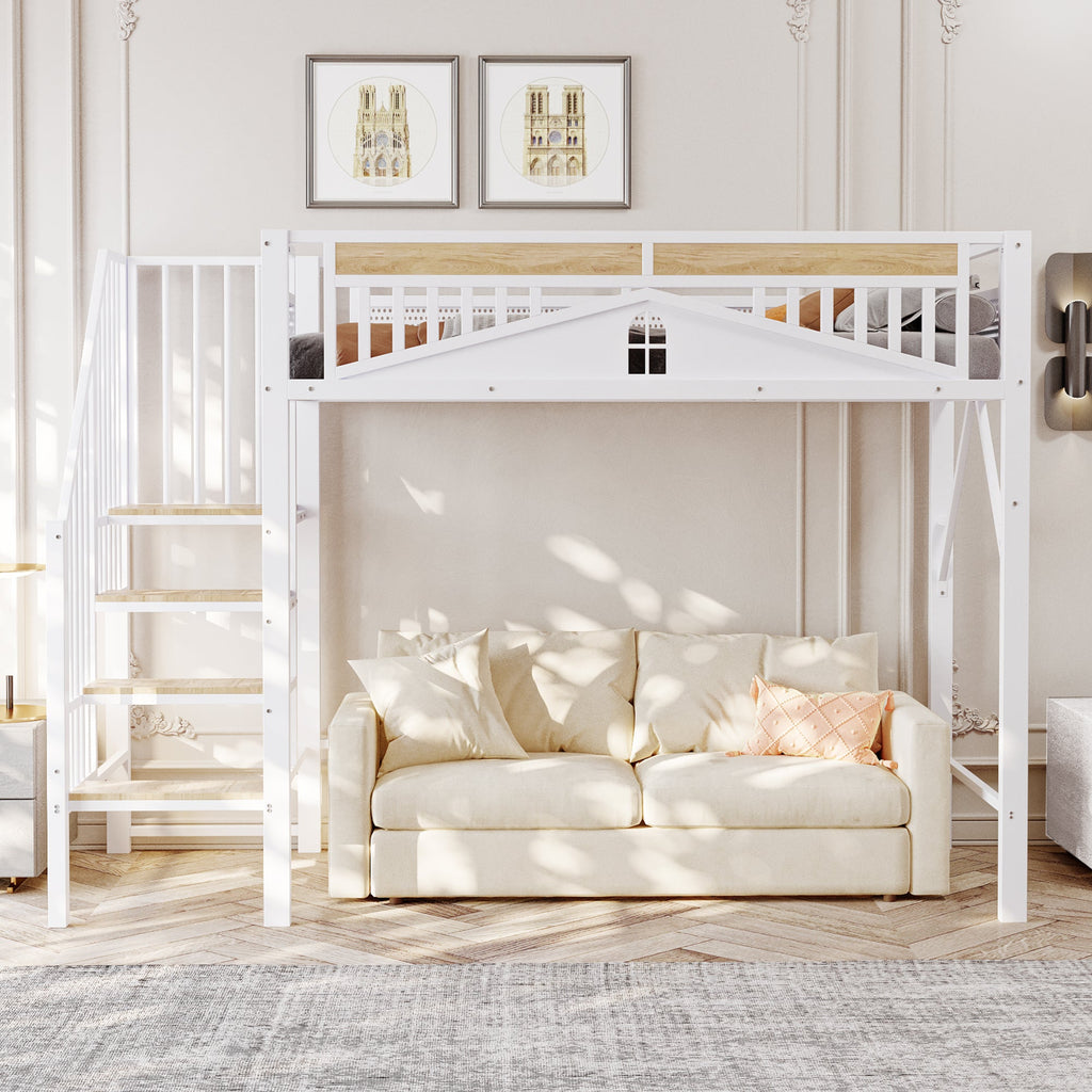 Metal Loft Bed, 90x200cm, Safety Rail with Window & Ladder, White