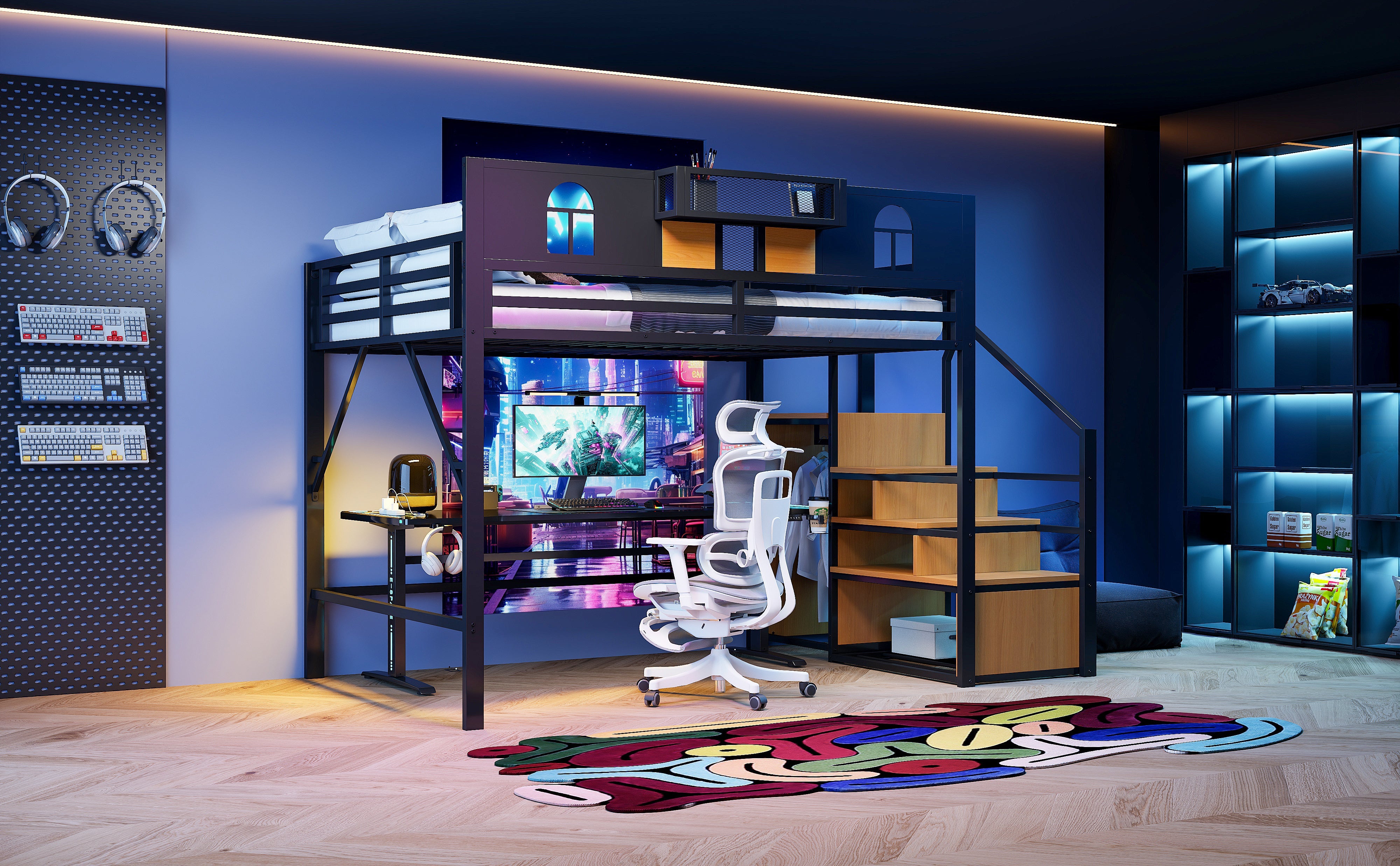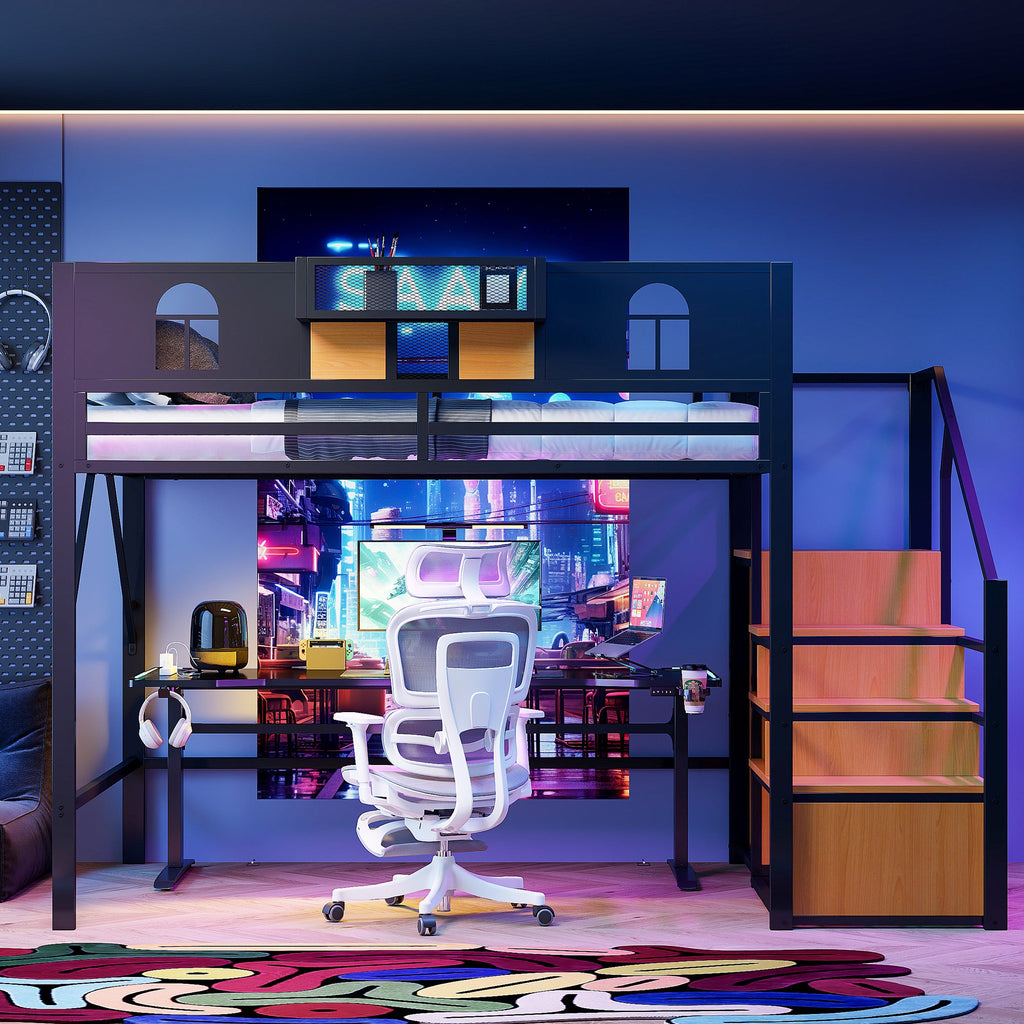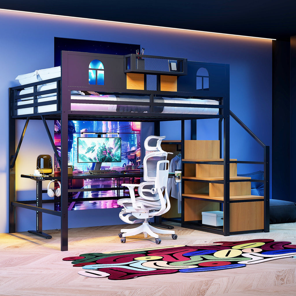 This large metal loft bed is stylish and multifunctional, combining modern design with practical storage options. It is ideal for teens, young adults, or compact living spaces, as it maximizes bedroom space while providing a comfortable and safe sleeping area.