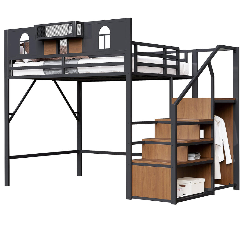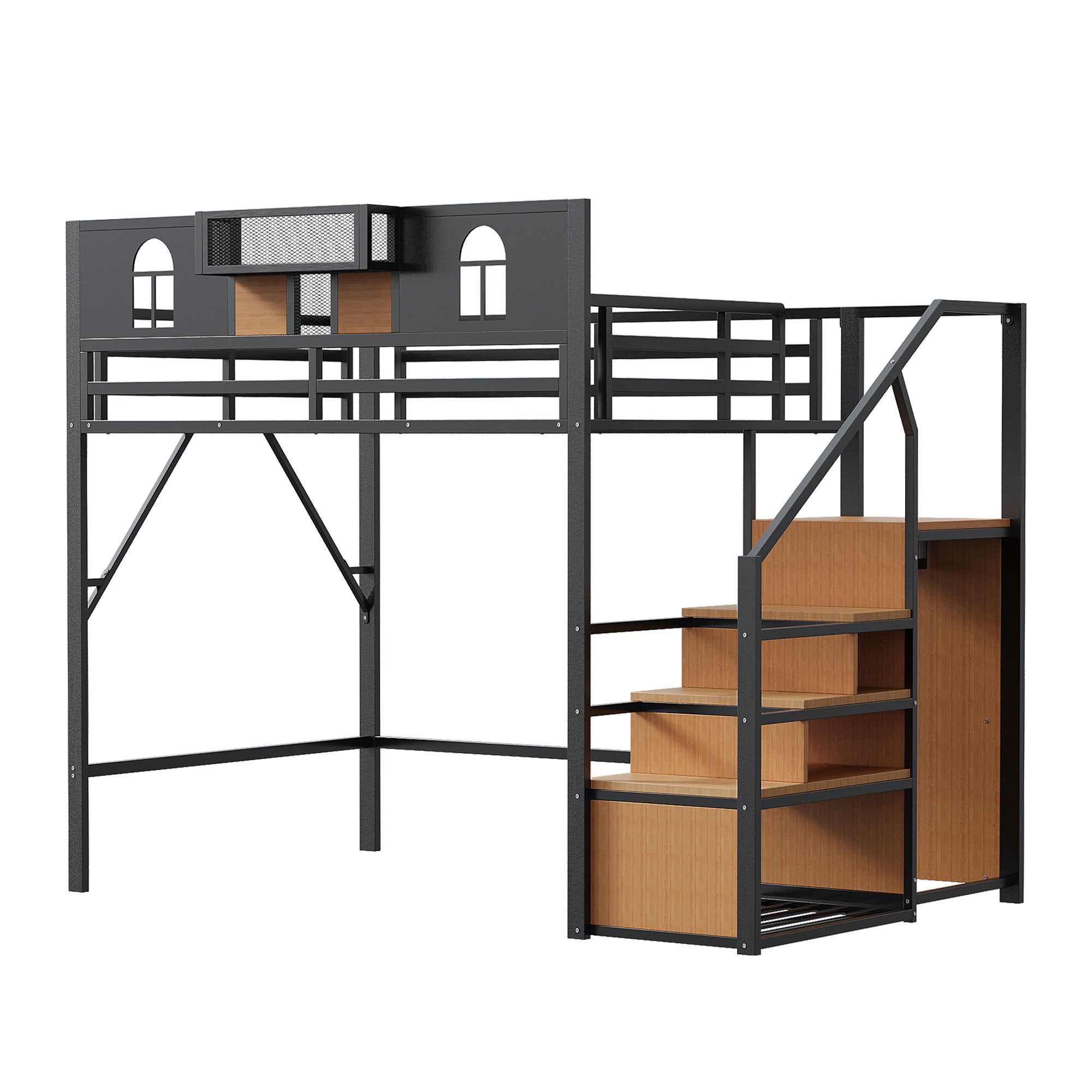 The loft bed features a unique design with raised side rails, two openwork windows, wooden panels, mesh fabric, and a storage area for everyday items. It is both beautiful and practical. The bed has a built-in storage compartment for books, cell phones, or decorative items, keeping everything you need within easy reach.
