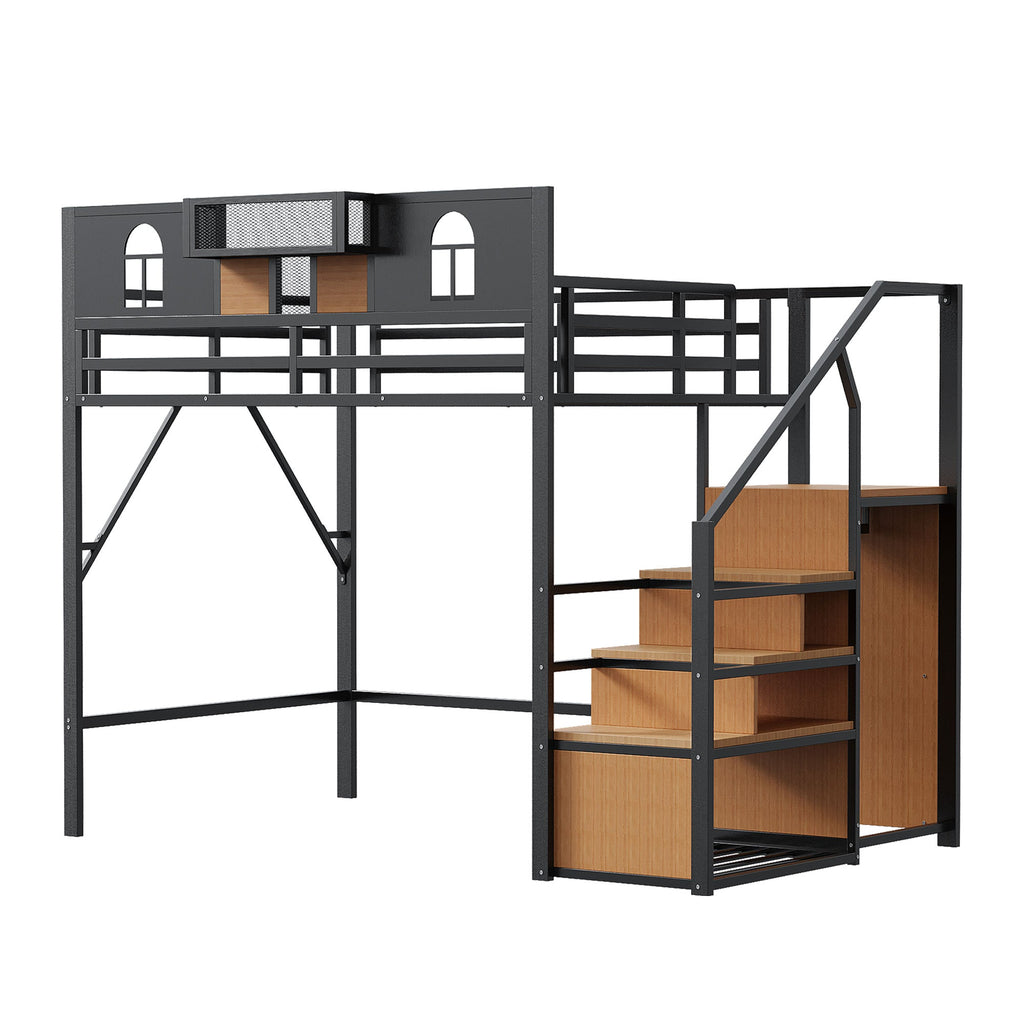 Metal Loft Bed with Storage Ladder & Desk, 140x200cm, Black