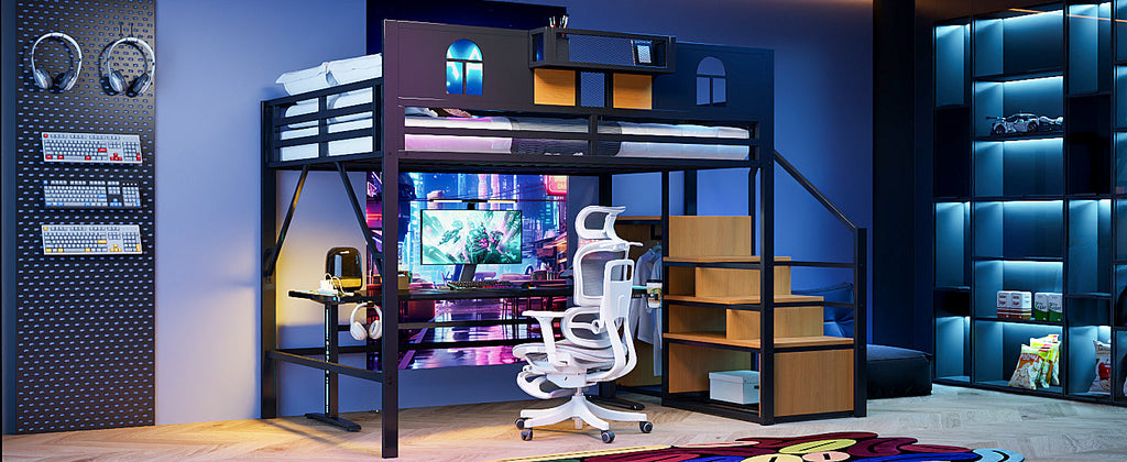 This loft bed features a sturdy metal frame that offers high load-bearing capacity and durability. It is available in white or black, and its stylish, modern design complements a variety of bedroom styles.