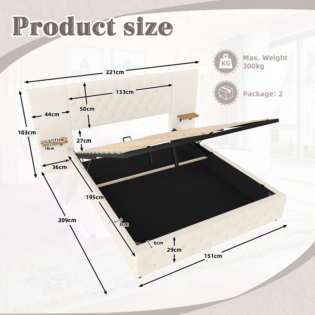 Modern 150*200cm Bed Frame with LED, USB-C Ports, Hydraulic Lift Storage, Beige