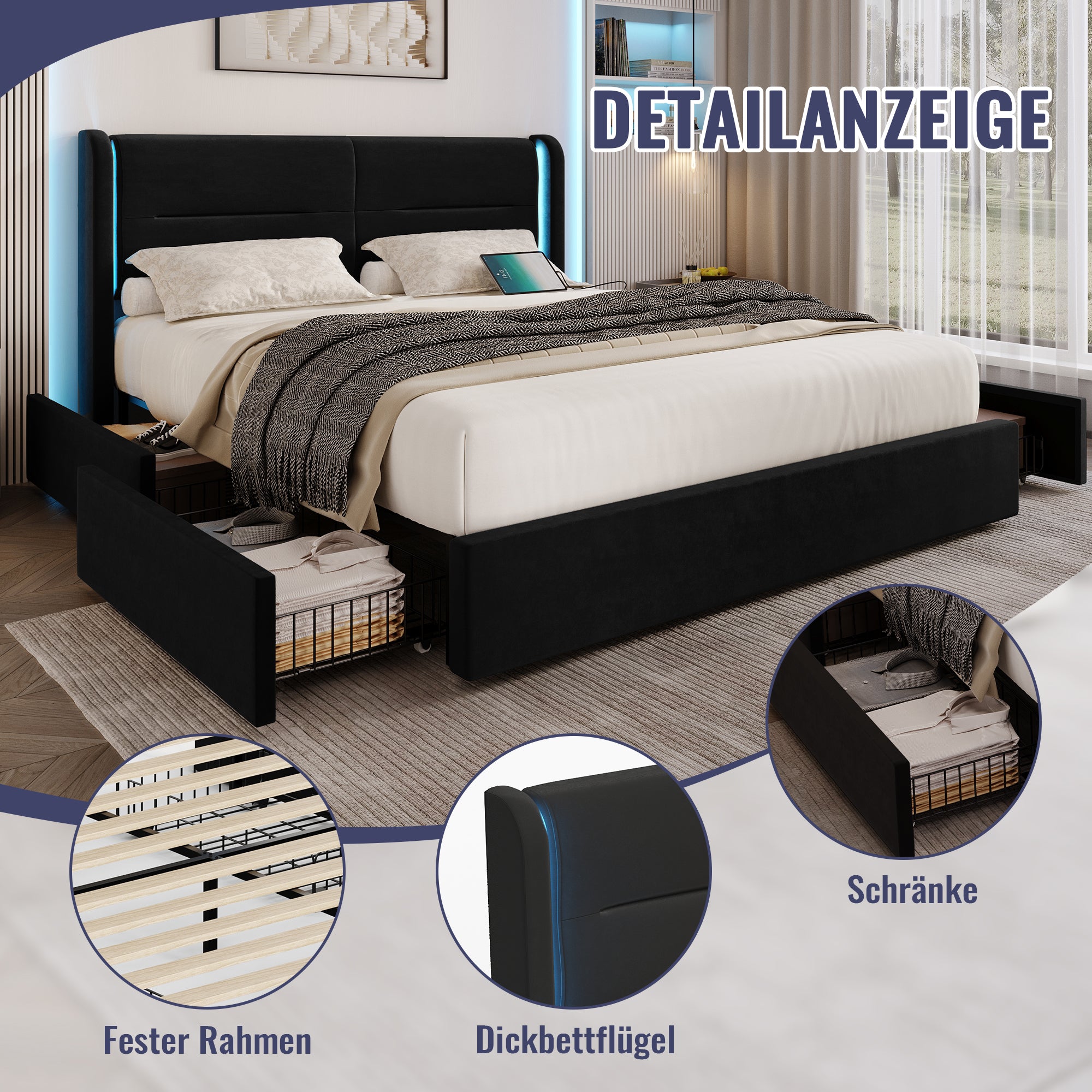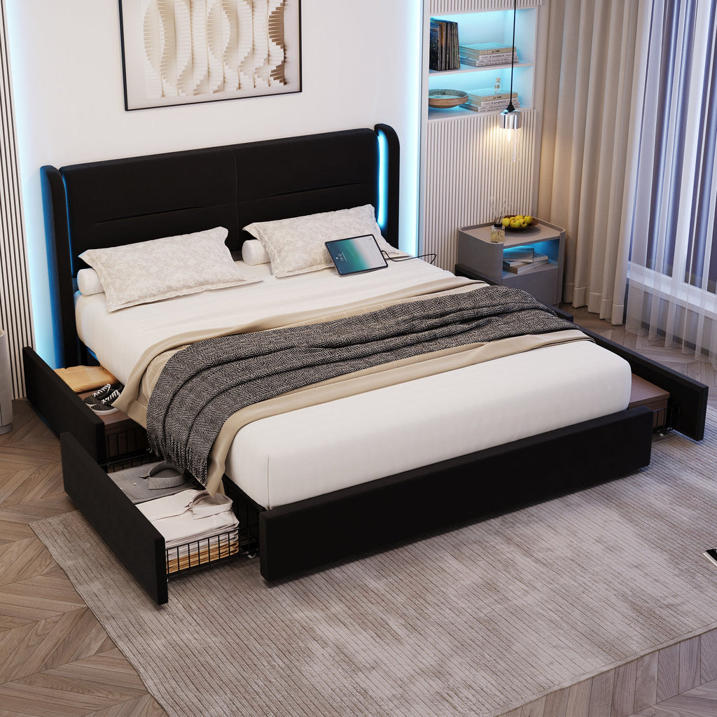 Modern Bed Frame, 160x200cm, LED Headboard, 4 Storage Drawers, Dual USB, Black