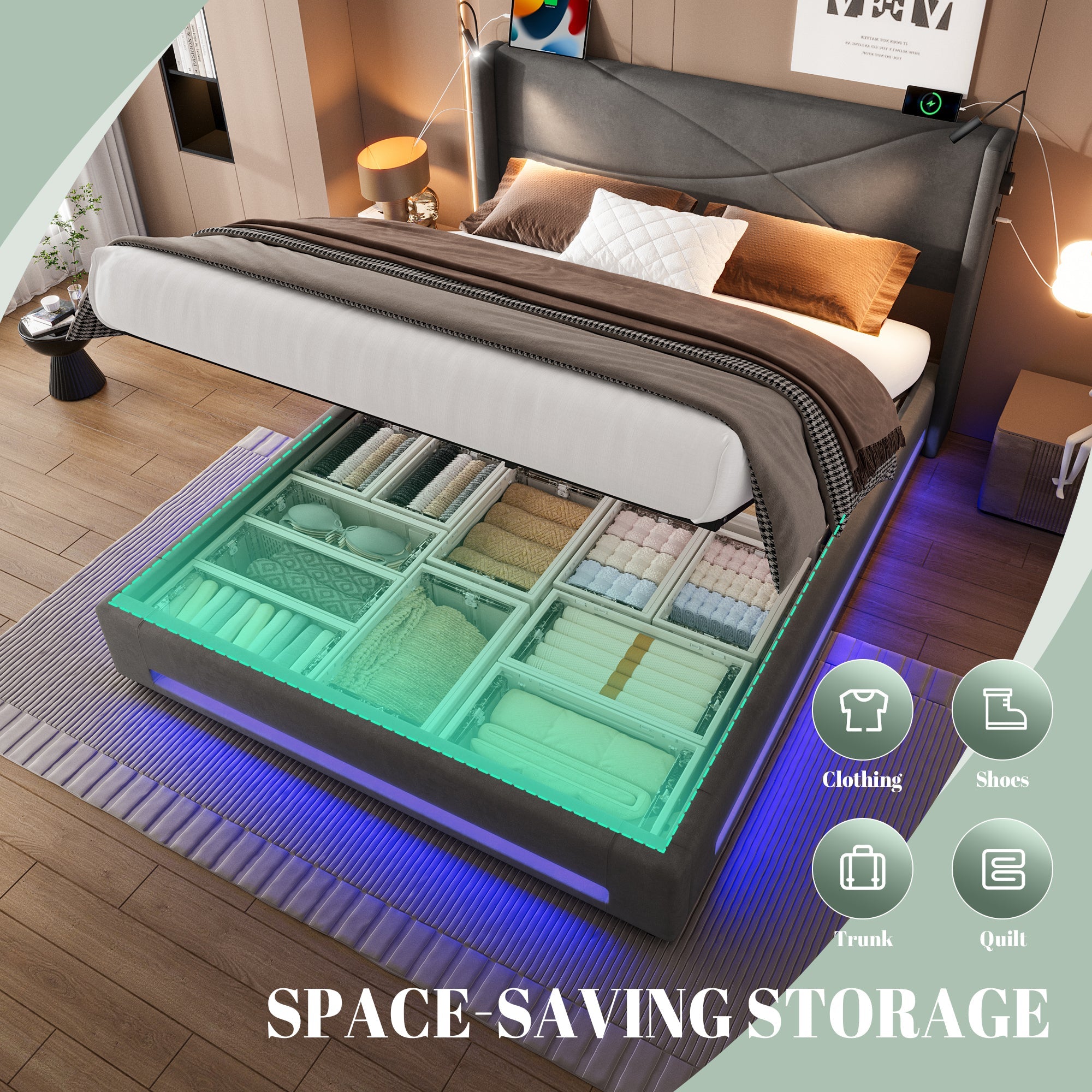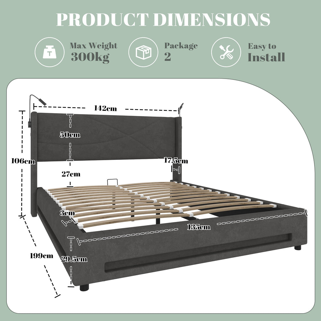 Modern Bed Frame, Reading Lights, LED, Hydraulic Storage Base, USB Ports, Dark Gray