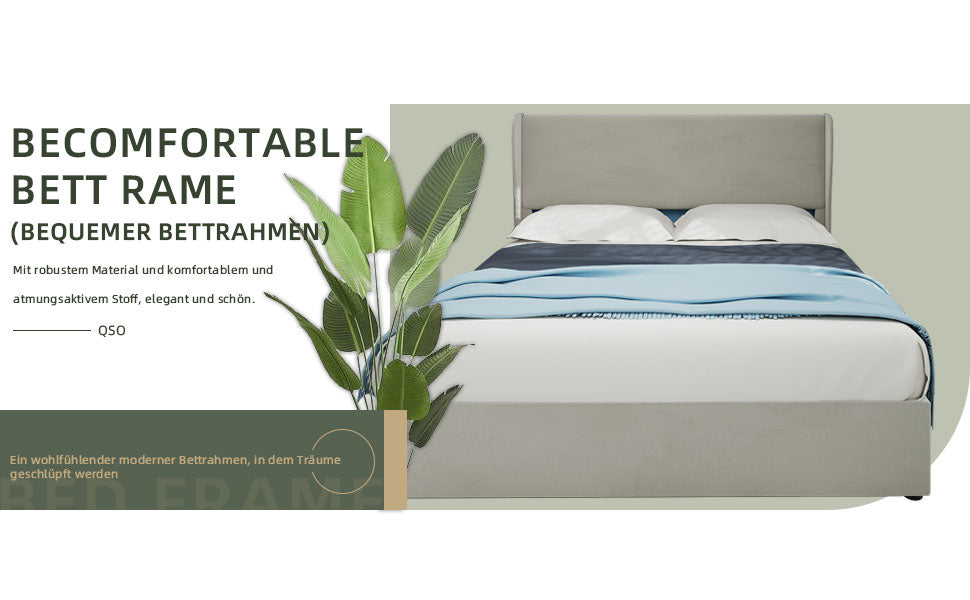 Modern Design: This bed frame showcases a modern, sophisticated style with a beautiful gray Dutch velvet upholstered headboard and backrest, perfectly complementing a variety of decor themes.