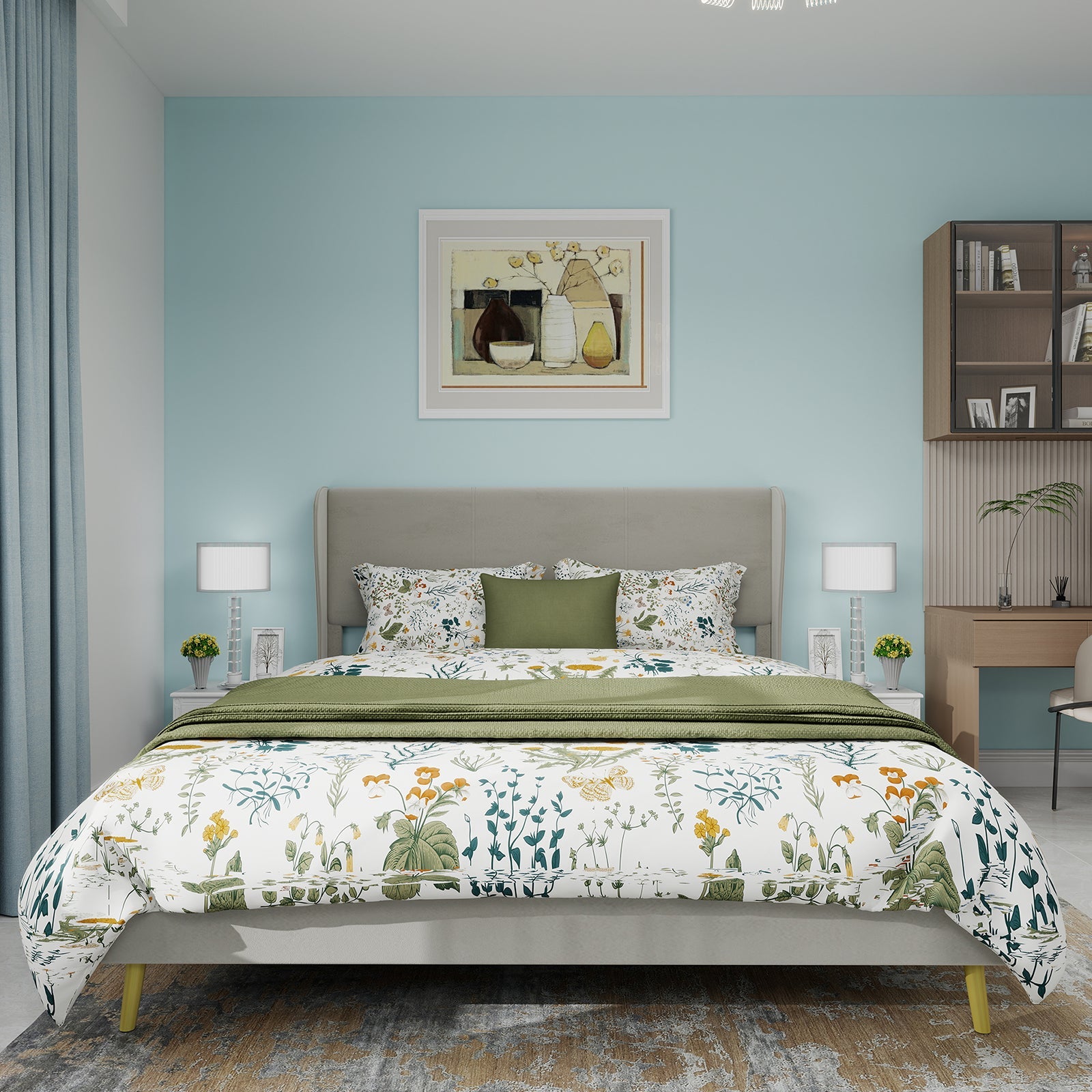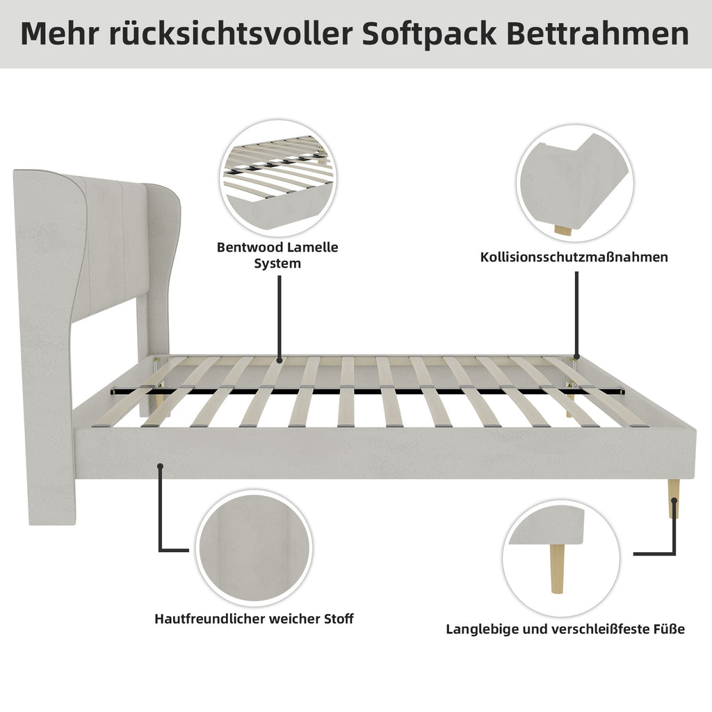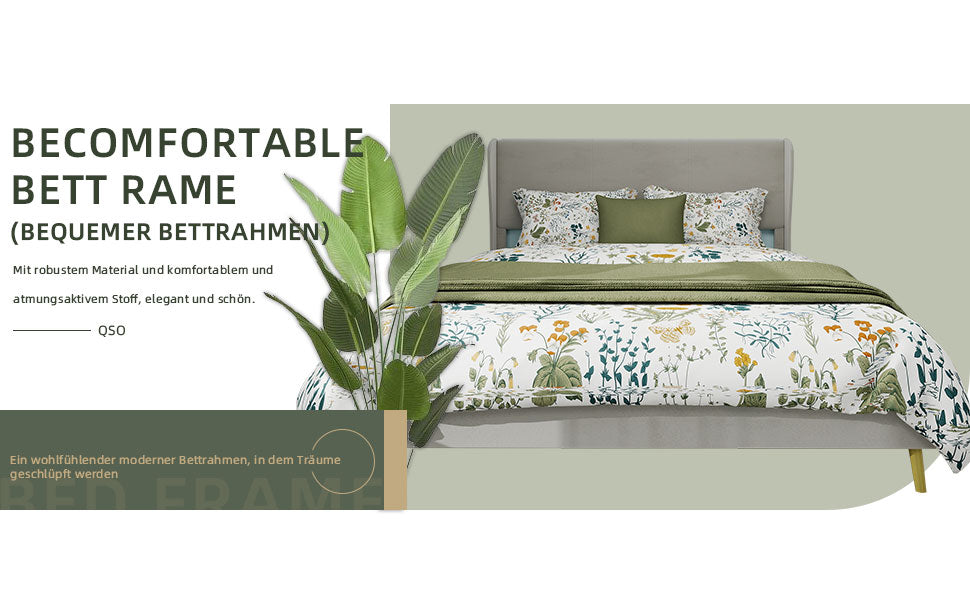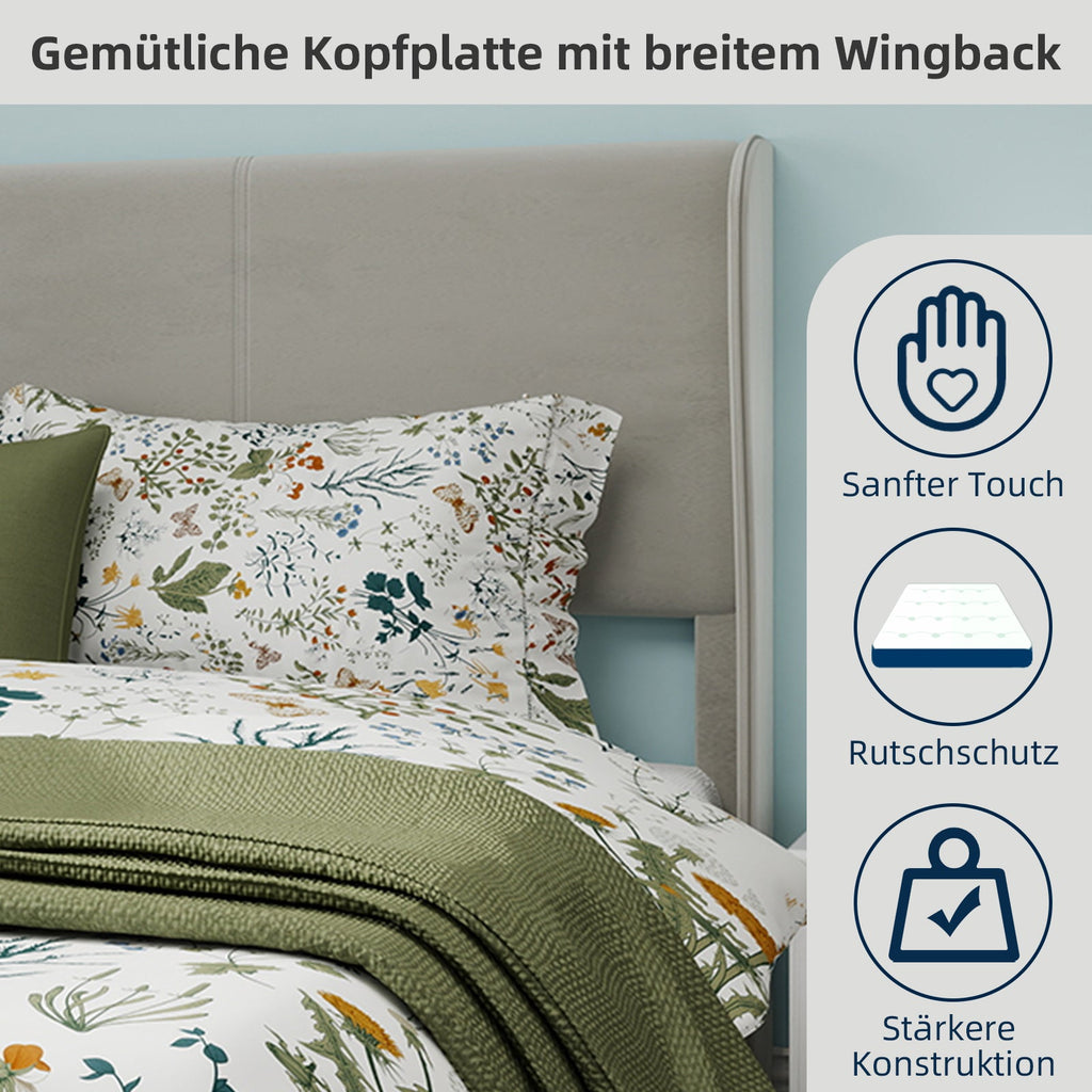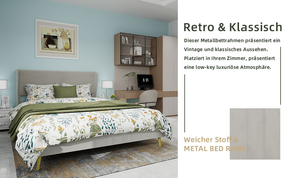 Modern design: This bed frame showcases a modern, sophisticated style with a beautiful gray Dutch velvet upholstered headboard and backrest, perfectly complementing a variety of decor themes.