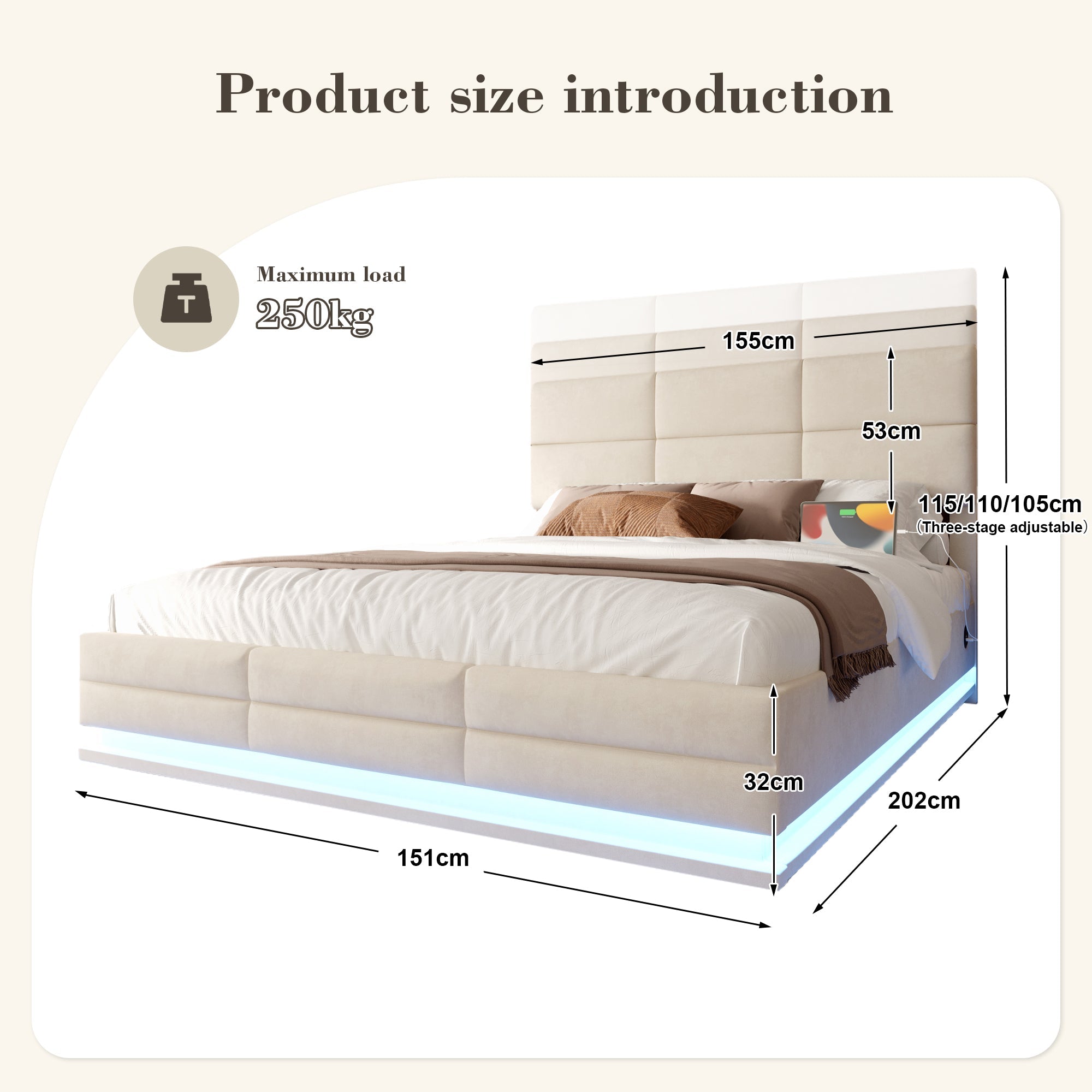 Modern Upholstered Bed 150x200cm, USB/LED, Hydraulic Storage, Beige Velvet