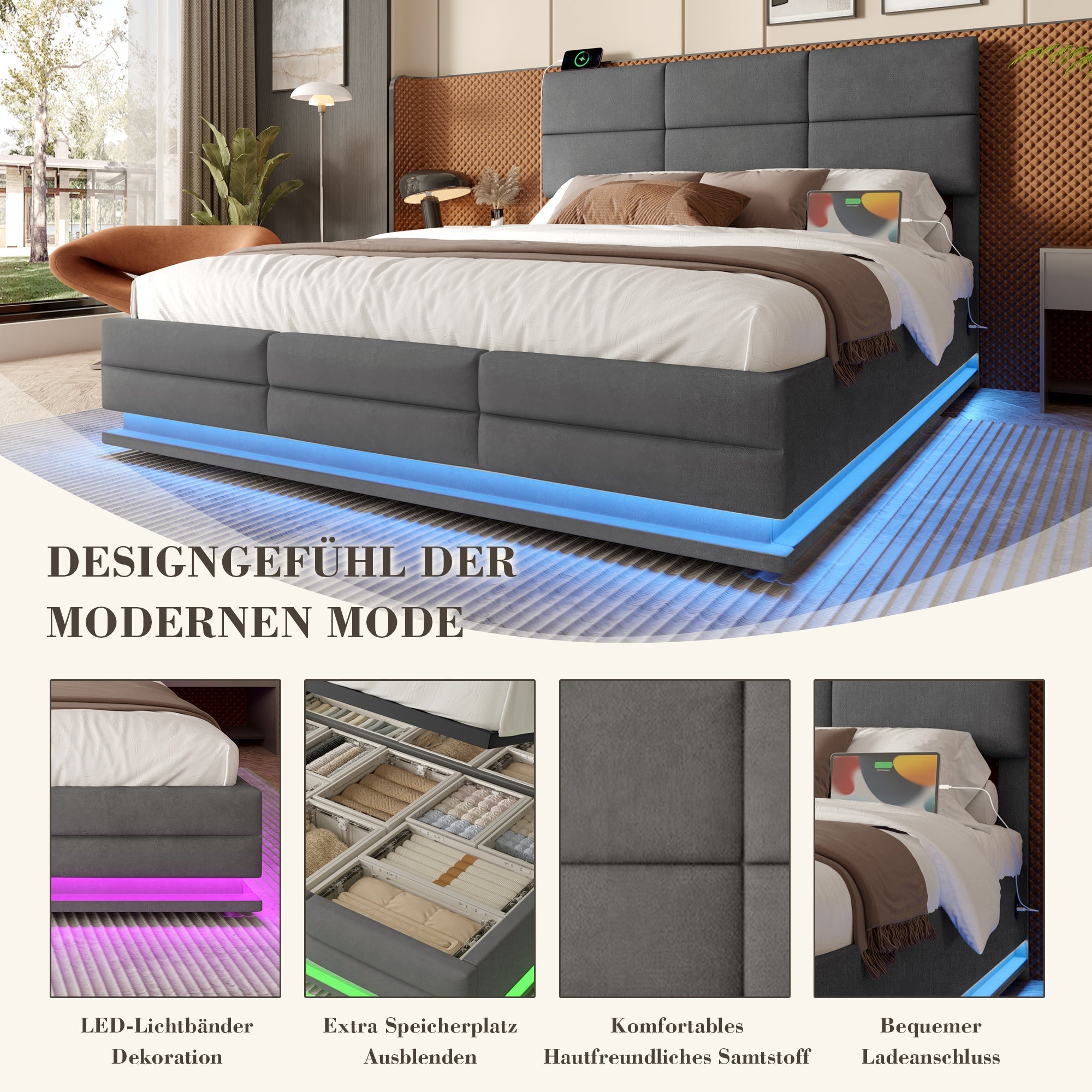 No more tangled cables! The conveniently placed USB ports on both sides of the bed allow you to easily charge your devices without having to get out of bed. This is a real plus in today's fast-paced world: Charge your smartphone, tablet, and smartwatch simultaneously—all within easy reach, yet discreetly integrated. This keeps your nightstand tidy.