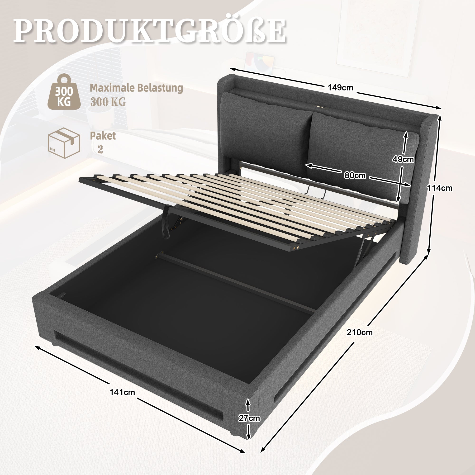 Modern Upholstered Bed, Storage LED USB-C Cushions 140x200cm