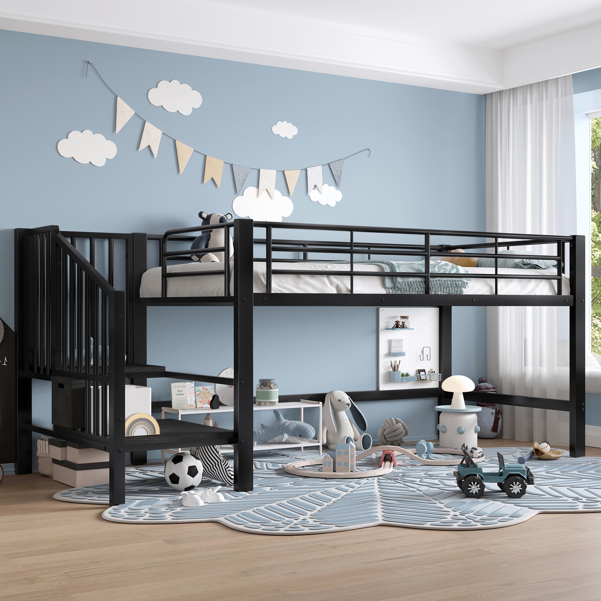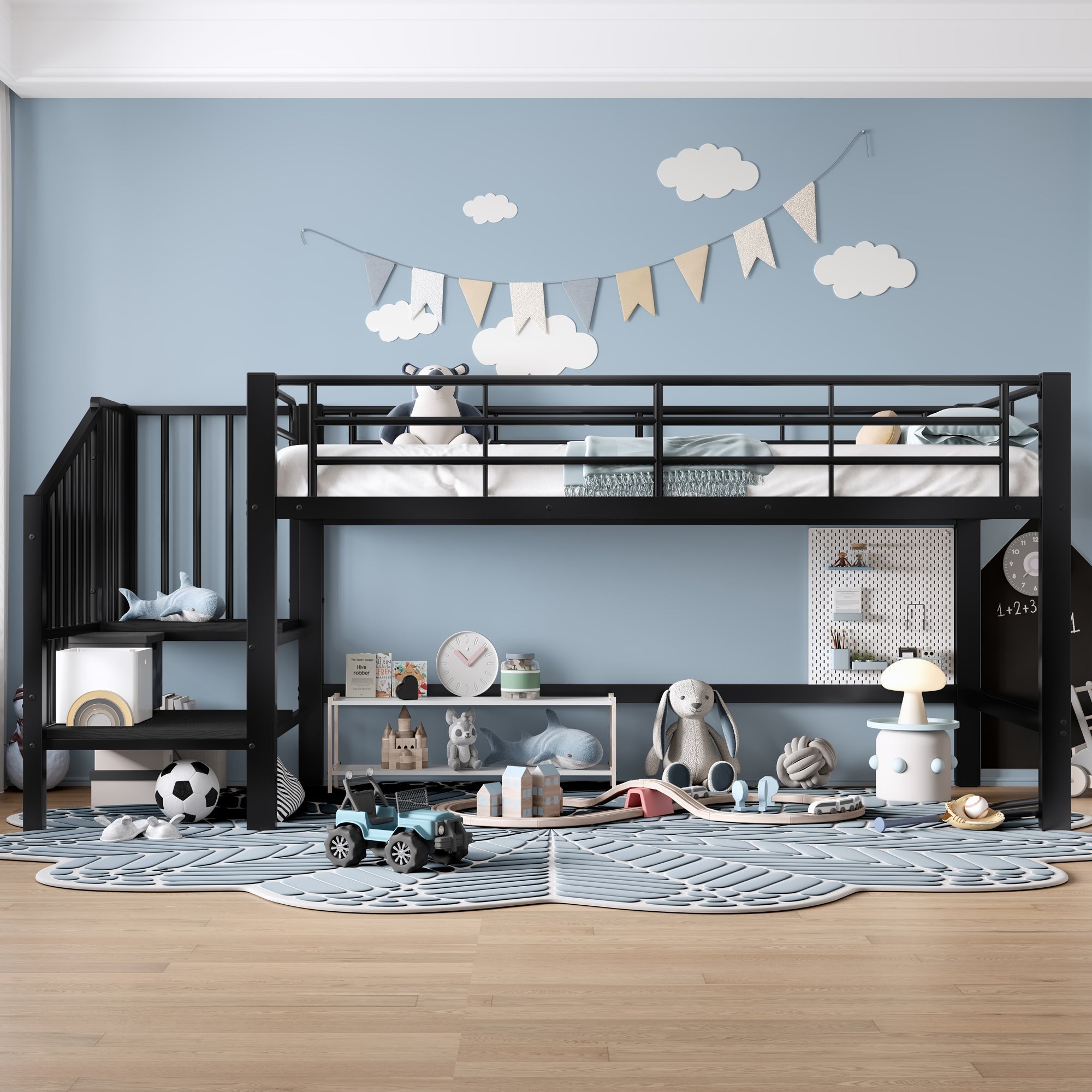 Design your child's bedroom with this loft bed. The ladder-style stairs ensure your child's safety when climbing up and down. The slatted bases are only 79.5 cm above the floor, providing peace of mind against accidental injury. The sturdy metal frame guarantees a long lifespan.