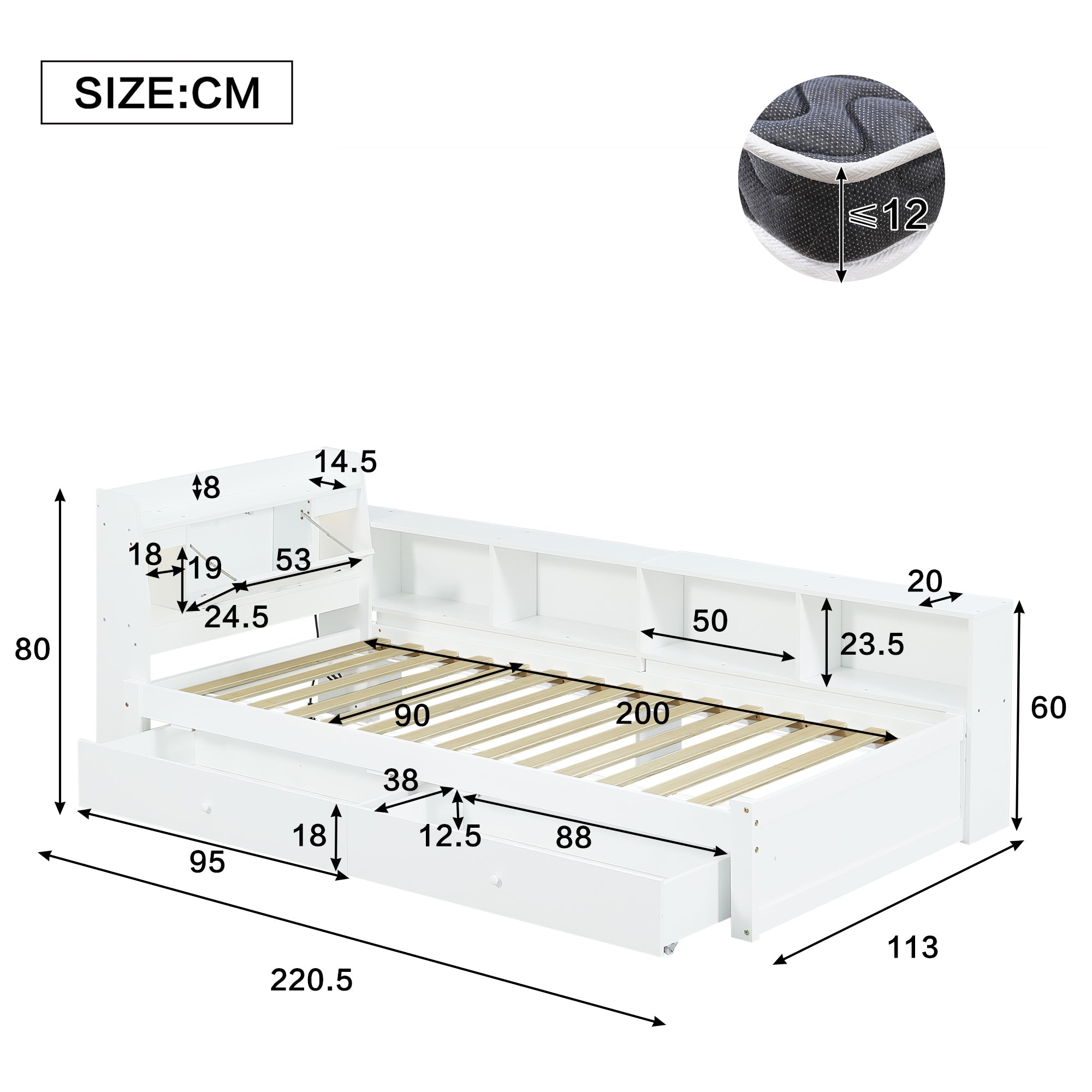 Single Panel Bed, Storage Headboard Lights Charging Drawers 90x200cm, White Pine/MDF