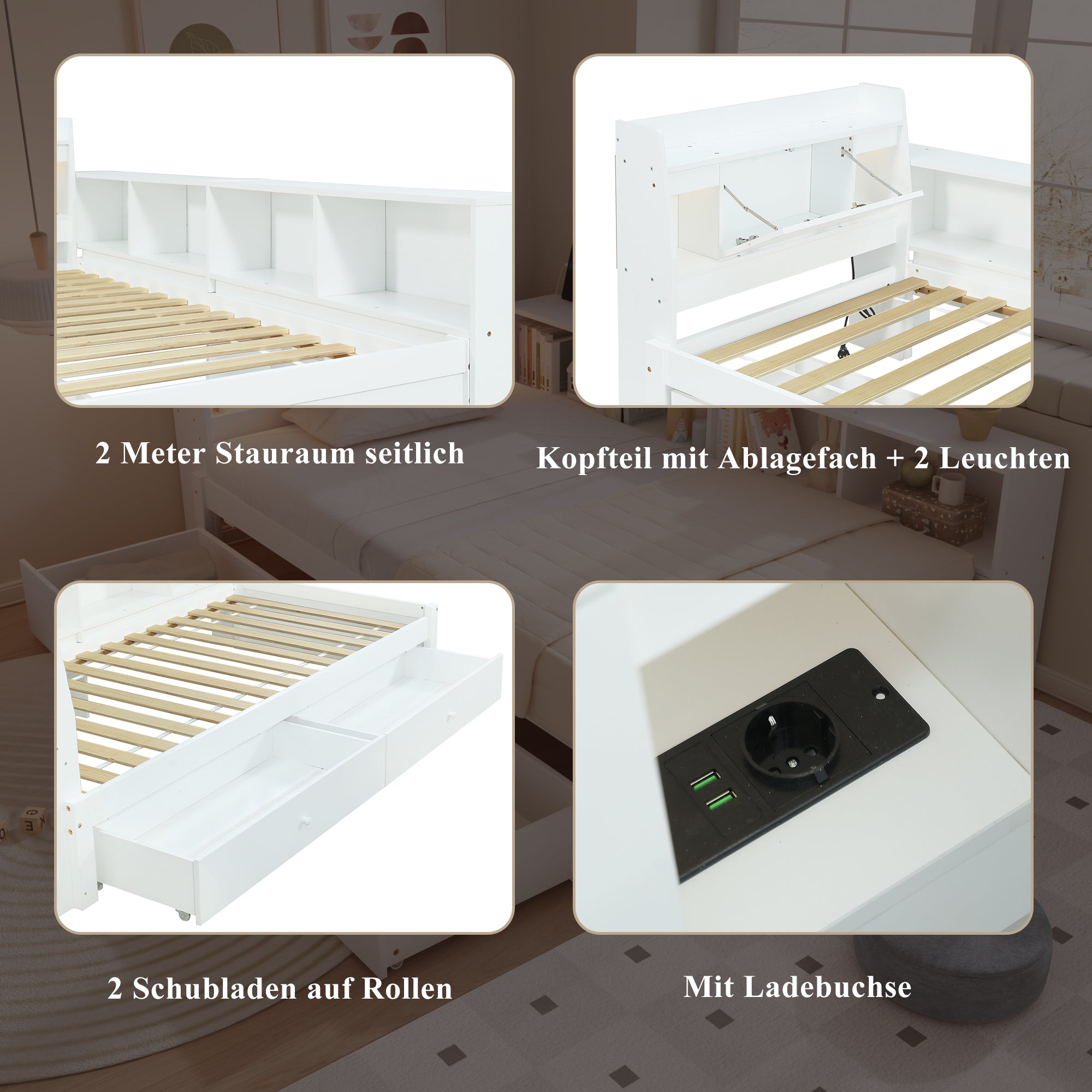 This single bed, measuring 90x200cm, perfectly combines functionality and style. The white, modern bed frame impresses with its simple yet stylish design, adding an elegant touch to any bedroom. The headboard features storage space with two lights, while the side cabinets and drawers under the bed offer ample storage for personal items and help keep the room tidy. The integrated charging port allows you to conveniently charge your electronic devices, such as mobile phones or laptops, without worrying about tangled cables. This single bed is not only comfortable and practical but also improves your sleep quality and adds a touch of style to your room.