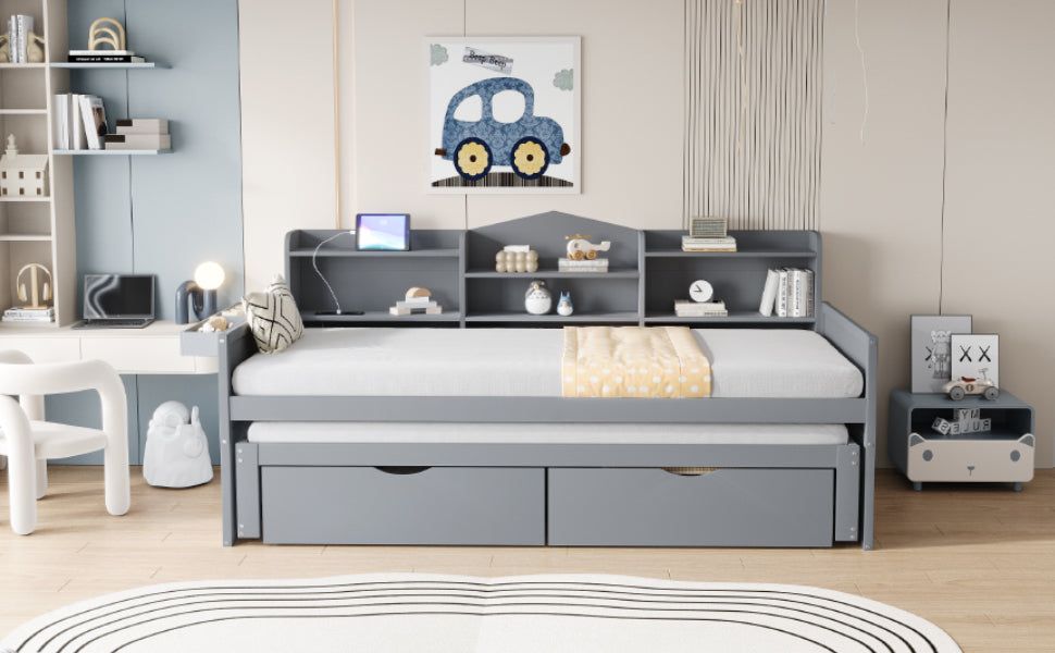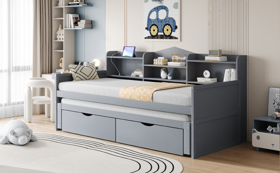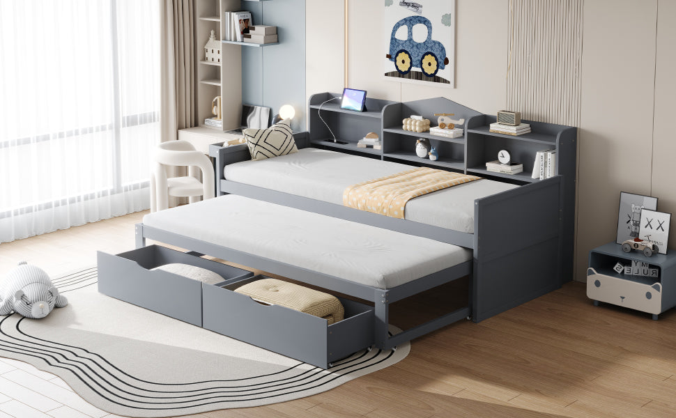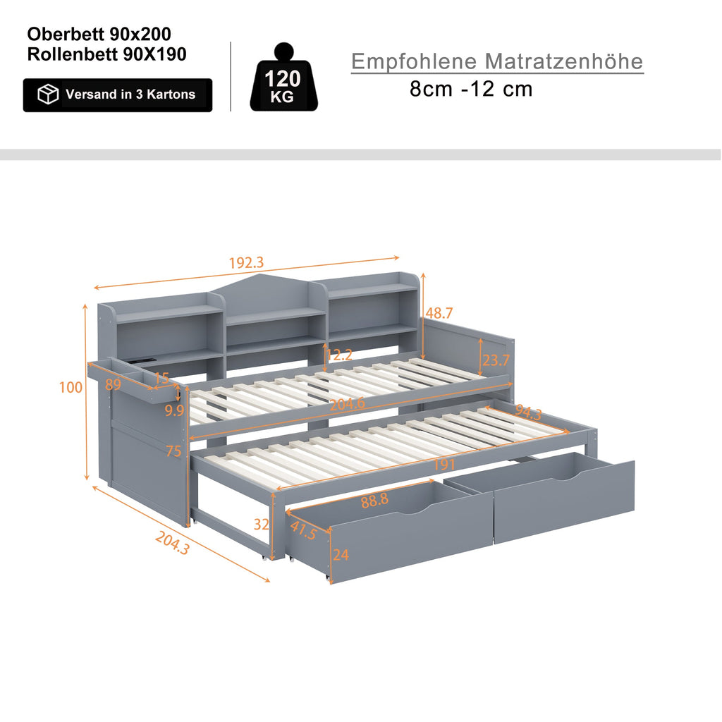 Sofa bed 90*200 with Pull-Out Bed, Drawers & USB Socket, Wood, Gray