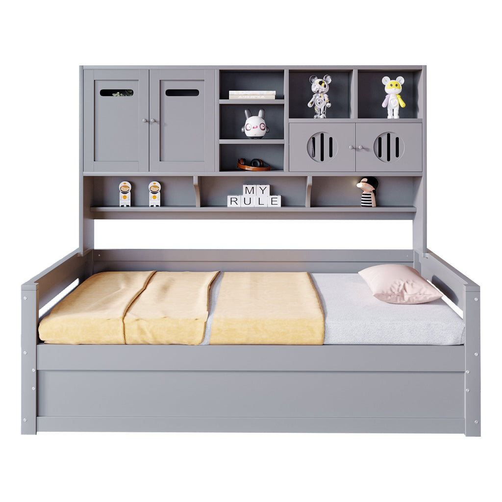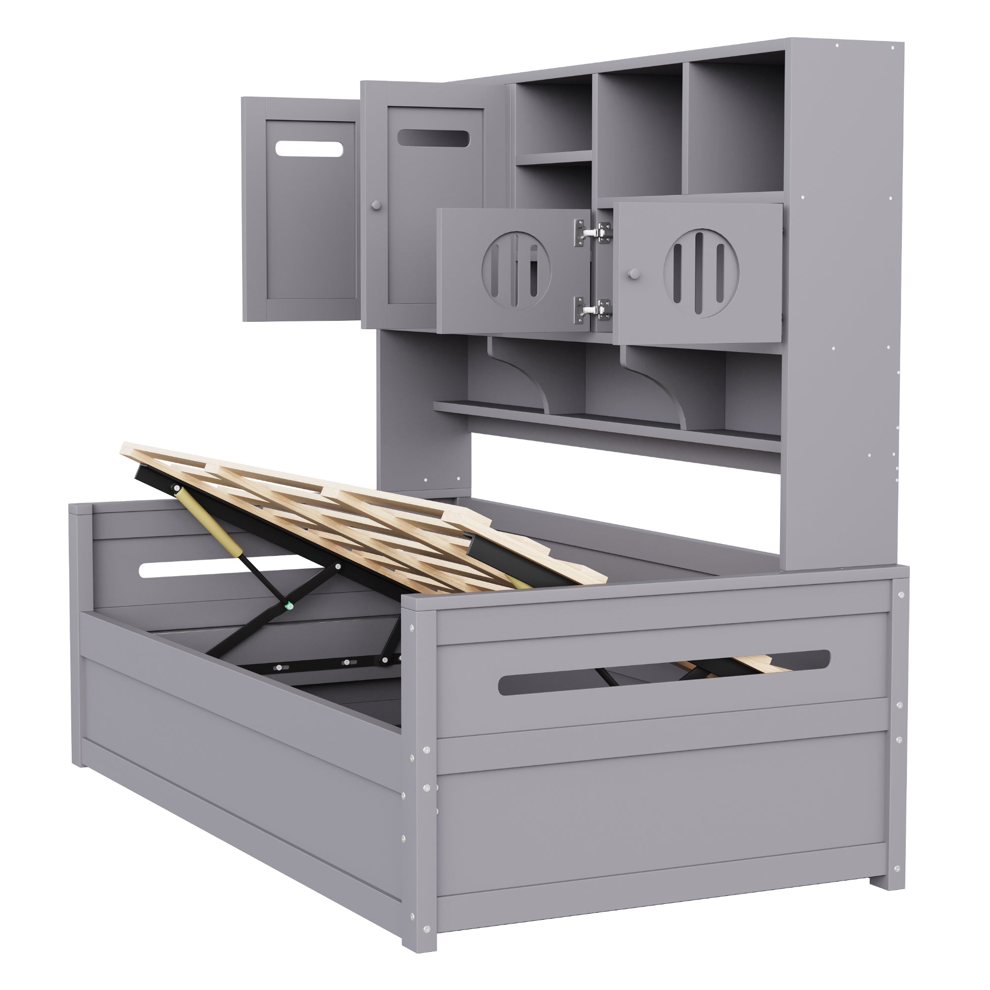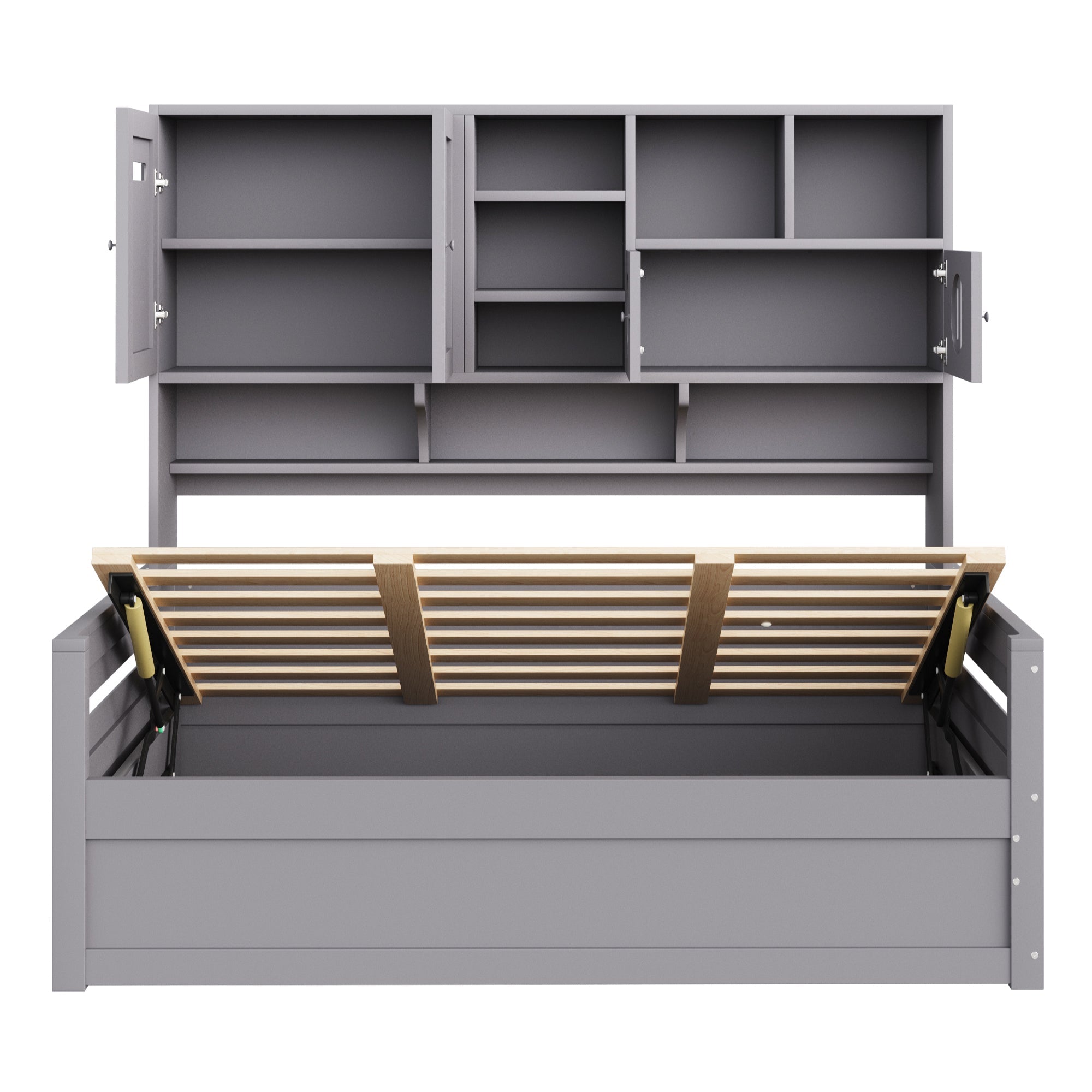 This sofa bed features multifunctional storage space above the headboard, allowing customers to store valuables. Multiple storage compartments provide space for decorative items and toy models, adding an aesthetic touch to the room. The sofa bed is hydraulic, conveniently storing clothes, bedding, and other everyday items.