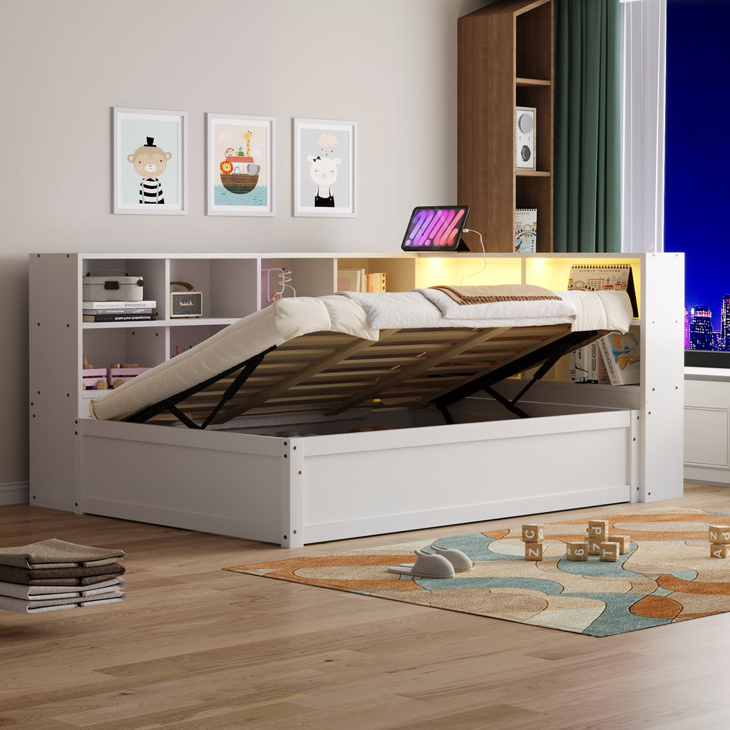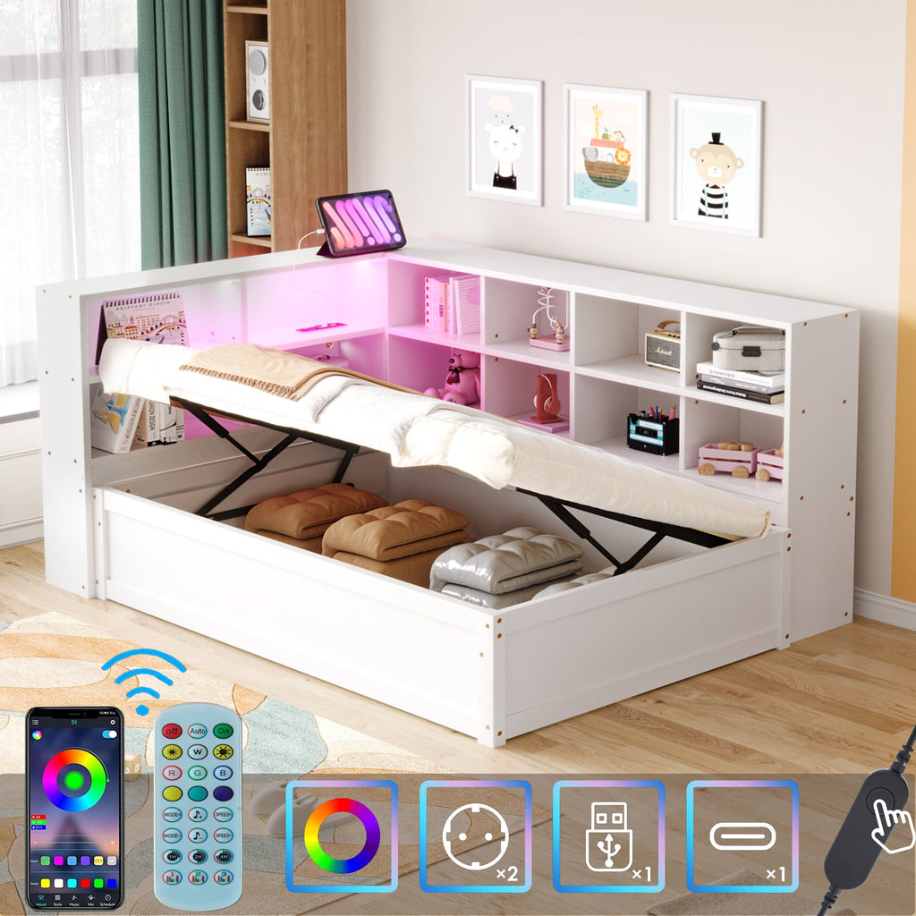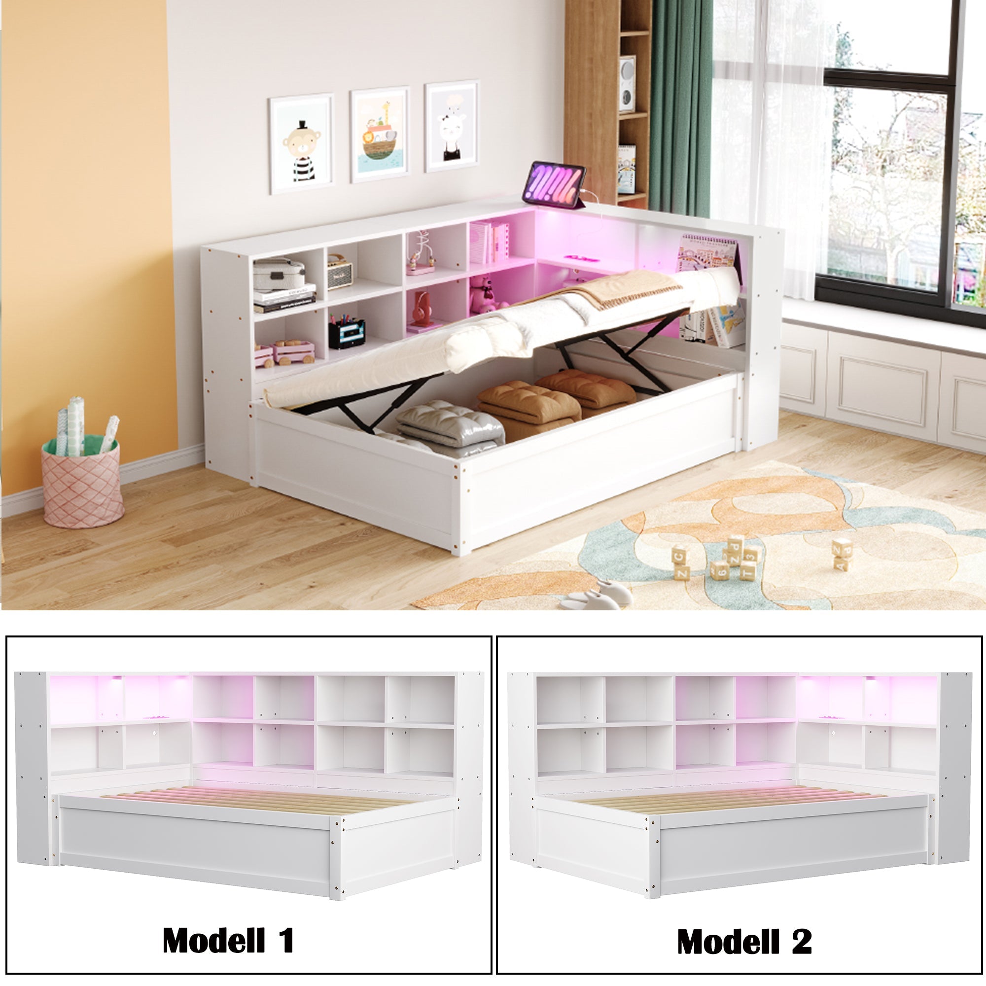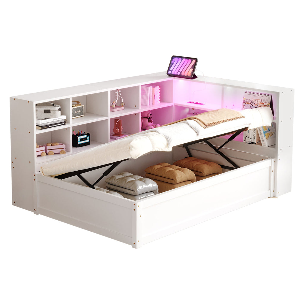 Sofa Bed, 90x200 Multifunctional with Sockets, Storage, Light Bar, Hydraulic, Solid Wood, White