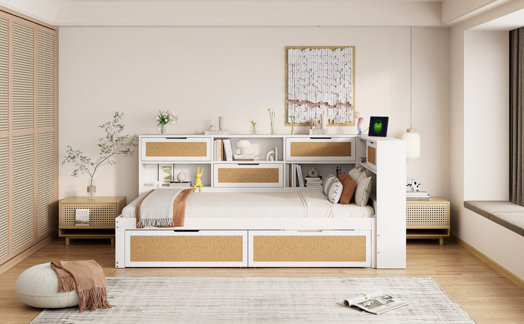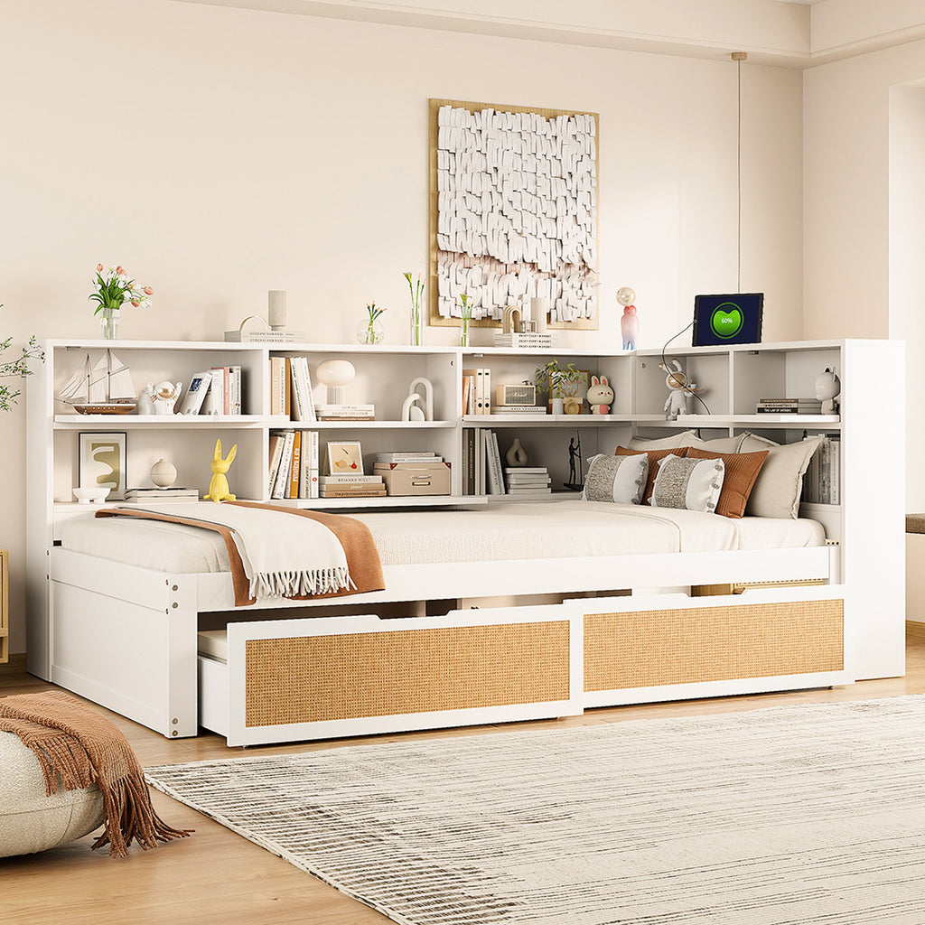 Sofa Bed, 90x200cm Multifunctional Single Bed with Drawer & Charging Port, White Solid Wood