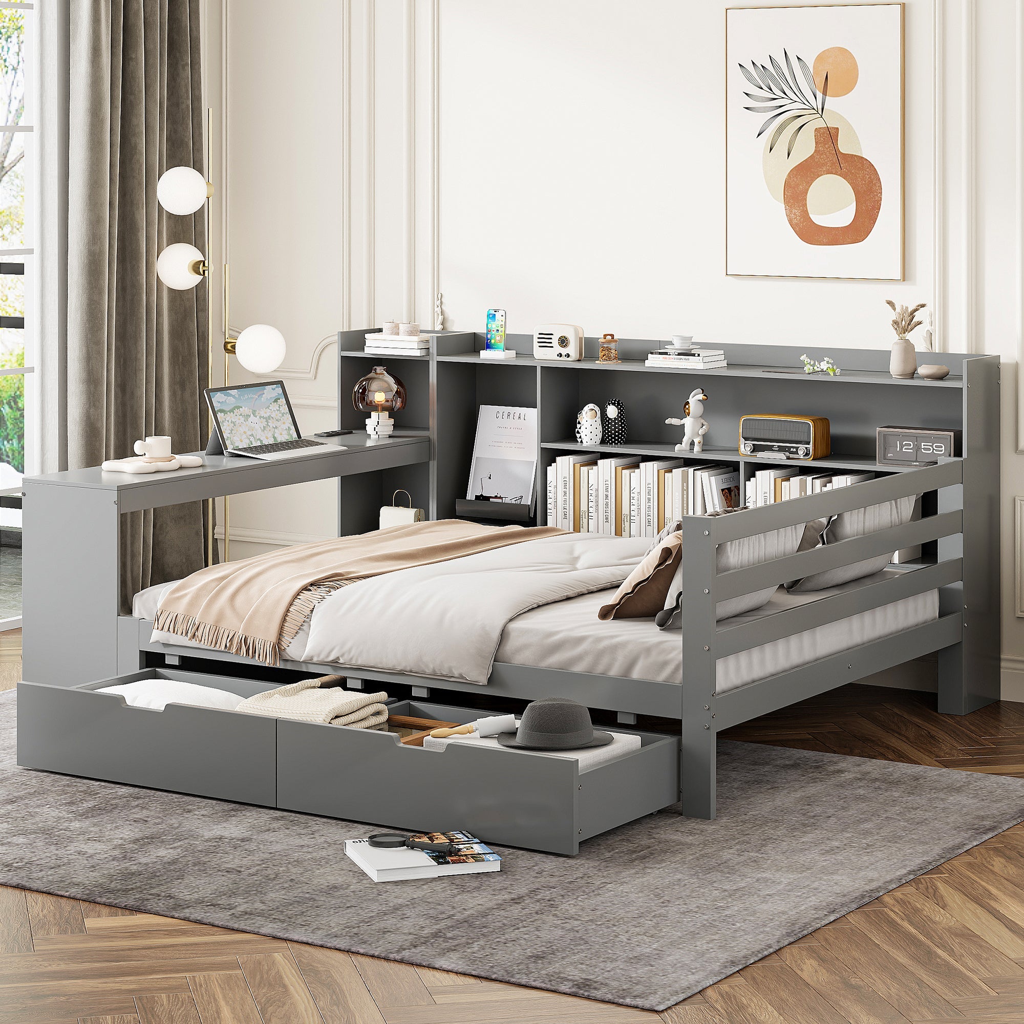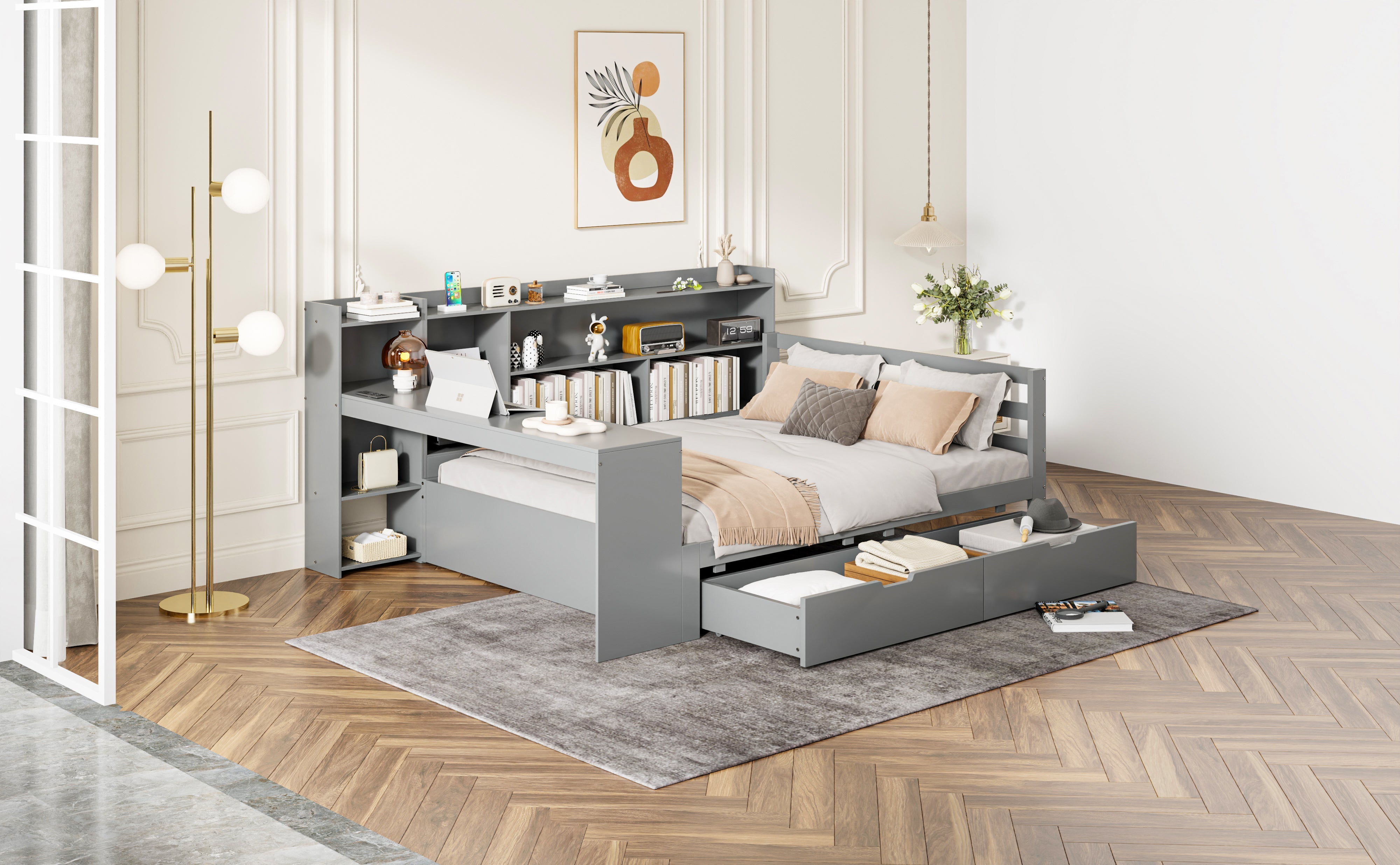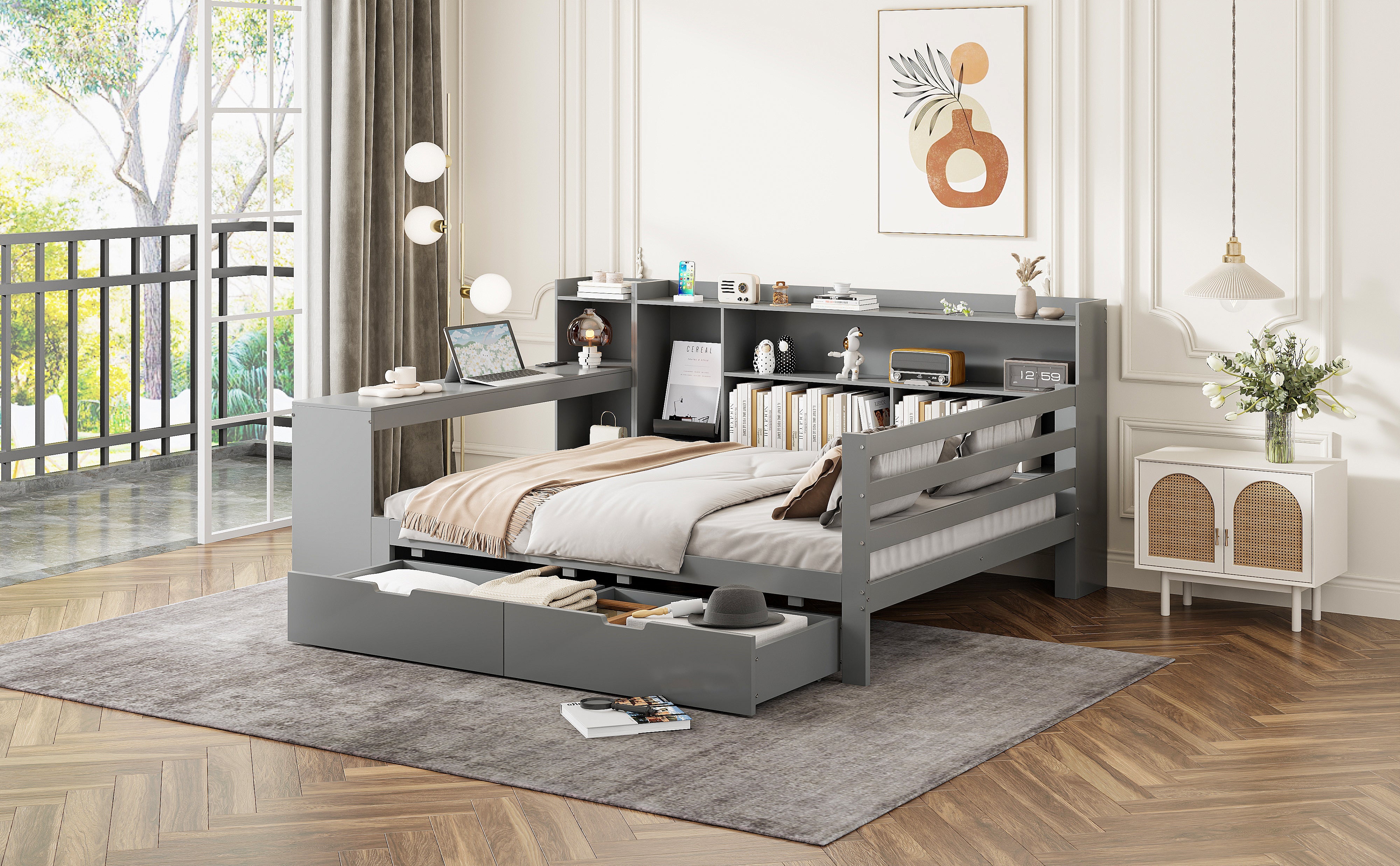 Designed for maximum versatility, this sleeper sofa features a built-in desk and a power outlet at the foot of the bed, making it perfect for students or anyone who needs a functional workspace. Shelves on the side of the bed provide convenient storage for books and other essentials, while two large drawers underneath offer ample storage for clothes, bedding, or other items.