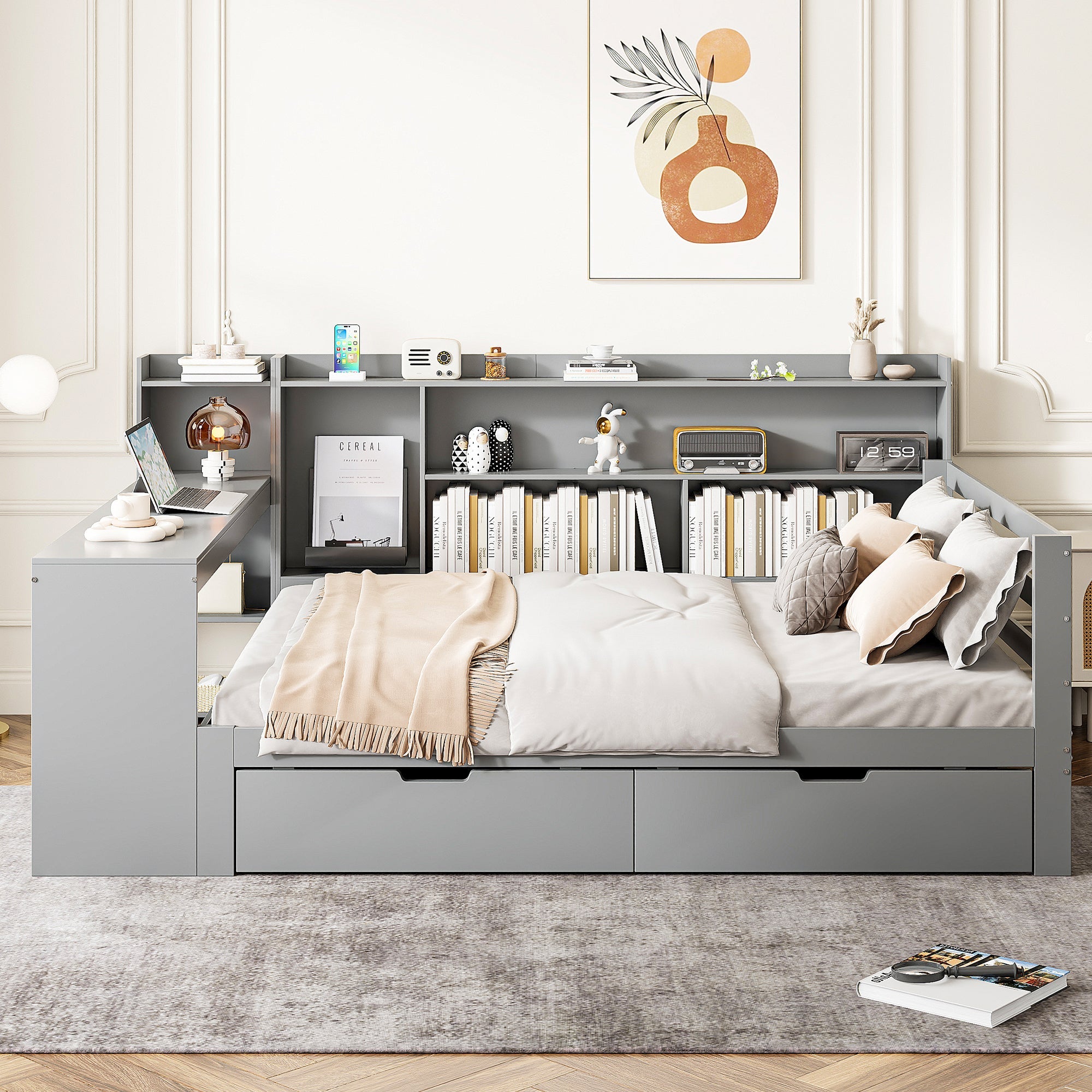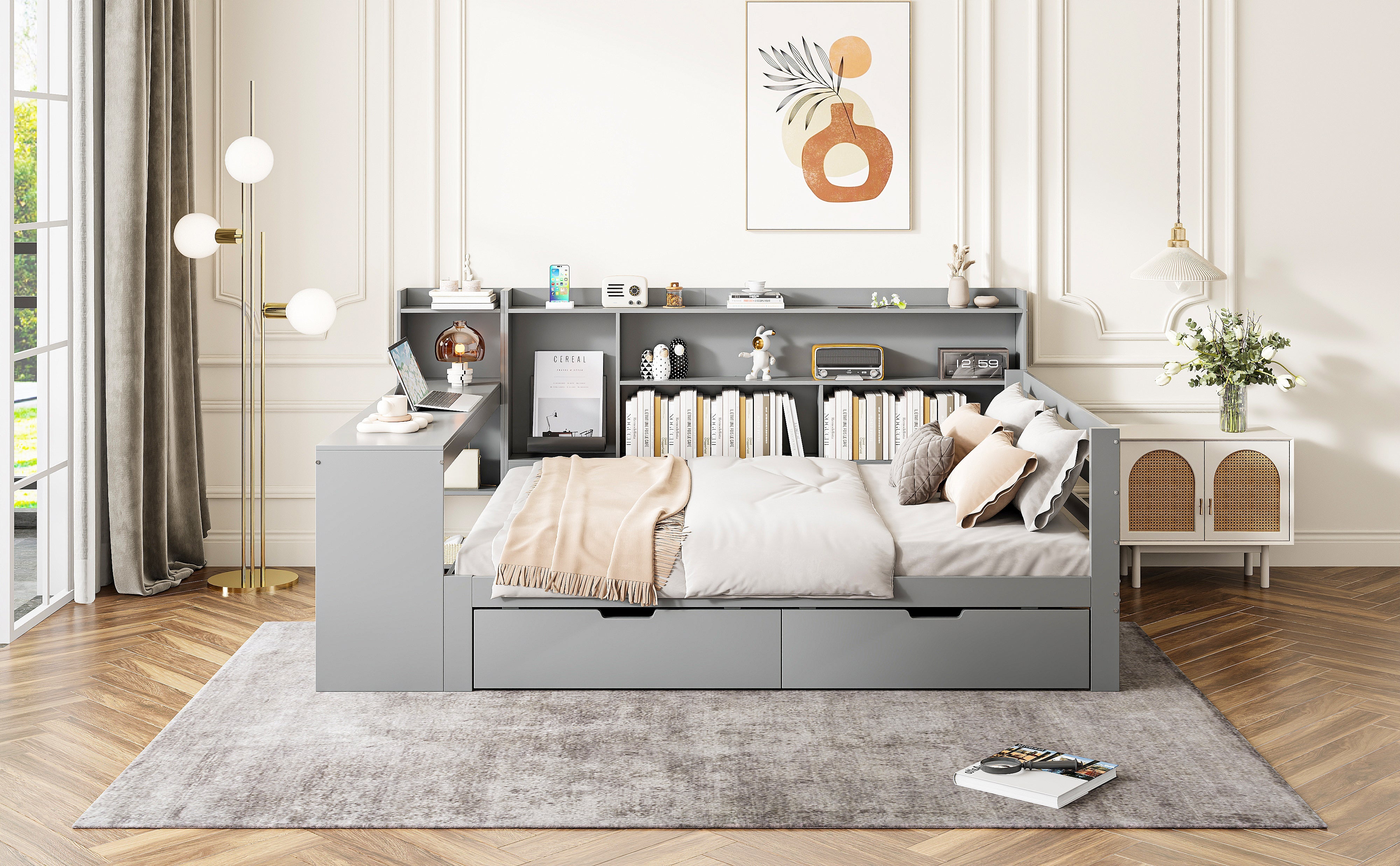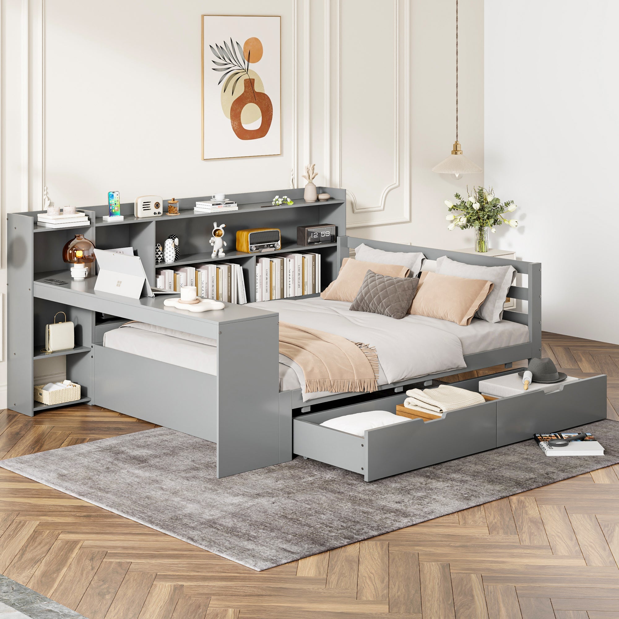 Designed for maximum versatility, this sleeper sofa features a built-in desk and a power outlet at the foot of the bed, making it perfect for students or anyone who needs a functional workspace. Shelves on the side of the bed provide convenient storage for books and other essentials, while two large drawers underneath offer ample storage for clothes, bedding, or other items.