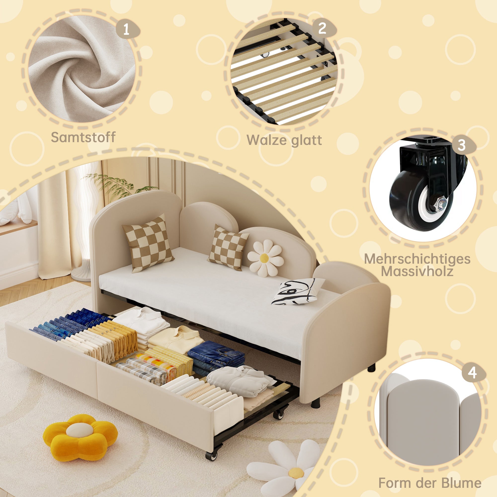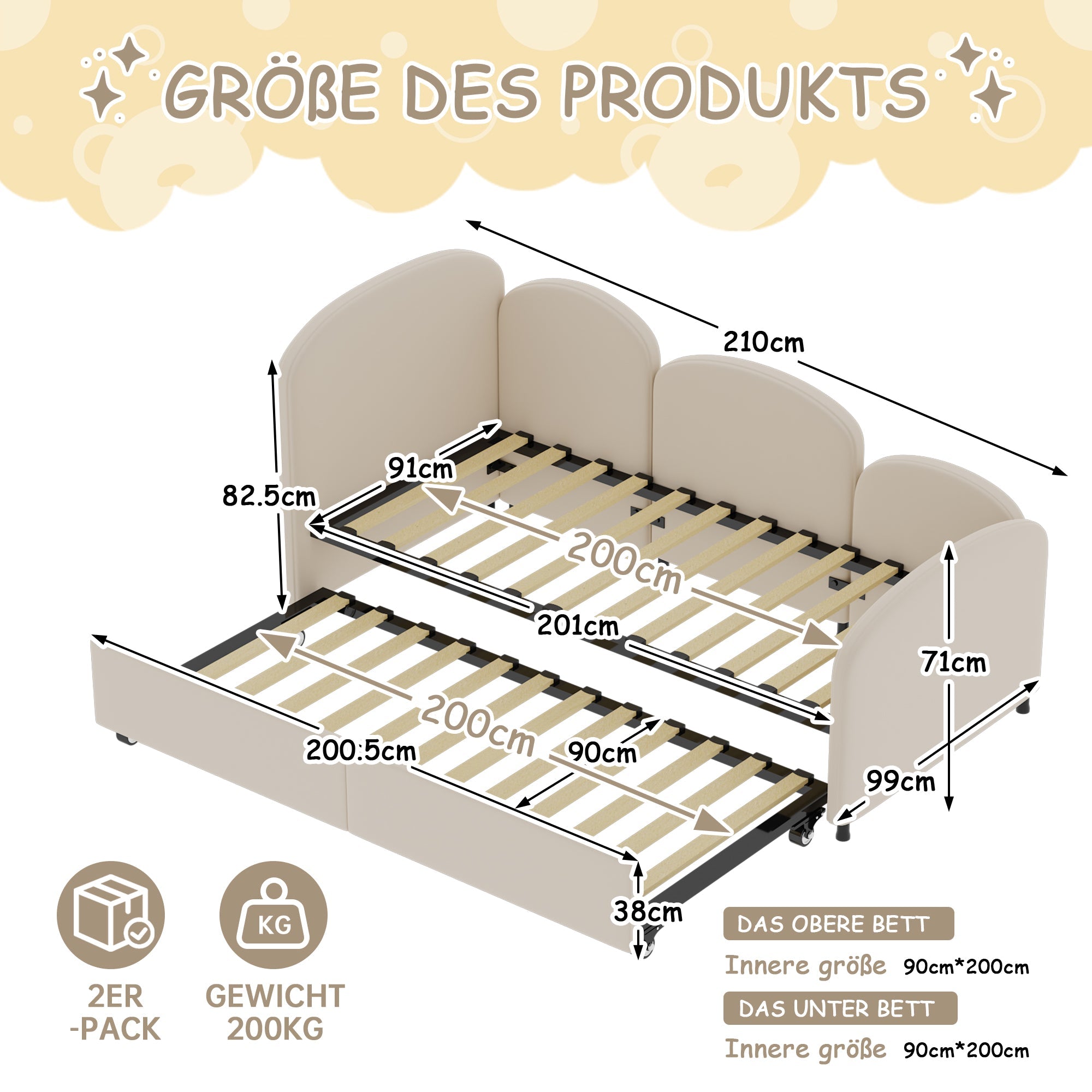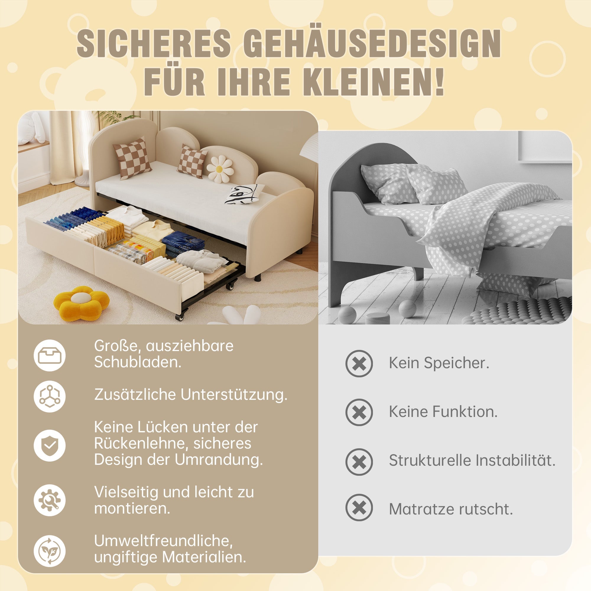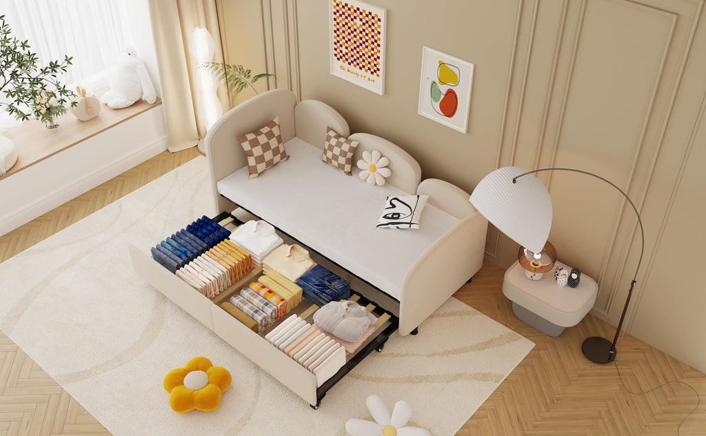 There is a large, pull-out drawer under the bed for easy storage of toys, bedding, and other daily necessities, keeping your room tidy.