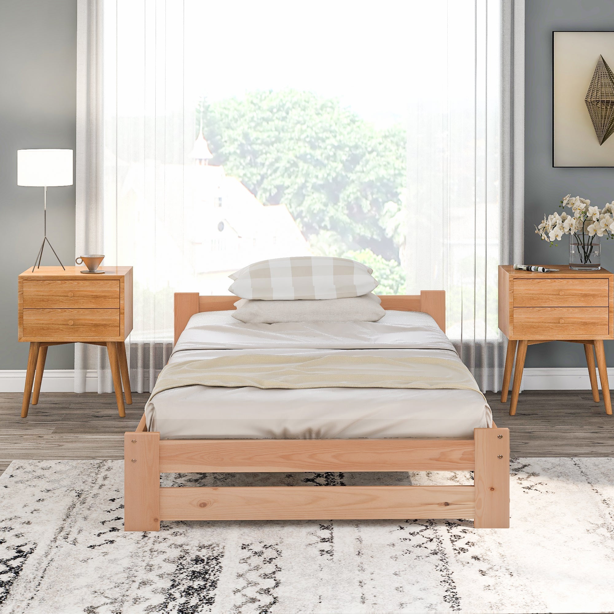 Features: The product is a natural color wooden bed with a pine frame and wood slatted material. It requires self-assembly and comes in one package. The country of origin is China.