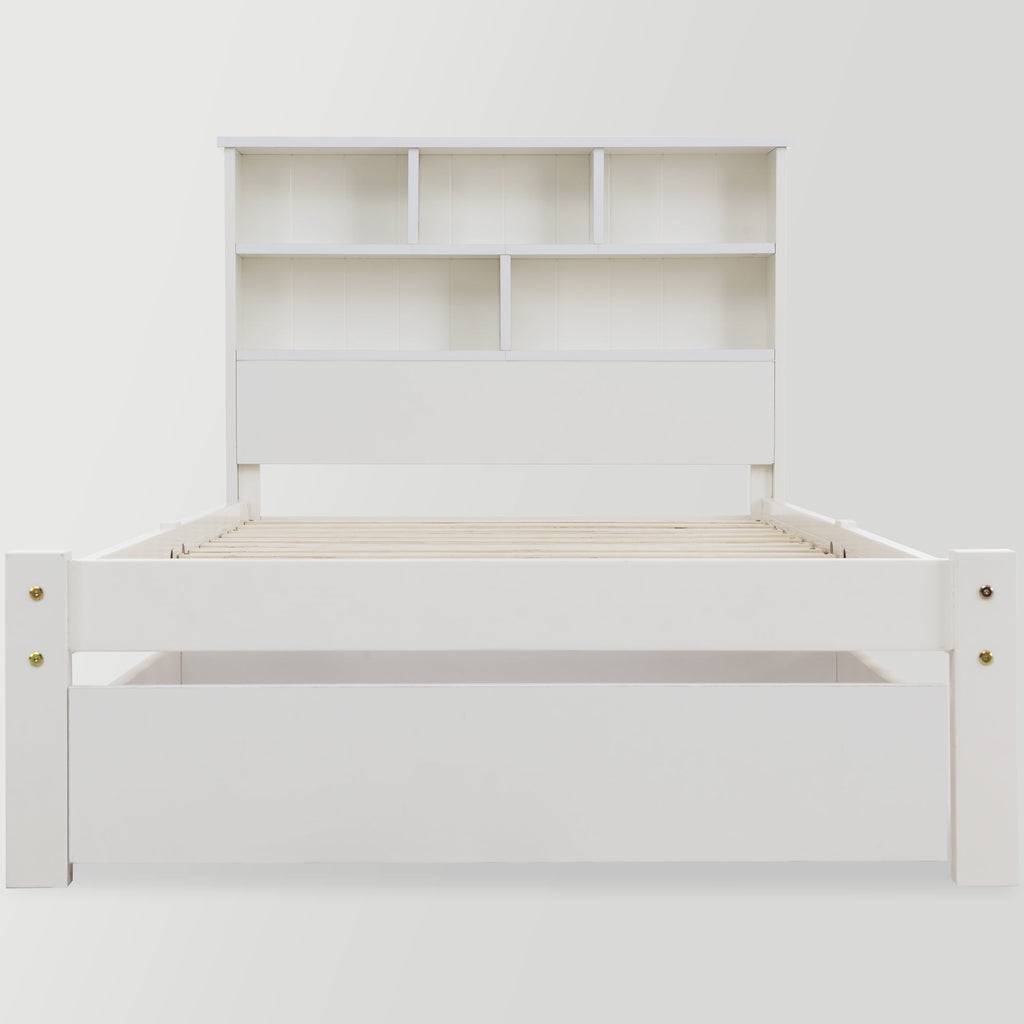 Solid Wood Single Bed with Drawers & Slatted Frame, Bookcase, White
