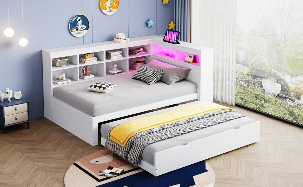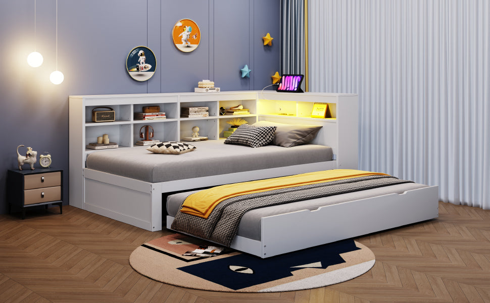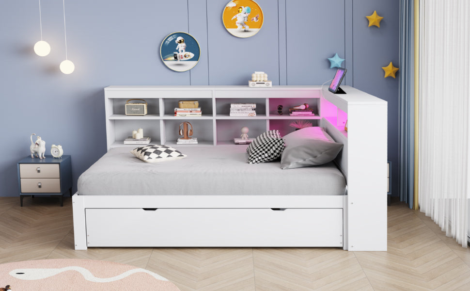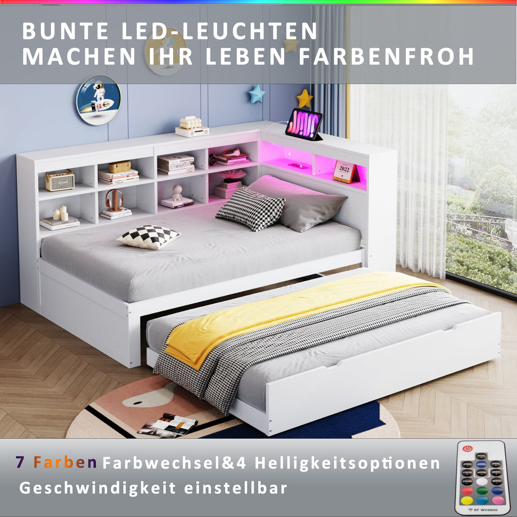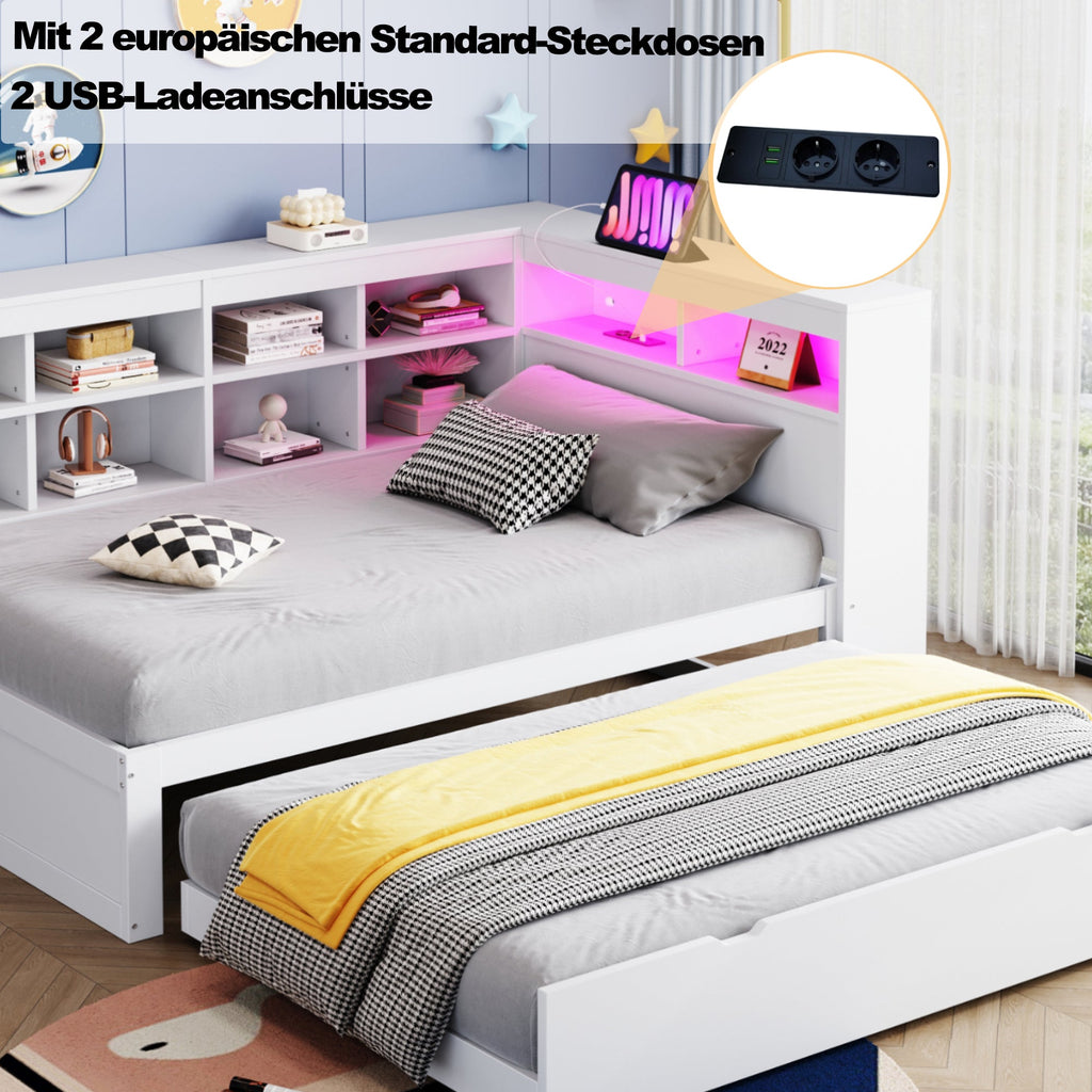 Solid Wood Sofa with Pull-Out Bed, USB & LED, White